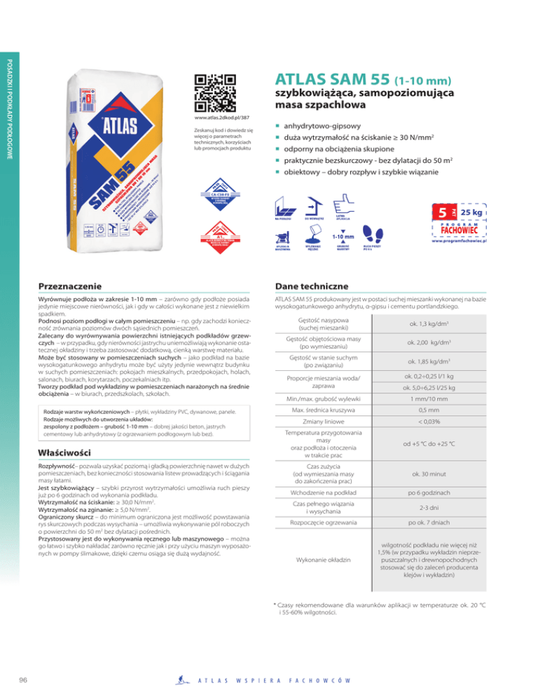 POSADZKI I PODKŁADY PODŁOGOWE AtLAS SAM 55 (1-10 mm) szybkowiążąca, samopoziomująca masa szpachlowa www.atlas.2dkod.pl/387 Zeskanuj kod i dowiedz się więcej o parametrach technicznych, korzyściach lub promocjach produktu anhydrytowo-gipsowy duża wytrzymałość na ściskanie ≥ 30 N/mm2 odporny na obciążenia skupione praktycznie bezskurczowy - bez dylatacji do 50 m2 obiektowy – dobry rozpływ i szybkie wiązanie APLIKACJA 5 25 kg Przeznaczenie Dane techniczne Wyrównuje podłoża w zakresie 1-10 mm – zarówno gdy podłoże posiada jedynie miejscowe nierówności, jak i gdy w całości wykonane jest z niewielkim spadkiem. Podnosi poziom podłogi w całym pomieszczeniu – np. gdy zachodzi konieczność zrównania poziomów dwóch sąsiednich pomieszczeń. Zalecany do wyrównywania powierzchni istniejących podkładów grzewczych – w przypadku, gdy nierówności jastrychu uniemożliwiają wykonanie ostatecznej okładziny i trzeba zastosować dodatkową, cienką warstwę materiału. Może być stosowany w pomieszczeniach suchych – jako podkład na bazie wysokogatunkowego anhydrytu może być użyty jedynie wewnątrz budynku w suchych pomieszczeniach: pokojach mieszkalnych, przedpokojach, holach, salonach, biurach, korytarzach, poczekalniach itp. Tworzy podkład pod wykładziny w pomieszczeniach narażonych na średnie obciążenia – w biurach, przedszkolach, szkołach. ATLAS SAM 55 produkowany jest w postaci suchej mieszanki wykonanej na bazie wysokogatunkowego anhydrytu, α-gipsu i cementu portlandzkiego. Rodzaje warstw wykończeniowych – płytki, wykładziny PVC, dywanowe, panele. Rodzaje możliwych do utworzenia układów: zespolony z podłożem – grubość 1-10 mm – dobrej jakości beton, jastrych cementowy lub anhydrytowy (z ogrzewaniem podłogowym lub bez). Właściwości Rozpływność– pozwala uzyskać poziomą i gładką powierzchnię nawet w dużych pomieszczeniach, bez konieczności stosowania listew prowadzących i ściągania masy łatami. Jest szybkowiążący – szybki przyrost wytrzymałości umożliwia ruch pieszy już po 6 godzinach od wykonania podkładu. Wytrzymałość na ściskanie: ≥ 30,0 N/mm2. Wytrzymałość na zginanie: ≥ 5,0 N/mm2. Ograniczony skurcz – do minimum ograniczona jest możliwość powstawania rys skurczowych podczas wysychania – umożliwia wykonywanie pól roboczych o powierzchni do 50 m2 bez dylatacji pośrednich. Przystosowany jest do wykonywania ręcznego lub maszynowego – można go łatwo i szybko nakładać zarówno ręcznie jak i przy użyciu maszyn wyposażonych w pompy ślimakowe, dzięki czemu osiąga się dużą wydajność. Gęstość nasypowa (suchej mieszanki) ok. 1,3 kg/dm3 Gęstość objętościowa masy (po wymieszaniu) ok. 2,00 kg/dm3 Gęstość w stanie suchym (po związaniu) ok. 1,85 kg/dm3 ok. 0,2÷0,25 l/1 kg Proporcje mieszania woda/ zaprawa ok. 5,0÷6,25 l/25 kg Min./max. grubość wylewki 1 mm/10 mm Max. średnica kruszywa 0,5 mm Zmiany liniowe < 0,03% Temperatura przygotowania masy oraz podłoża i otoczenia w trakcie prac od +5 °C do +25 °C Czas zużycia (od wymieszania masy do zakończenia prac) ok. 30 minut Wchodzenie na podkład po 6 godzinach Czas pełnego wiązania i wysychania 2-3 dni Rozpoczęcie ogrzewania po ok. 7 dniach Wykonanie okładzin wilgotność podkładu nie więcej niż 1,5% (w przypadku wykładzin nieprzepuszczalnych i drewnopochodnych stosować się do zaleceń producenta klejów i wykładzin) * Czasy rekomendowane dla warunków aplikacji w temperaturze ok. 20 °C i 55-60% wilgotności. 96 Wymagania techniczne Pielęgnacja 0767 PN-EN 13813:2003 (EN 13813:2012) Podkład podłogowy na bazie siarczanu wapnia CA-C30-F5 samopoziomujący, do stosowania wewnątrz w suchych pomieszczeniach Reakcja na ogień A1fl Wydzielanie substancji korozyjnych CA Prace wykończeniowe Prace okładzinowe, w zależności od warunków dojrzewania, wilgotności, rodzaju i przepuszczalności okładziny, można rozpocząć średnio po 2-3 dniach. Przed rozpoczęciem tego typu prac, wyschniętą powierzchnię jastrychu zaleca się zagruntować emulsją ATLAS UNI-GRUNT PLUS lub ATLAS UNI-GRUNT. Zużycie Wartość pH >7 Wytrzymałość na ściskanie ≥ 30,0 N/mm² Średnio zużywa się 18 kg zaprawy na 1 m2 i na każde 10 mm grubości warstwy. Wytrzymałość na zginanie ≥ 5,0 N/mm² Przepuszczalność wody pary wodnej, Izolacyjność akustyczna, Dźwiękochłonność, Opór cieplny, Odporność chemiczna Ważne informacje dodatkowe NPD Wyrób posiada Świadectwo z zakresu higieny radiacyjnej. Wykonywanie podkładu Przygotowanie podłoża Podłoże powinno być stabilne i odpowiednio mocne, a z uwagi na niebezpieczeństwo wypływania podkładu powinno mieć charakter wannowy. Wymagania dla podłoży: • podkłady cementowe – wiek powyżej 28 dni, • beton - wiek powyżej 3 miesięcy, • podkłady anhydrytowe – przeszlifowane mechanicznie i odkurzone. Nierówności podłoża (zagłębienia i ubytki) należy zagruntować emulsją ATLAS UNI-GRUNT lub masą ATLAS GRUNTO-PLAST, wyrównać zaprawą ATLAS ZW 330. Suche, naprawione podłoże należy odkurzyć, starannie zagruntować emulsją ATLAS UNI-GRUNT lub ATLAS UNI-GRUNT PLUS (podłoża chłonne) lub masą ATLAS GRUNTO-PLAST (podłoża niechłonne) i pozostawić do wyschnięcia. Wszystkie stykające się z podkładem elementy stalowe powinny być zabezpieczone antykorozyjnie. Dylatacje Podkład oddzielić od ścian i innych elementów PROFILEM DYLATACYJNYM ATLAS. Dylatacje pośrednie nie są konieczne na powierzchniach do 50 m² i takich, których przekątna nie przekracza 10 m. Wszelkie dylatacje konstrukcyjne warstw poprzednich należy przenieść na podkład. Dylatacje skurczowe należy wykonać wokół słupów nośnych oraz w progach pomieszczeń. Przygotowanie masy Wykonywanie maszynowe – suchą mieszankę wsypać do kosza w agregacie mieszająco-pompującym i ustawić stały poziom dozowanej wody, pozwalający osiągnąć prawi