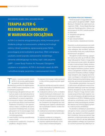 Nowoczesne metody fizjoterapii mgr AGNIESZKA KSIĄŻEK-CZEKAJ, mgr MAREK WIECHEĆ Terapia Alter-G reedukacja lokomocji w warunkach odciążenia ALTER-G to bieżnia antygrawitacyjna, której innowacyjność działania polega na zastosowaniu unikalnej technologii różnicy ciśnień powietrza, opracowanej przez NASA, powodującej przeciwdziałanie grawitacji. Efekt odciążający uzyskany został poprzez zastosowanie dodatniego ciśnienia oddziałującego na dolną część ciała pacjenta (LBPP – Lower Body Positive Air Pressure). Odciążenie uzyskane w urządzeniu ALTER-G dochodzi nawet do 80% i umożliwia terapię pacjentów z zastosowaniem bieżni. T erapia z zastosowaniem bieżni ALTER-G ma na celu ogólną poprawę zdolności pacjentów do chodzenia/lokomocji pomimo ich niepełnosprawności. ALTER-G można wykorzystać, w celu umożliwienia pacjentom: stopniowego obciążania kończyn dolnych po urazie w celu stymulowania naturalnych pro-cesów regeneracyjnych zachodzących w naszym organizmie, zmniejszenia ciężaru ciała działającego na kończyny dolne z zachowaniem możliwości lo-komocji, w tym spacerowania w miejscu i chodzenia, aby zachować proces mineralizacji kości, w sytuacji, gdy pacjent nie ma wystarczająco dużo siły, aby stać lub chodzić w warunkach normalnej grawitacji, nauki, korekcji i treningu prawidłowego wzorca chodu, zwiększenia wydajności chodzenia (prędkości i długości kroku), 16 poprawy równowagi i reakcji postawy w celu ochrony pacjenta przed upadkiem, poprawy koordynacji poprzez wykonywanie różnorodnych podskoków (przy predkości bieżni 1,6–4), zwiększenia zakresu ruchu w obrębie stawów biodrowych, kolanowych i skokowych (np. wykonywanie przysiadów z odciążeniem wynoszącym ok. 20%, ćwiczeń na poziomie aerobowym (szybkie chodzenie lub bieganie) bez nadmiernego prze-ciążania uszkodzonych lub zwyrodniałych stawów i struktur (kolana i biodra), zwiększenia wytrzymałości kardiologiczno-pulmonologicznej i mięśniowo-szkieletowej, poprawy wydajności w bieganiu, wzmocnienia siły kończyn dolnych, poprawy ogólnej koordynacji ruchowej w trakcie chodzenia/biegania. Praktyczna fizjoterapia & rehabilitacja Obciążenie podczas treningu Ponieważ pacjenci mogą tolerować ćwiczenia z pełnym obciążeniem (WBAT – Weight Bearing As Tolerated) lub częściowym obciążeniem (PWB – Partial Weight Bearing), większość fizjoterapeutów i lekarzy wykorzystujących ALTER-G określa parametry dotyczące: odciążania (odciążenia), prędkości bieżni, kąta uniesienia bieżni, czasu trwania i częstotliwość leczenia. Parametry są dostosowywane do możliwości funkcjonalnych pacjenta poddawanego zabiegowi, aby umożliwić optymalną mechanikę chodu przy maksymalnym komfortowym obciążeniu. Obciążenie w trakcie treningu z pacjentem zazwyczaj waha się od 50% do 100% wagi ciała pacjenta. Pacjenci mogą zwiększyć tolerowane przez siebie obciążenie w trakcie trwania terapii. Należy dostosować odciążenie zgodnie z wymaganiami, aby osiągnąć bezbolesny poziom usprawniania z odciążeniem na bieżni. Zaleca się stosowanie minimalnej wielkości niezbędnego odciążenia, aby osiągnąć pewne korzyści wynikające z obciążenia kończyn dolnych (poprawiona propriocepcja, zwiększona siła, zachowanie mineralizacji kości). W przypadku pacjentów ćwiczących z częściowym obciążeniem można przeprowadzić kalibrację nawet bez równego ważenia obciążenia na obu kończynach dolnych. Pacjenci mogą również wykorzystać poręcze bieżni jako wsparcie i pomoc przy zmniejszaniu obciążenia podczas wchodzenia na ALTER-G. Dokładny pomiar odciążenia umożliwiany przez ALTER-G zapewnia ścisłe przestrzeganie protokołów lekarza oraz ochronę gojącej się tkanki w trakcie procesu rehabilitacji. Po określeniu dokładnych parametrów odciążenia można ustanowić prędkość bieżni, aby zapewnić komfortową prędkość chodzenia. Zazwyczaj wartość tego parametru w trakcie poruszania się po bieżni wynosi ok. 4,8 km/h, tak więc jakikolwiek zakres prędkości wahający się w granicach 3,2–6,4 km/h powinien być właściwym ce- Nowoczesne metody fizjoterapii lem ustanowionym na podstawie wzrostu pacjenta oraz długości normalnego/długiego kroku. Celem jest tutaj wybór prędkości, która umożliwia uzyskanie optymalnych schematów chodu oraz minimalnych objawów. Przy regulacji ustawień należy wziąć pod uwagę budowę morfologiczną pacjenta. Typowe parametry w przypadku ćwiczeń na ergometrze rowerowym, zwiększające zakres ruchu i zmniejszające obrzęk, zazwyczaj rozpoczynają się od 5-minutowej sesji. W oparciu o powyższe zalecenia należałoby rozpocząć trening na ALTER-G od 5–10 minut we wczesnych etapach rekon-walescencji, jeśli tylko objawy nie zwiększą się w trakcie sesji treningowej lub po niej. Należy sta-rać się zwiększyć obciążenie lub prędkość chodzenia, aby wyeliminować objawy, jeśli jeszcze nie ustąpiły. Korzystać z bieżni ALTER-G należy, gdy pacjent jest w stanie osiągnąć bezbólowy po-ziom ćwiczeń z odciążeniami na bieżni antygrawitacyjnej ALTER-G. Częstotliwość sesji fizjoterapeutycznych zalecana przez lekarzy w stanach pozabiegowych i pourazowych zazwyczaj rozpoczyna się od dwóch (BIW – twice a week) lub trzech (TIW – Three Times in a Week) treningów tygdniowo. W związku z możliwym odciążeniem w trakcie terapii na bieżni ALTER-G częstotliwość można początkowo zwiększyć, gdyż kontrola objawów i uzyskany zakres ruchu stanowią najważniejszy aspekt usprawniania w początkowej fazie leczenia. Treningi są zazwyczaj zaplanowane w określonych odstępach czasu, z zachowaniem właściwego czasu na odpoczynek oraz regenerację między sesjami. Stosowanie ALTER-G może być odpowiednio dostosowane, zgodnie z zaleceniami lekarza lub fizjoterapeuty. Fazy treningu Trening na bieżni antygrawitacyjnej u wszystkich pacjentów tworz