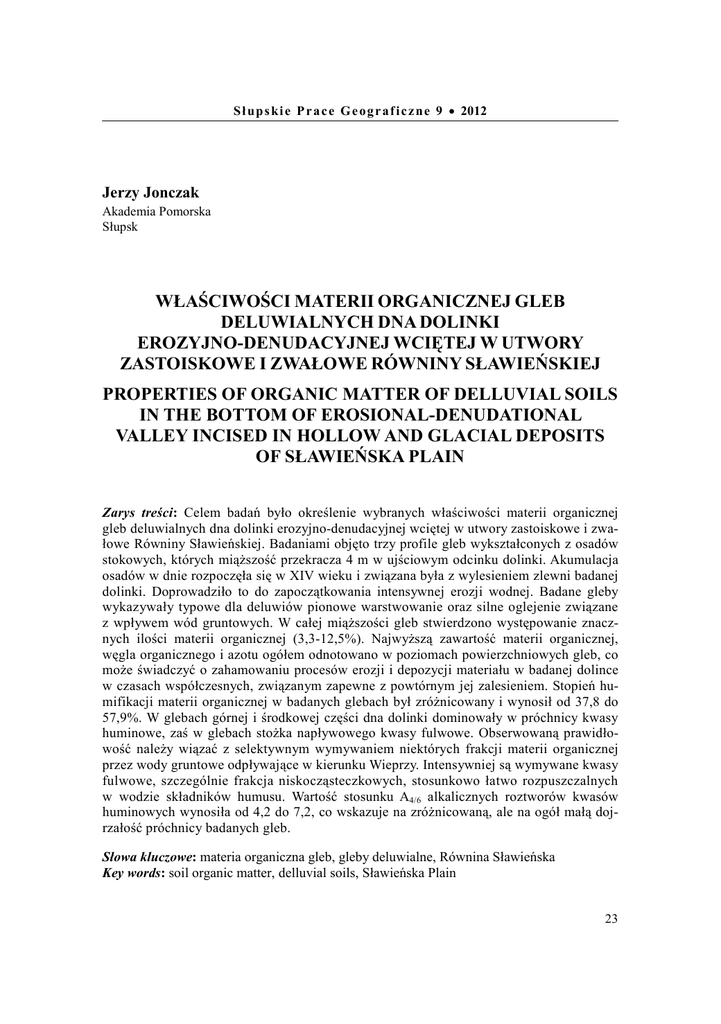 S ł u p s ki e P r a c e G e o g r a f i c z ne 9 • 2012 Jerzy Jonczak Akademia Pomorska Słupsk WŁAŚCIWOŚCI MATERII ORGANICZNEJ GLEB DELUWIALNYCH DNA DOLINKI EROZYJNO-DENUDACYJNEJ WCIĘTEJ W UTWORY ZASTOISKOWE I ZWAŁOWE RÓWNINY SŁAWIEŃSKIEJ PROPERTIES OF ORGANIC MATTER OF DELLUVIAL SOILS IN THE BOTTOM OF EROSIONAL-DENUDATIONAL VALLEY INCISED IN HOLLOW AND GLACIAL DEPOSITS OF SŁAWIEŃSKA PLAIN Zarys treści: Celem badań było określenie wybranych właściwości materii organicznej gleb deluwialnych dna dolinki erozyjno-denudacyjnej wciętej w utwory zastoiskowe i zwałowe Równiny Sławieńskiej. Badaniami objęto trzy profile gleb wykształconych z osadów stokowych, których miąższość przekracza 4 m w ujściowym odcinku dolinki. Akumulacja osadów w dnie rozpoczęła się w XIV wieku i związana była z wylesieniem zlewni badanej dolinki. Doprowadziło to do zapoczątkowania intensywnej erozji wodnej. Badane gleby wykazywały typowe dla deluwiów pionowe warstwowanie oraz silne oglejenie związane z wpływem wód gruntowych. W całej miąższości gleb stwierdzono występowanie znacznych ilości materii organicznej (3,3-12,5%). Najwyższą zawartość materii organicznej, węgla organicznego i azotu ogółem odnotowano w poziomach powierzchniowych gleb, co może świadczyć o zahamowaniu procesów erozji i depozycji materiału w badanej dolince w czasach współczesnych, związanym zapewne z powtórnym jej zalesieniem. Stopień humifikacji materii organicznej w badanych glebach był zróżnicowany i wynosił od 37,8 do 57,9%. W glebach górnej i środkowej części dna dolinki dominowały w próchnicy kwasy huminowe, zaś w glebach stożka napływowego kwasy fulwowe. Obserwowaną prawidłowość należy wiązać z selektywnym wymywaniem niektórych frakcji materii organicznej przez wody gruntowe odpływające w kierunku Wieprzy. Intensywniej są wymywane kwasy fulwowe, szczególnie frakcja niskocząsteczkowych, stosunkowo łatwo rozpuszczalnych w wodzie składników humusu. Wartość stosunku A4/6 alkalicznych roztworów kwasów huminowych wynosiła od 4,2 do 7,2, co wskazuje na zróżnicowaną, ale na ogół małą dojrzałość próchnicy badanych gleb. Słowa kluczowe: materia organiczna gleb, gleby deluwialne, Równina Sławieńska Key words: soil organic matter, delluvial soils, Sławieńska Plain 23 Wstęp Materia organiczna wpływa na wiele właściwości fizycznych i chemicznych gleb, a także na kierunek i intensywność zachodzących w nich procesów biochemicznych (np. Tobiašová 2011). O zawartości oraz właściwościach glebowej materii organicznej decyduje kompleks czynników środowiskowych, w szczególności skład gatunkowy zbiorowisk roślinnych i warunki siedliska, oraz charakter i stopień nasilenia antropopresji (Masciandaro i in. 1998, Pulleman i in. 2000, Szombathová i in. 2004, Czarnecki, Jonczak 2004, Gonet, Dębska 2007, Grandy, Robertson 2007, Szombathová, Simansky 2007, Simansky 2007, Dębska i in. 2009, Gonet i in. 2009). Humus glebowy jako produkt biochemicznych przemian szczątków roślinnych jest mieszaniną związków chemicznych o zróżnicowanych masach cząsteczkowych, w skład których wchodzą w różnych proporcjach struktury alifatyczne i aromatyczne. Bardzo ważną rolę ekologiczną odgrywają rozpuszczalne frakcje materii organicznej, które mogą być przemieszczane wraz z filtrującymi wodami w głąb gleby, stanowiąc podstawę niektórych procesów glebotwórczych (Yano i in. 2004, Jonczak, Parzych 2012, Jonczak 2012), albo wypłukiwane poza glebę, wpływając na jakość wód powierzchniowych (Kalbitz i in. 2000, Norström i in. 2010). Podstawowe źródło rozpuszczalnej materii organicznej w ekosystemach leśnych stanowi ektopróchnica (Solinger i in. 2001, Yano i in. 2004, Jonczak, Parzych 2012), zaś w agroekosystemach nawozy organiczne (Janowiak i in. 2001). Intensywność wypłukiwania materii organicznej z poziomów organicznych i próchnicznych gleb jest uwarunkowana tempem mineralizacji szczątków organicznych, właściwościami gleb, warunkami klimatycznymi i gospodarką człowieka (Christ, David 1996, Andersson i in. 2000, Dawson i in. 2008, Berger i in. 2009, Remeš, Kulhavý 2009). Zasoby i właściwości próchnicy glebowej w ekosystemach naturalnych odzwierciedlają charakter dawnych zbiorowisk roślinnych oraz warunki siedliska, w którym następowała jej akumulacja (Grandy, Robertson 2007). Celem badań było określenie wybranych właściwości materii organicznej gleb deluwialnych dna doliny erozyjno-denudacyjnej wciętej w utwory zastoiskowe i zwałowe Równiny Sławieńskiej. Materiały i metody Badania przeprowadzono w dolince erozyjno-denudacyjnej położonej na obszarze Równiny Sławieńskiej w odległości kilkuset metrów na zachód od miejscowości Mazów (ryc. 1). Długość dolinki wynosiła około 200 m, a maksymalna współczesna głębokość przekraczała 10 m. Dolina jest wycięta w pylasto-ilastych plejstoceńskich utworach zastoiskowych o miąższości około 5 m, zalegających na silnie zbitej, szarej glinie zwałowej zawierającej około 5% węglanów. Na granicy utworów zastoiskowych i zwałowych występują przewarstwienia piasków, które stanowią warstwę wodonośną. Wysiąkająca z niej wzdłuż stoków dolinki z niewielką intensywnością woda gruntowa powoduje zabagnienie jej dna i silne oglejenie gleb. Miąższość osadów deluwialnych w dnie dolinki współcześnie przekracza 4 m, a ich spąg został wydatowany na 590±55 24 lat BP (Tylman i in. 2011). Wypełnienie dna dolinki nastąpiło w średniowieczu, najprawdopodobniej w efekcie wylesienia zlewni. Obecnie dolinka jest porośnięta bukiem w zróżnicowanym wieku, a jej zlewnia użytkowana rolniczo. Na przełomie XIX i XX wieku oraz w roku 1966 przeprowadzono tu prace melioracyjne. Woda drenarska uchodzi w dwóch punktach w górnej części dolinki, a jej odpływ ma charakter okresowy. Ryc. 1. Położenie dol