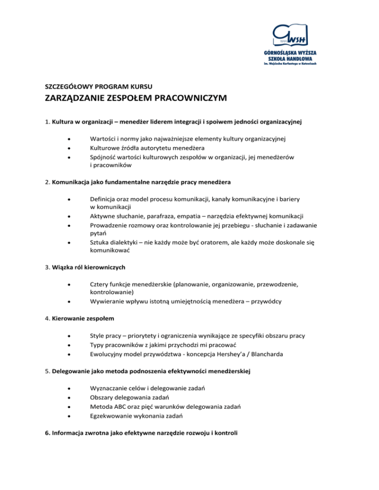 SZCZEGÓŁOWY PROGRAM KURSU ZARZĄDZANIE ZESPOŁEM PRACOWNICZYM 1. Kultura w organizacji – menedżer liderem integracji i spoiwem jedności organizacyjnej Wartości i normy jako najważniejsze elementy kultury organizacyjnej Kulturowe źródła autorytetu menedżera Spójność wartości kulturowych zespołów w organizacji, jej menedżerów i pracowników 2. Komunikacja jako fundamentalne narzędzie pracy menedżera Definicja oraz model procesu komunikacji, kanały komunikacyjne i bariery w komunikacji Aktywne słuchanie, parafraza, empatia – narzędzia efektywnej komunikacji Prowadzenie rozmowy oraz kontrolowanie jej przebiegu - słuchanie i zadawanie pytań Sztuka dialektyki – nie każdy może być oratorem, ale każdy może doskonale się komunikować 3. Wiązka ról kierowniczych Cztery funkcje menedżerskie (planowanie, organizowanie, przewodzenie, kontrolowanie) Wywieranie wpływu istotną umiejętnością menedżera – przywódcy 4. Kierowanie zespołem Style pracy – priorytety i ograniczenia wynikające ze specyfiki obszaru pracy Typy pracowników z jakimi przychodzi mi pracować Ewolucyjny model przywództwa - koncepcja Hershey’a / Blancharda 5. Delegowanie jako metoda podnoszenia efektywności menedżerskiej Wyznaczanie celów i delegowanie zadań Obszary delegowania zadań Metoda ABC oraz pięć warunków delegowania zadań Egzekwowanie wykonania zadań 6. Informacja zwrotna jako efektywne narzędzie rozwoju i kontroli Udzielenie informacji zwrotnej Przekazywanie „złych” wiadomości, chwalenie i docenianie pracowników Wzmacnianie zaangażowania i samodzielności pracowników 7. Przywództwo w organizacji Różnica pomiędzy zarządzaniem a przywództwem – jak stać się liderem? Kompetencje interpersonalne konieczne do realizacji zadań związanych z funkcjonowaniem w roli lidera Określenie indywidualnego zakresu zadań związanych z funkcjonowaniem w roli lidera Osobista analiza SWOT a pożądane kompetencje lidera 8. Przywództwo a motywowanie i angażowanie pracowników do efektywnej pracy Wpływ pozytywnego myślenia oraz satysfakcja z pracy a efektywność zawodowa Co motywuje moich pracowników? Specyficzne uwarunkowania psychofizyczne liderów Typologia pracowników ze względu na typy osobowości - teoria Williama Marstona