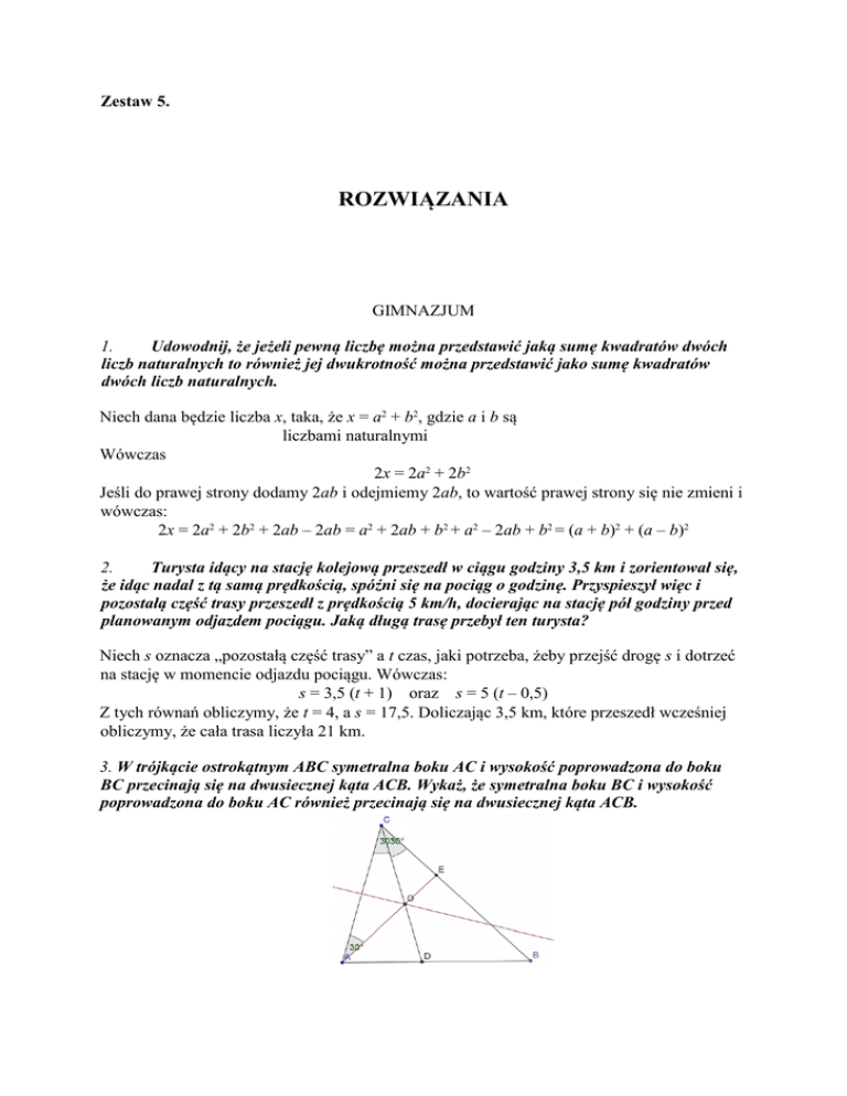 Zestaw 5. ROZWIĄZANIA GIMNAZJUM 1. Udowodnij, że jeżeli pewną liczbę można przedstawić jaką sumę kwadratów dwóch liczb naturalnych to również jej dwukrotność można przedstawić jako sumę kwadratów dwóch liczb naturalnych. Niech dana będzie liczba x, taka, że x = a2 + b2, gdzie a i b są liczbami naturalnymi Wówczas 2x = 2a2 + 2b2 Jeśli do prawej strony dodamy 2ab i odejmiemy 2ab, to wartość prawej strony się nie zmieni i wówczas: 2x = 2a2 + 2b2 + 2ab – 2ab = a2 + 2ab + b2 + a2 – 2ab + b2 = (a + b)2 + (a – b)2 2. Turysta idący na stację kolejową przeszedł w ciągu godziny 3,5 km i zorientował się, że idąc nadal z tą samą prędkością, spóźni się na pociąg o godzinę. Przyspieszył więc i pozostałą część trasy przeszedł z prędkością 5 km/h, docierając na stację pół godziny przed planowanym odjazdem pociągu. Jaką długą trasę przebył ten turysta? Niech s oznacza „pozostałą część trasy” a t czas, jaki potrzeba, żeby przejść drogę s i dotrzeć na stację w momencie odjazdu pociągu. Wówczas: s = 3,5 (t + 1) oraz s = 5 (t – 0,5) Z tych równań obliczymy, że t = 4, a s = 17,5. Doliczając 3,5 km, które przeszedł wcześniej obliczymy, że cała trasa liczyła 21 km. 3. W trójkącie ostrokątnym ABC symetralna boku AC i wysokość poprowadzona do boku BC przecinają się na dwusiecznej kąta ACB. Wykaż, że symetralna boku BC i wysokość poprowadzona do boku AC również przecinają się na dwusiecznej kąta ACB. Kąty ACD i DCB są równe, bo CD jest dwusieczną, kąty DCA i CAE są równe, bo trójkąt AOC jest równoramienny (punkt O leży na symetralnej odcinka AC). Suma trzech równych kątów wynosi 90° (trójkąt AEC jest prostokątny), więc każdy z nich ma 30°, a kąt ACB ma 60°. Rysujemy teraz symetralną boku BC i i wysokość poprowadzoną na bok AC. Kąt CBF ma 30°, bo trójkąt FBC jest trójkątem prostokątnym z kątem 60°. Kąt SCB ma 30°, bo trójkąt SBC jest równoramienny (punkt S leży na symetralnej boku BC), więc punkt S leży na dwusiecznej kąta ACB. Niektórzy z was w swoim rozumowaniu w ukryty sposób korzystali z faktu, że punkt przecięcia symetralnej boku BC i wysokości opuszczonej na bok AC przecinają się na dwusiecznej kąta ACB, a to dopiero trzeba było udowodnić.