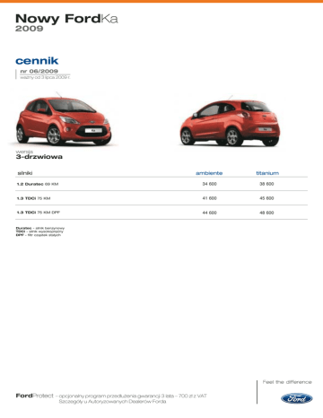 Nowy FordKa 2009 cennik nr 06/2009 wa˝ny od 3 lipca 2009 r. wersja 3-drzwiowa silniki ambiente titanium 1.2 Duratec 69 KM 34 600 38 600 1.3 TDCi 75 KM 41 600 45 600 1.3 TDCi 75 KM DPF 44 600 48 600 Duratec - silnik benzynowy TDCi - silnik wysokopr´˝ny DPF - filtr czàstek sta∏ych FordProtect – opcjonalny program przed∏u˝enia gwarancji 3 lata – 700 z∏ z VAT Szczegó∏y u Autoryzowanych Dealerów Forda Nowy FordKa 2009 wyposa˝enie bezpieczeƒstwo iente amb ium titan s s s s 800 1 500 2 000 p s s 800 1 500 2 000 s s p 700 700 4 000 – – 200 40 1 200 s s 700 700 s 900 400/p s 40 1 200 s p s s 500 500 1 300 1 950 500 500 1 300 1 950 900 900 – 1 900 1 350 1 350 1 350 1 350 1 350 1 350 100 200 300 100 200 300 300 300 400 400 750 750 750 750 750 750 750 750 Uk∏ad ABS Âwiat∏a awaryjne – automatyczny w∏àcznik uruchamiajàcy wszystkie kierunkowskazy w chwili nag∏ego hamowania Poduszki powietrzne – poduszki czo∏owe kierowcy i pasa˝era z przodu Boczne poduszki powietrzne Kurtyny powietrzne + boczne poduszki powietrzne Uk∏ad stabilizacji toru jazdy ESP Przednie Êwiat∏a przeciwmgielne komfort Elektryczny – uk∏ad wspomagania kierownicy (EPAS) Elektrycznie sterowane szyby przednich drzwi Podgrzewana przednia szyba Ogrzewane fotele kierowcy i pasa˝era Klimatyzacja – manualna Klimatyzacja z automatycznà regulacjà temperatury Kierownica pokryta skórà Dywaniki welurowe z przodu i z ty∏u Pakiet dla palàcych Pilot parkowania – ty∏ zabezpieczenia Elektroniczny immobilizer Centralny zamek stylizacja Tylny spoiler Lakier niemetalizowany Crystal White Lakier metalizowany Lakier specjalny Piste, Blush systemy audio i nawigacji System audio wersja podstawowa (radioodtwarzacz p∏yt CD i plików MP3, z∏àcze AUX do pod∏àczania zewn´trznych odtwarzaczy, 6 g∏oÊników) System audio wersja rozbudowana (radioodtwarzacz p∏yt CD i plików MP3, z∏àcze AUX do pod∏àczania zewn´trznych odtwarzaczy, 6 g∏oÊników, subwoofer i wzmacniacz) Zestaw g∏oÊnomówiàcy Bluetooth® z funkcjà sterowania g∏osem j. niemiecki, gniazdo USB (wymaga zamówienia z systemem audio) Zestaw g∏oÊnomówiàcy Bluetooth® z funkcjà sterowania g∏osem j. angielski, gniazdo USB (wymaga zamówienia z systemem audio) Zestaw g∏oÊnomówiàcy Bluetooth® z funkcjà sterowania g∏osem j. polski, gniazdo USB (wymaga zamówienia z systemem audio) elementy funkcjonalne Ko∏o zapasowe dojazdowe Uniwersalna siatka na drobiazgi Uchwyt do nawigacji przenoÊnej pakiety wyposa˝enia dodatkowego Pakiet stylizacji z elementami chromowanymi (klamki drzwi, uchwyt drzwi ty∏u nadwozia i koƒcówka rury wydechowej wykoƒczone chromem) Pakiet wykoƒczenia wn´trza (oryginalny uchwyt dêwigni zmiany biegów z mieszkiem ze skóry, oryginalna oprawa dêwigni hamulca r´cznego z mieszkiem ze skóry, nak∏adki progowe ze stali nierdzewnej z logo „Ka”) Pakiet zwi´kszajàcy uniwersalnoÊç foteli (fotel kierowcy z regulacjà w 4 kierunkach (do przodu–do ty∏u / w gór´– w dó∏), fotel kierowcy z pochylanym oparciem, u∏atwiajacym zajmowanie miejsc z ty∏u, funkcja zapami´tywania ustawieƒ fotela kierowcy, schowek pod fotelem pasa˝era, 2 zag∏ówki z ty∏u, tylna kanapa dzielona symetrycznie (50:50), wyposa˝ona w mocowania – ISOFIX, kieszenie na mapy na oparciach fotela kierowcy i pasa˝era) Pakiet stylizacji nadwozia „Orange” (oryginalny kszta∏t wlotu powietrza w przednim zderzaku z kolorowà ramkà, lakierowana górna cz´Êç obudowy bocznych lusterek i chromowana koƒcówka rury wydechowej (tylko wraz z aluminiowymi obr´czami kó∏) Pakiet stylizacji nadwozia „Sunrise” (oryginalny kszta∏t wlotu powietrza w przednim zderzaku z kolorowà ramkà, lakierowana górna cz´Êç obudowy bocznych lusterek i chromowana koƒcówka rury wydechowej (tylko wraz z aluminiowymi obr´czami kó∏) Pakiet stylizacji nadwozia „Piste” (oryginalny kszta∏t wlotu powietrza w przednim zderzaku z kolorowà ramkà, lakierowana górna cz´Êç obudowy bocznych lusterek i chromowana koƒcówka rury wydechowej (tylko wraz z aluminiowymi obr´czami kó∏) s – wyposa˝enie standardowe – – opcja niedost´pna p – opcja dost´pna tylko w pakiecie Nowy FordKa 2009 wyposa˝enie pakiety wyposa˝enia dodatkowego iente amb Pakiet stylizacji nadwozia „Jump” (oryginalny kszta∏t wlotu powietrza w przednim zderzaku z kolorowà ramkà, lakierowana górna cz´Êç obudowy bocznych lusterek i chromowana koƒcówka rury wydechowej (tylko wraz z aluminiowymi obr´czami kó∏) Pakiet stylizacyjny 14” (obr´cze aluminiowe 14” i przednie Êwiat∏a przeciwmgielne) Pakiet stylizacyjny 15” (obr´cze alumniowe 15”, wzór 13–ramienny i przyciemniane szyby tylnej cz´Êci nadwozia) Pakiet stylizacyjny 15” – Silver (obr´cze aluminiowe 15” Silver, wzór 7x2–ramienny i przyciemniane szyby tylnej cz´Êci nadwozia) Pakiet stylizacyjny 15” – White (obr´cze aluminiowe 15” White, wzór 7x2–ramienny i przyciemniane szyby tylnej cz´Êci nadwozia) Pakiet stylizacyjny 16” (obr´cze aluminiowe 16” i przyciemniane szyby tylnej cz´Êci nadwozia) Pakiet wzbogacajacy wersj´ Ambiente (klamki drzwi i uchwyt drzwi ty∏u nadwozia lakierowane w kolorze nadwozia, lusterka boczne sterowane i podgrzewane elektrycznie, w obudowach w kolorze nadwozia, elektrycznie sterowane szyby w przednich drzwiach (po stronie kierowcy szyba podnoszona i opuszczana jednym dotkni´ciem przycisku, po stronie pasa˝era szyba opuszczana jednym dotkni´ciem przycisku), centralny zamek sterowany pilotem, (pilot sk∏adany)) Indywidualny pakiet wykoƒczenia wn´trza „Digital” (pokrycia foteli i wykoƒczenia wewn. wyk∏adzin drzwi z oryginalnymi motywami „Digital”, lakierowane elementy wykoƒczenia wn´trza (wewn. uchwyty drzwi, obramowanie postumentu dêwigni zmiany biegów, obramowania centralnej konsoli, obramowania dysz nawiewu, obramowanie zespo∏u wskaêników), kolorowe ˝y∏ki