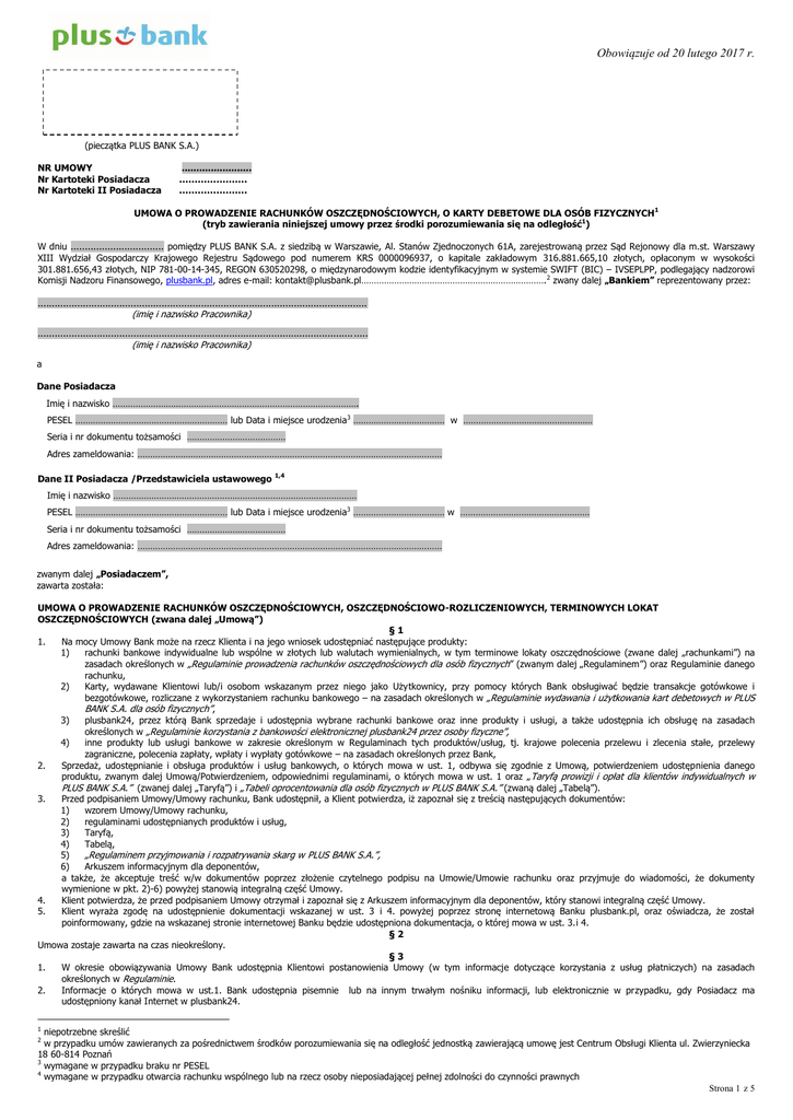 Obowiązuje od 20 lutego 2017 r. (pieczątka PLUS BANK S.A.) NR UMOWY Nr Kartoteki Posiadacza Nr Kartoteki II Posiadacza ........................ …………………. …………………. UMOWA O PROWADZENIE RACHUNKÓW OSZCZĘDNOŚCIOWYCH, O KARTY DEBETOWE DLA OSÓB FIZYCZNYCH1 (tryb zawierania niniejszej umowy przez środki porozumiewania się na odległość1) W dniu ................................. pomiędzy PLUS BANK S.A. z siedzibą w Warszawie, Al. Stanów Zjednoczonych 61A, zarejestrowaną przez Sąd Rejonowy dla m.st. Warszawy XIII Wydział Gospodarczy Krajowego Rejestru Sądowego pod numerem KRS 0000096937, o kapitale zakładowym 316.881.665,10 złotych, opłaconym w wysokości 301.881.656,43 złotych, NIP 781-00-14-345, REGON 630520298, o międzynarodowym kodzie identyfikacyjnym w systemie SWIFT (BIC) – IVSEPLPP, podlegający nadzorowi Komisji Nadzoru Finansowego, plusbank.pl, adres e-mail: [email protected]………………………………………………………………. 2 zwany dalej „Bankiem” reprezentowany przez: ..................................................................................................................... (imię i nazwisko Pracownika) ................................................................................................................ ..... (imię i nazwisko Pracownika) a Dane Posiadacza Imię i nazwisko ……………………………………………………………………………………. PESEL …………………………………………………… lub Data i miejsce urodzenia3 ……………………………… w …………………………………………… Seria i nr dokumentu tożsamości ………………………………… Adres zameldowania: ………………………………………………………………………………………………………… Dane II Posiadacza /Przedstawiciela ustawowego 1,4 Imię i nazwisko …………………………………………………………………………………… PESEL …………………………………………………… lub Data i miejsce urodzenia3 ……………………………… w …………………………………………… Seria i nr dokumentu tożsamości ………………………………… Adres zameldowania: ………………………………………………………………………………………………………… zwanym dalej „Posiadaczem”, zawarta została: UMOWA O PROWADZENIE RACHUNKÓW OSZCZĘDNOŚCIOWYCH, OSZCZĘDNOŚCIOWO-ROZLICZENIOWYCH, TERMINOWYCH LOKAT OSZCZĘDNOŚCIOWYCH (zwana dalej „Umową”) §1 1. Na mocy Umowy Bank może na rzecz Klienta i na jego wniosek udostępniać następujące produkty: 1) rachunki bankowe indywidualne lub wspólne w złotych lub walutach wymienialnych, w tym terminowe lokaty oszczędnościowe (zwane dalej „rachunkami”) na zasadach określonych w „Regulaminie prowadzenia rachunków oszczędnościowych dla osób fizycznych” (zwanym dalej „Regulaminem”) oraz Regulaminie danego rachunku, 2) Karty, wydawane Klientowi lub/i osobom wskazanym przez niego jako Użytkownicy, przy pomocy których Bank obsługiwać będzie transakcje gotówkowe i bezgotówkowe, rozliczane z wykorzystaniem rachunku bankowego – na zasadach określonych w „Regulaminie wydawania i użytkowania kart debetowych w PLUS BANK S.A. dla osób fizycznych”, 3) plusbank24, przez którą Bank sprzedaje i udostępnia wybrane rachunki bankowe oraz inne produkty i usługi, a także udostępnia ich obsługę na zasadach określonych w „Regulaminie korzystania z bankowości elektronicznej plusbank24 przez osoby fizyczne”, 4) inne produkty lub usługi bankowe w zakresie określonym w Regulaminach tych produktów/usług, tj. krajowe polecenia przelewu i zlecenia stałe, przelewy zagraniczne, polecenia zapłaty, wpłaty i wypłaty gotówkowe – na zasadach określonych przez Bank, 2. Sprzedaż, udostępnianie i obsługa produktów i usług bankowych, o których mowa w ust. 1, odbywa się zgodnie z Umową, potwierdzeniem udostępnienia danego produktu, zwanym dalej Umową/Potwierdzeniem, odpowiednimi regulaminami, o których mowa w ust. 1 oraz „ Taryfą prowizji i opłat dla klientów indywidualnych w PLUS BANK S.A.” (zwanej dalej „Taryfą”) i „Tabeli oprocentowania dla osób fizycznych w PLUS BANK S.A.” (zwaną dalej „Tabelą”). 3. Przed podpisaniem Umowy/Umowy rachunku, Bank udostępnił, a Klient potwierdza, iż zapoznał się z treścią następujących dokumentów: 1) wzorem Umowy/Umowy rachunku, 2) regulaminami udostępnianych produktów i usług, 3) Taryfą, 4) Tabelą, 5) „Regulaminem przyjmowania i rozpatrywania skarg w PLUS BANK S.A.”, 6) Arkuszem informacyjnym dla deponentów, a także, że akceptuje treść w/w dokumentów poprzez złożenie czytelnego podpisu na Umowie/Umowie rachunku oraz przyjmuje do wiadomości, że dokumenty wymienione w pkt. 2)-6) powyżej stanowią integralną część Umowy. 4. Klient potwierdza, że przed podpisaniem Umowy otrzymał i zapoznał się z Arkuszem informacyjnym dla deponentów, który stanowi integralną część Umowy. 5. Klient wyraża zgodę na udostępnienie dokumentacji wskazanej w ust. 3 i 4. powyżej poprzez stronę internetową Banku plusbank.pl, oraz oświadcza, że został poinformowany, gdzie na wskazanej stronie internetowej Banku będzie udostępniona dokumentacja, o której mowa w ust. 3.i 4. §2 Umowa zostaje zawarta na czas nieokreślony. §3 1. W okresie obowiązywania Umowy Bank udostępnia Klientowi postanowienia Umowy (w tym informacje dotyczące korzystania z usług płatniczych) na zasadach określonych w Regulaminie. 2. Informacje o których mowa w ust.1. Bank udostępnia pisemnie lub na innym trwałym nośniku informacji, lub elektronicznie w przypadku, gdy Posiadacz ma udostępniony kanał Internet w plusbank24. 1 niepotrzebne skreślić w przypadku umów zawieranych za p