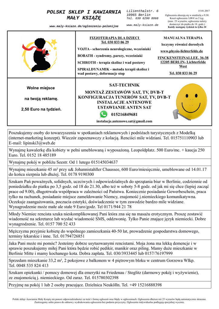 POLSKI SKLEP I KAWIARNIA MAŁY KSIĄŻĘ Lilienthalstr. 6 10965 Berlin www.maly-ksiaze.de/ogloszenia-polonijne www.maly-ksiaze.de Tel. 030 6290 8068 FIZJOTERAPIA DLA DZIECI Tel. 030 833 06 29 VOJTA - schorzenia neurologiczne, wcześniaki BOBATH - syndromy, parezy, wcześniaki SCHROTH - terapia skolioz i wad postawy SPIRALDYNAMIK - metoda terapii skolioz i wad postawy, deformacje stop Wolne miejsce na twoją reklamę. 2,50 Euro na tydzień. 15.01.2017 Ogłoszenia ukazują się w niedzielę o 9:30. Koszt ogłoszenia 3,00 € za 2 tyg. (max. 25 wyrazów, ogłoszenie należy dostarczyć do piątku do 18. godz.) Każdy następny tydzień to tylko 1€ MANUALNA TERAPIA leczymy również dorosłych www.physio-lichterfelde.de FINCKENSTEINALLEE. 36-38 12205 BERLIN- Lichterfelde West Tel. 030 833 06 29 SAT-TECHNIK MONTAŻ ZESTAWÓW SAT, TV, DVB-T KONFIGURACJA TUNERÓW SAT, TV, DVB-T INSTALACJE ANTENOWE USTAWIANIE ANTEN SAT 015216849681 [email protected] Poszukujemy osoby do towarzyszenia w spotkaniach reklamowych i podróżach turystycznych z Modelką (internet-marketing konzept). Wieczór zapoznawczy z kolacją. Renciści mile widziani. Tel. 015751110903 lub E-mail: [email protected] Wynajmę kawalerkę dla kobiety w pełni umeblowaną i wyposażoną. Leopoldplatz. 500 Euro/mc. + kaucja 250 Euro. Tel. 0152 18 485189 Wynajmę pokój w pobliżu Seestr. Od 1 lutego 015145034637 Wynajmę mieszkanie 45 m² przy u& Johannistahller Chaussee, 600 Euro/miesięcznie, umeblowane od 14.01.17 do końca sierpnia lub dłużej. Tel. 0178 9190300 Szukam Pań poważnych, solidnych, uczciwych i odpowiedzialnych do sprzątania biur w Berlinie, codziennie od poniedziałku do piatku po 3,5 godz. od 18 do 21.30, albo też w soboty 5-8 godz. od jak mi się chce (lepiej zacząć prace od 9.00), długotrwała współpraca w zależności od Państwa. Koniecznie posiadanie Gewerbeschein, praca tylko na rachunek, posiadanie miejsce zameldowanie Niemcy, znajomość j.niemieckiego komunikatywna. Oczekuje zaangażowania, poczucia estetyki, doświadczenie w tym zawodzie bardzo mile widziane. Wynagrodzenie może małe ale stałe 9 Euro/godz. Tel 0171/944 21 78 Młody Niemiec rencista szuka nieskomplikowanej Pani która zna się na masażu erotycznym. Proszę zostawić wiadomość na sekretarce lub wysłać wiadomość SMS, oddzwonię. Tylko Panie znające język niemiecki. Dobre wynagrodzenie. Tel. 0157 700 52 433 Mężczyzna przyjmie kobietę do wspólnego zamieszkania 40-50 lat, prowadzenie gospodarstwa domowego, terminy lekarskie i inne. Tel. 01794726851 Jaka Pani może mi pomóc? Jesteśmy dobrze usytuowanymi rencistami. Moja żona ma lekką demencje i w sprawie poszukujemy miłej Pani która będzie robić pedikir, manikir oraz piling. Mamy duże mieszkanie w Berlinie Mitte i mamy kochanego kota. Dobra zapłata. Tel. 030/3933445 lub 0157/76197999 Sprzedam mieszkanie 33,2 m², 2 pokojowe z balkonem w 4 piętrowym bloku w centrum Gorzowa Wlkp. Tel. 0048 535 824 413 Szukam opiekunki / pomocy domowej dla emerytki na Friedenau / Steglitz (darmowy pokój i wyżywienie), ze znajomością j. niemieckiego. Od zaraz. Tel. 015780302398 Przyjmę na pokój 1 lub 2 osoby pracujące. Dzielnica Neukölln. Tel. +49 15216888398 Polski sklep i kawiarnia Mały Książę nie ponosi odpowiedzialności za treść i formę ogłoszeń oraz błędy w ogłoszeniach. Ogłoszenia dłuższe niż 25 wyrazów będą automatycznie skracane. Zastrzegamy sobie prawo do odmowy wydrukowania ogłoszenia bez podania przyczyny. Ogłoszenia indywidualne podlegają specjalnej wycenie. Megtrans Kleintransporte. Przeprowadzki, opróżnianie pomieszczeń, przewóz sklep-dom, Berlin i okolice, Polska. 24h E-mail: [email protected]. Tel. 0177 6423550 lub 015117890903, www.megtrans.de Pani z doświadczeniem pracy przy chorych zaopiekuje się chorym, niepełnosprawnym dorosłym lub dzieckiem, również interesuje mnie sprzątanie mieszkań, domów, biur, restauracji, itp. Tel. 015215168744 lub 030 40303566 Wynajmę pokój do jednej lub dwóch Pań nie palących. Dzielnica Rudow. Proszę dzwonić na numer: +4917672252852 Wynajmę pokój lub mieszkanie jednej osobie na czas nieokreślony. Anhalterbahnhof. Tel. +4917695594126 Wynajmę pokój dla jednej Pani. U7 Wutzkyallee. Tel. 015214388848 Przyjmę na pokój miłą Panią bez nałogów, najlepiej wyjeżdżającą na weekendy. Tel. 0152/24621691 Malowanie, ścianki działowe, murowanie, stolarka i inne roboty remontowo-budowlane. Bez nałogów. Możliwa praca w dwie osoby. Grzegorz. Tel. +48 732 796 100 Przyjmę na pokój dwie Panie niepalące, pracujące. Okolice Hermanplatz. Tel. 0152 17663128 Poszukuję mieszkania 2-pokojowego. Tel. 0152 17824414 Szukam Panią na pokój. Tel. 015217164909 Przyjmę Panią na mieszkanie wyjeżdżającą na weekendy, niepalącą. Leopoldplatz. U9 i U6. Tel. 0151 71724025 Wolne miejsca na pielgrzymkę do Fatiny od 4 do 11 lutego. Koszt 550 Euro. Tel. 030 43023425 lub 0176631753 Poszukuję pokoju do wynajęcia z możliwością meldunku. Proszę o kontakt. Tel. +49-152-141-062-68 Wynajmę pokój dla Pani w spólnym mieszkaniu na Reinickendorfie. Proszę dzwonić po 17. Tel. 030 94407117 Wynajmę pokój z zameldowaniem Pani (nawet z dzieckiem) Spandau, U-Siemensstadt. Tel. 015213197997 (sms) Praca samodzielna, Imbiss do założenia, najlepiej Pani z JobCenter. Dobre miejsce o obroty. Spandau. Tel. 015213197997 Wynajmę samodzielny pokój na dłuższy okres dla Kobiety niepalącej. Na Schöneberg. Tel. 0176 87 43 87 48 Pracownik budowlany poszukuje pracy. Jestem na Gewerbie. Proszę o kontakt. Tel. +49-152-141-062-68 Szukam wykształconej opiekunki dla osób starszych na 24 godziny. Jeśli ze swoim mieszkaniem to do uzgodnienia. Dużo wolnego, samodzielny pokój, internet, komputer. Ok. 4-6 godzin pracy dziennie, od stycznia 2017. Pacjentka ma 86 lat, sama się porusza. Praca: jedzenie, lekarstwa, sprzątanie, pranie, ewentualnie rano pieluchy, pomoc w kąpieli. Wynagrodzenie do uzgodnienia 1100 