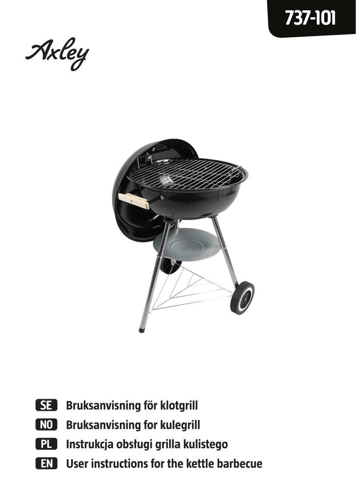 737-101 Bruksanvisning för klotgrill Bruksanvisning for kulegrill Instrukcja obsługi grilla kulistego User instructions for the kettle barbecue SE - Bruksanvisning i original Rätten till ändringar förbehålles. Vid eventuella problem, kontakta vår serviceavdelning på telefon 0200-88 55 88. www.jula.se NO - Bruksanvisning (Oversettelse av original bruksanvisning) Med forbehold om endringer. Ved eventuelle problemer kan du kontakte vår serviceavdeling på telefon 67 90 01 34. www.jula.no PL - Instrukcja obsługi (Tłumaczenie oryginalnej instrukcji) Z zastrzeżeniem prawa do zmian. W razie ewentualnych problemów skontaktuj się telefonicznie z naszym działem obsługi klienta pod numerem: 22 338 88 88. www.jula.pl EN - Operating instructions (Translation of the original instructions) Jula reserves the right to make changes. In the event of problems, please contact our service department. www.jula.com Tillverkare/ Produsent / Producenci/ Manufacturer Jula AB, Box 363, 532 24 SKARA Importör/ Importør/ Importer/ Importer Jula Norge AS, Solheimsveien 6–8, 1471 LØRENSKOG Jula Poland Sp. z o.o., ul. Malborska 49, 03-286 Warszawa, Polska 2017-03-02 © Jula AB Bruksanvisning för klotgrill SVENSKA SE SÄKERHETSANVISNINGAR Läs bruksanvisningen noggrant innan användning! Spara den för framtida behov. VARNING! • Grillen blir mycket varm, flytta den inte när den är tänd. • Grillen får inte användas inomhus! • Använd inte alkohol eller bensin för att tända grillen. Spruta inte någon form av lättantändlig vätska över grillkol eller briketter som redan tänts. Använd enbart tändmedel som uppfyller EN 1860-3. • Håll barn och husdjur på behörigt avstånd från grillen. Övriga säkerhetsanvisningar • Använd aldrig vatten för att kontrollera eller släcka elden. • Lägg på locket och stäng luftventilerna när grillningen är avslutad. • Använd grillvantar för att undvika brännskador vid grillning. • Varmt grillkol eller varma briketter får inte kastas i soptunnor, där någon kan trampa på dem eller där det råder risk för eldsvåda. Låt briketterna slockna helt innan de kastas bort. • Ställ inte grillen i t.ex. ett förråd innan den har slocknat helt. • Se till att lättantändliga vätskor och tryckbehållare inte finns inom den tända grillens område. • Om elektrisk tändare används ska dess nätsladd hållas borta från grillens varma ytor. • Grillen är inte avsedd som värmeelement och får under inga omständigheter användas inomhus. • Rengör grillen regelbundet för att säkerställa avsedd funktion. • Grillen ska stå stabilt på ett fast och plant underlag när den används. Placera grillen på minst 3 meters avstånd från träd och brännbart material. • Endast grillkol och briketter får användas för uppvärmning. • OBS! Briketterna/grillkolen ska alltid placeras på kolfatet i grillens botten. Annars riskerar grillen att ta skada. Använd inte för mycket briketter/grillkol, ett lager räcker. • Kontrollera att kolen glöder helt och hållet före grillning, det tar minst 30 minuter. Grillning kan påbörjas först när briketterna/grillkolen har jämn glöd och en grå hinna som täcker dem. 3 SE BESKRIVNING 1. 2. 3. 4. 5. 6. 7. 8. 9. 10. 11. 12. 13. 14. 15. Handtag Ventil Lock Lockhållare Grillgaller Kolgaller Grillskål Benfästen Ben Hållare för askpanna Hjul Trådhylla Fot Askpanna Ben MONTERING Medföljande monteringsdetaljer Antal 3 6 2 6 3 2 6 2 4 Benämning Bult Bult Bult Skruv Bricka Mutter Mutter Mutter Dimension M6 x 25 mm M6 x 10 mm M4 x 10 mm 3,5 x 18 mm 6 x 20 mm M4 M6 M6 SE Montering av klotgrillen 1. 2. 3. 4. 5. 6. 7. Montera handtaget (1) på utsidan och lockhållaren (4) på insidan av locket (3). Använd bultar och muttrar. Montera handtagen (1) på grillskålen (7), med bultar och muttrar. Fäst hållarna för askpannan (10) på grillens ben. Montera foten (13) på det längsta benet. Vänd skålen upp och ned. Tryck in det längsta benet i benfästet (8). För in i benet i skålens hål närmast handtaget. Sätt fast benet med bult och bricka. Montera de båda andra benen på samma sätt. OBS! Det finns ett vänster- och ett högerben. Se benets vinkel där hålet för hjulaxeln finns. Kroka fast trådhyllan (12) på frambenet och skjut in hjulaxeln genom de andra två benen. Montera hjulen (11) på axeln med muttrar. Placera askpannan (14) på hållarna (10) och se till att hållarna och askpannan placeras på rätt avstånd från grillskålen. Skruva fast ventilen (2) på locket och skålen. Kontrollera att samtliga skruvförband är ordentligt åtdragna. Lägg kolgallret (6) och grillgallret (5) på plats. Grillen är nu färdig att användas. 5 NO NORSK Bruksanvisning for kulegrill SIKKERHETSANVISNINGER Les bruksanvisningen nøye for bruk! Ta vare på den for fremtidig bruk. ADVARSEL! • Grillen blir svært varm, ikke flytt den når den er tent. • Grillen skal ikke brukes innendørs! • Ikke bruk alkohol eller bensin til å denne grillen. Ikke sprut noen form for lettantennelig væske over grillkull eller briketter som allerede er tent. Bruk kun tennmiddel som oppfyller EN 1860-3. • Hold barn og husdyr på forsvarlig avstand fra grillen. Øvrige sikkerhetsanvisninger • Bruk aldri vann til å kontrollere eller slukke ilden. • Legg på lokket og steng luftventilene når grillingen er avsluttet. • Bruk grillvanter for å unngå brannskader når du griller. • Varmt grillkull eller varme briketter skal ikke kastes i søppelbøtter, på steder hvor noen kan tråkke på dem eller på brannfarlige steder. La brikettene slukke helt før du kaster dem. • Ikke sett grillen i f.eks. en bod før den har sluknet helt. • Se til at lettantennelige væsker og trykkbeholdere ikke står i nærheten av den tente grillen. • Hvis du bruker en elektrisk tenner, må strømledningen holdes unna grillens varme deler. • Grillen er ikke beregnet for bruk som varmeelement, og skal ikk