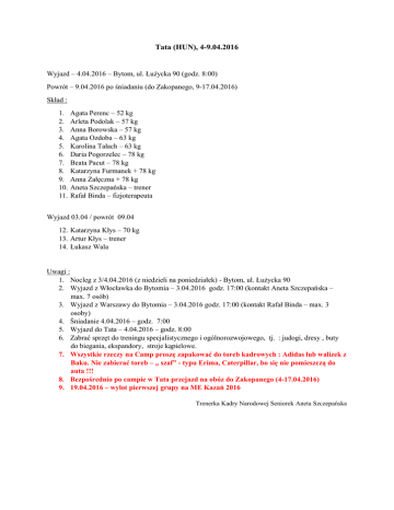 Tata (HUN), 4-9.04.2016 Wyjazd – 4.04.2016 – Bytom, ul. Łużycka 90 (godz. 8:00) Powrót – 9.04.2016 po śniadaniu (do Zakopanego, 9-17.04.2016) Skład : 1. 2. 3. 4. 5. 6. 7. 8. 9. 10. 11. Agata Perenc – 52 kg Arleta Podolak – 57 kg Anna Borowska – 57 kg Agata Ozdoba – 63 kg Karolina Tałach – 63 kg Daria Pogorzelec – 78 kg Beata Pacut – 78 kg Katarzyna Furmanek + 78 kg Anna Załęczna + 78 kg Aneta Szczepańska – trener Rafał Binda – fizjoterapeuta Wyjazd 03.04 / powrót 09.04 12. Katarzyna Kłys – 70 kg 13. Artur Kłys – trener 14. Łukasz Wala Uwagi : 1. Nocleg z 3/4.04.2016 (z niedzieli na poniedziałek) - Bytom, ul. Łużycka 90 2. Wyjazd z Włocławka do Bytomia – 3.04.2016 godz. 17:00 (kontakt Aneta Szczepańska – max. 7 osób) 3. Wyjazd z Warszawy do Bytomia – 3.04.2016 godz. 17:00 (kontakt Rafał Binda – max. 3 osoby) 4. Śniadanie 4.04.2016 – godz. 7:00 5. Wyjazd do Tata – 4.04.2016 – godz. 8:00 6. Zabrać sprzęt do treningu specjalistycznego i ogólnorozwojowego, tj. : judogi, dresy , buty do biegania, ekspandory, stroje kąpielowe. 7. Wszystkie rzeczy na Camp proszę zapakować do toreb kadrowych : Adidas lub walizek z Baku. Nie zabierać toreb – „ szaf” - typu Erima, Caterpillar, bo się nie pomieszczą do auta !!! 8. Bezpośrednio po campie w Tata przejazd na obóz do Zakopanego (4-17.04.2016) 9. 19.04.2016 – wylot pierwszej grupy na ME Kazań 2016 Trenerka Kadry Narodowej Seniorek Aneta Szczepańska