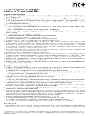 Szczegółowe Warunki udostępnienia usługi nc+go TV z dnia 1 maja 2015 r. Rozdział I. Postanowienia ogólne 1. Niniejszy dokument określa warunki i zasady udostępnienia przez Dostawcę usług usługi nc+go TV za pośrednictwem portalu nc+go TV (dalej: Portal). 2. Usługa nc+go TV to usługa polegająca na płatnym udostępnieniu Abonentowi serwisów VOD (ang. Video on Demand; pol. Wideo na żądanie) świadczonych za pośrednictwem Sprzętu/Sprzętu własnego Abonenta i drogi internetowej, w oparciu o ceny/Opłaty akceptowane przez Abonenta w ramach usługi w menu Portalu. W ramach usługi mogą być również udostępniane bezpłatne serwisy VOD. 3. W ramach usługi Abonent może uzyskać dostęp do: 1) konta podstawowego usługi, umożliwiającego korzystanie z usługi z wyłączeniem dostępu do kolekcji płatnych (dalej: Konto podstawowe), 2) Konta podstawowego i poszczególnych kolekcji płatnych (dalej: Kolekcje płatne). 4. Dostawca usług zapewnia dostęp do usługi za pośrednictwem Portalu w Sprzęcie/Sprzęcie własnym Abonenta technicznie przystosowanym. 5. W ramach Portalu Dostawca usług zapewnia dostęp do: 1) dokumentów związanych z procesem świadczenia usługi (dalej: Dokumenty), 2) aktualnej listy kolekcji dostępnych w ramach usługi w Portalu, 3) wysokości Opłat związanych z procesem korzystania przez Abonenta z usługi. 6. Przed skorzystaniem z usługi Abonent zobowiązany jest zapoznać się z Dokumentami. 7. Dostawca usług nie ponosi odpowiedzialności za nienależytą jakość usług świadczonych przez Dostawcę usług z wykorzystaniem łączy internetowych spowodowaną przyczynami leżącymi po stronie Abonenta bądź dostawcy usług internetowych, z których Abonent korzysta. W szczególności Dostawca usług nie ponosi odpowiedzialności za opóźnienia w otrzymaniu lub przesłaniu danych, spowodowane brakiem transmisji, nieprawidłową bądź powolną transmisją, opóźnieniami lub przerwami w świadczeniu usług internetowych. 8. Dane usługi, w tym dane osobowe Abonenta usługi i dane dotyczące korzystania z usługi (adres MAC), przetwarzane będą w zakresie określonym przepisami powszechnie obowiązującymi. 9. Korzystanie z usługi nie jest związane ze szczególnymi zagrożeniami. 10. Dostawca usług świadczy usługi objęte Szczegółowymi Warunkami na warunkach określonych w niniejszych Szczegółowych Warunkach, Umowie o świadczenie usług (dalej: Umowa), Regulaminie świadczenia usług z dnia 22 grudnia 2014 r. (dalej: Regulamin), Cenniku z dnia 22 grudnia 2014 r. (dalej: Cennik), odrębnych Szczegółowych Warunkach, Warunkach Promocji. 11. Dostawca usług zobowiązuje się do świadczenia usługi w zakresie i na warunkach określonych niniejszymi Szczegółowymi Warunkami, zaś Abonent zobowiązuje się do ich przestrzegania. 12. Dostawca usług zastrzega sobie prawo do zmian nazw produktów i usług będących w ofercie Dostawcy usług określonych w niniejszych Szczegółowych Warunkach. Rozdział II. Postanowienia szczegółowe 1. Warunkiem skorzystania/korzystania z usługi w ramach Portalu jest spełnianie przez Abonenta kryteriów każdorazowo określanych przez Dostawcę usług, dostępnych w Biurze Obsługi Klienta, w szczególności: 1) posiadanie przez Abonenta Sprzętu/Sprzętu własnego Abonenta technicznie przystosowanego, 2) przyłączenie poprawnie skonfigurowanego Sprzętu/Sprzętu własnego Abonenta do domowej sieci Ethernet z możliwością transmisji audiowizualnej o przepustowości co najmniej 2Mb/s, 3) posiadanie przez Abonenta co najmniej aktywnego Konta podstawowego w ramach usługi. 2. Zamówienia/Aktywacji Konta podstawowego/Kolekcji płatnych dokonuje się: 1) Klient – w trakcie zawierania Umowy, 2) Abonent – za pośrednictwem Sprzętu/Sprzętu własnego Abonenta poprzez Portal, telefonicznie pod aktualnym numerem telefonu Biura Obsługi Klienta, bądź przy wykorzystaniu innych form komunikacji udostępnionych przez Dostawcę usług. 3. Zamówienia/Aktywacji usługi w ramach Portalu można dokonać w każdym czasie obowiązywania Umowy. 4. Dostawca usług zastrzega sobie prawo odmowy Aktywacji usługi w ramach Poraltu, gdy Abonent zalega z Opłatami z tytułu korzystania z usług Dostawcy usług do czasu, kiedy Opłaty zostaną uregulowane. 5. Od momentu Aktywacji Konta podstawowego/Kolekcji płatnych Abonent może wielokrotnie korzystać z treści udostępnianych w ramach usługi w ramach Portalu. 6. Abonent może dokonać Dezaktywacji Konta podstawowego/Kolekcji płatnej telefonicznie pod aktualnym numerem telefonu Biura Obsługi Klienta, bądź przy wykorzystaniu innych form komunikacji udostępnionych przez Dostawcę usług, w każdym czasie, ze skutkiem na koniec Okresu rozliczeniowego, w którym Abonent złożył dyspozycję Dezaktywacji, z zastrzeżeniem postanowień zawartych w odrębnych Szczegółowych Warunkach, Warunkach Promocji. 7. Postanowienia szczególne co do Aktywacji/Dezaktywacji Kolekcji nc+go TV HBO OD: 1) Kolekcja nc+go TV HBO OD może być świadczona tylko łącznie z Opcją Dodatkową HBO, 2) warunkiem Aktywacji Kolekcji nc+go TV HBO OD jest posiadanie aktywnej Opcji Dodatkowej HBO, 3) Dezaktywacja Opcji Dodatkowej HBO powoduje jednocześnie Dezaktywację Kolekcji nc+go TV HBO OD. Rozdział III. Opłaty 1. Abonent zobowiązany jest do uiszczania miesięcznej Opłaty za korzystanie z Konta podstawowego w wysokości określonej każdorazowo w menu Portalu. Informacja określająca wysokość Opłaty za korzystanie z Konta podstawowego dostępna jest ITI Neovision S.A., 02-758 Warszawa, al. Gen. W. Sikorskiego 9, dane do korespondencji: 02-100 Warszawa, skr. pocztowa 8, Biuro Obsługi Klienta: tel. 801 044 944, 22 310 47 47 (opłata według cennika operatorów) NIP: 521-00-82-774, REGON: 010175861, wpisana do Rejestru Przedsiębiorców, prowadzonego przez Sąd Rejonowy dla m.st. Warszawy, XIII Wydział Gospodarczy KRS pod nr KRS: 0000469644, kapitał zakładowy: 441.176.000 z