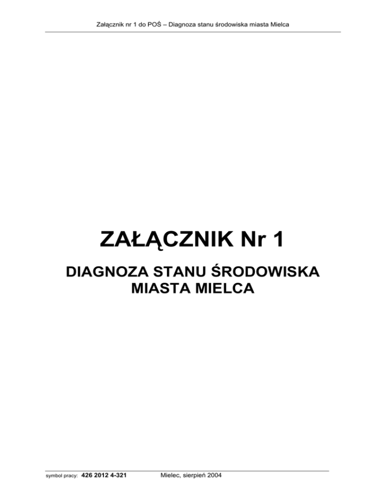 Załącznik nr 1 do POŚ – Diagnoza stanu środowiska miasta Mielca ZAŁĄCZNIK Nr 1 DIAGNOZA STANU ŚRODOWISKA MIASTA MIELCA symbol pracy: 426 2012 4-321 Mielec, sierpień 2004 Załącznik nr 1 do POŚ – Diagnoza stanu środowiska miasta Mielca Spis treści 1. 1.1. 1.2. 1.2.1. 1.2.2. 1.2.3. 1.3. 1.4. 1.5. 1.6. 1.7. 1.8. 1.9. 1.10. 2. 4. Położenie i wielkość miasta Warunki geograficzno-środowiskowe na terenie miasta Budowa geologiczna i ukształtowanie terenu Surowce mineralne Gleby Warunki meteorologiczne i klimatyczne Użytkowanie terenów w mieście Struktura funkcjonalno – przestrzenna miasta Uwarunkowania społeczno-kulturowe Tereny zabudowane System transportowy Infrastruktura techniczna Gospodarka DIAGNOZA STANU ŚRODOWISKA MIASTA MIELCA 2.1. 2.1.1. 2.1.2. 2.2. 2.2.1. 2.2.2. 2.3. 2.3.1. 2.3.2. 2.3.3. 2.3.4. 2.4. 2.4.1. 2.4.2. 2.5. 2.5.1. 2.5.2. 2.5.3. 2.5.4. 2.5.5. 2.5.6. 2.6. 2.7. 2.7.1. 2.7.2. 2.7.3. 2.7.4. 3. Str. 3 INFORMACJE OGÓLNE Wody Wody podziemne Wody powierzchniowe Zaopatrzenie w wodę i odprowadzanie ścieków Zaopatrzenie w wodę Odprowadzenie ścieków sanitarnych Klimat akustyczny Identyfikacja problemu Podstawa prawna oceny stanu klimatu akustycznego Ocena stanu aktualnego klimatu akustycznego Podsumowanie Powietrze Emisja zanieczyszczeń do powietrza Ocena stanu powietrza Promieniowanie elektromagnetyczne Identyfikacja problemu Źródła promieniowania elektromagnetycznego Wymagania prawne Określanie wpływu na środowisko obiektów i urządzeń emitujących pola elektromagnetyczne Ocena stanu aktualnego w mieście Ochrona środowiska przed szkodliwym promieniowaniem elektromagnetycznym Obiekty najbardziej uciążliwe dla środowiska zlokalizowane na terenie miasta Przyroda Szata roślinna i świat zwierzęcy Zieleń urządzona Przestrzeń przyrodnicza Ochrona przyrody 3 3 3 4 5 5 5 6 8 8 9 11 12 14 14 14 14 16 16 17 18 18 19 22 25 27 27 30 36 36 36 37 38 40 42 43 45 45 46 46 47 DOTYCHCZASOWA REALIZACJA ZADAŃ W ZAKRESIE OCHRONY ŚRODOWISKA 50 PODSUMOWANIE 55 LITERATURA 56 WYKAZ ZASTOSOWANYCH TERMINÓW I SKRÓTÓW 58 symbol pracy: 426 2012 4-321 Mielec, sierpień 2004 1 Załącznik nr 1 do POŚ – Diagnoza stanu środowiska miasta Mielca Spis tablic Str. Tablica 1.1. Tablica 1.2. Tablica 1.3. Tablica 2.1.1. Tablica 2.1.2. Tablica 2.1.3. Tablica 2.3.1. Tablica 2.3.2. Tablica 2.3.3. Tablica 2.3.4. Tablica 2.3.5. Tablica 2.3.6. Tablica 2.4.1. Tablica 2.4.2. Tablica 2.4.3. Tablica 2.4.4. Tablica 2.4.5. Tablica 2.4.6. Tablica 2.4.7. Tablica 2.5.1. Tablica 2.5.2. Tablica 2.5.3. Tablica 2.7.1. Struktura użytkowania gruntów w Mielcu..........................................................6 Dane demograficzne dla Mielca .......................................................................8 Wyposażenie Mielca w infrastrukturę techniczną (2002 r.).............................12 Jakość wód rzeki Wisłoki powyżej Mielca (21,5 km, Wojsław)........................15 Jakość wód rzeki Wisłoki poniżej Mielca (15,5 km, Rędzianowice) ................15 Jakość wód Potoku Rów poniżej SSE „EURO-PARK MIELEC”......................16 Dopuszczalne poziomy hałasu w środowisku powodowanego przez drogi l lub linie kolejowe .............................................................................................19 Dopuszczalne poziomy hałasu w środowisku powodowanego przez starty, lądowania i przeloty statków powietrznych oraz linie elektroenergetyczne ................................................................................20 Wartości progowe poziomów hałasu w środowisku powodowanego ruchem drogowym lub kolejowym oraz działalnością innych grup źródeł hałasu .............................................................................................................20 Zbiorczy rozkład poziomów hałasu komunikacyjnego w Mielcu w 1997 roku 22 Wyniki pomiaru natężenia hałasu komunikacyjnego w Mielcu w roku 2001 ...23 Lokalizacja punktów pomiarowych i wyniki pomiaru hałasu w rejonie SSE „EURO-PARK MIELEC" .........................................................................24 Wielkość emisji zanieczyszczeń powietrza z energetycznego spalania paliw na terenie miasta Mielca, [Mg/rok] ..................................................................28 Wielkość emisji zanieczyszczeń powietrza na terenie miasta Mielca w odniesieniu do woj. podkarpackiego, ..........................................................29 Redukcja zanieczyszczeń do powietrza na terenie miasta Mielca w odniesieniu do woj. podkarpackiego, ..........................................................30 Stan zanieczyszczeń powietrza na terenie miasta Mielca...............................31 Lokalizacja punktów pomiarowych imisji powietrza w Mielcu wokół SSE .......32 Wyniki pomiarów zanieczyszczeń powietrza w Mielcu w roku 2002 wokół SSE.................................................................................................................33 Wyniki pomiarów lotnych związków organicznych powietrza w Mielcu w roku 2002 wokół SSE..................................................................................34 Przykłady źródeł pól elektromagnetycznych....................................................37 Dopuszczalne poziomy pól elektromagnetycznych dla terenów pod zabudowę mieszkaniową ................................................................................37 Dopuszczalne poziomy pól elektromagnetycznych dla miejsc dostępnych dla ludności.....................................................................................................38 Pomniki przyrody w Mielcu ..............................................................................47 Spis załączników Załącznik nr 1.1 - Wielkość emisji zanieczyszczeń do powietrza na terenie województwa podkarpackiego i miasta Mielca w latach 2001-2003 symbol pracy: 426 2012 4-321 Mielec, sierpień 2004 2 Załącznik nr 1 do POŚ – Diagnoza stanu śro