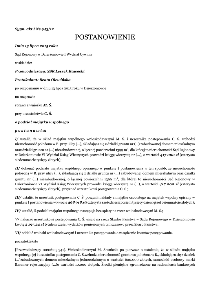 Sygn. akt I Ns 943/12 POSTANOWIENIE Dnia 13 lipca 2015 roku Sąd Rejonowy w Dzierżoniowie I Wydział Cywilny w składzie: Przewodniczący: SSR Leszek Kawecki Protokolant: Beata Olewińska po rozpoznaniu w dniu 13 lipca 2015 roku w Dzierżoniowie na rozprawie sprawy z wniosku M. Ś. przy uczestnictwie C. Ś. o podział majątku wspólnego p o s t a n a w i a: I/ ustalić, że w skład majątku wspólnego wnioskodawczyni M. Ś. i uczestnika postępowania C. Ś. wchodzi nieruchomość położona w B. przy ulicy (...), składająca się z działki gruntu nr (...) zabudowanej domem mieszkalnym oraz działki gruntu nr (...) niezabudowanej, o łącznej powierzchni 1399 m2, dla której to nieruchomości Sąd Rejonowy w Dzierżoniowie VI Wydział Ksiąg Wieczystych prowadzi księgę wieczystą nr (...), o wartości 417 000 zł (czterysta siedemnaście tysięcy złotych); II/ dokonać podziału majątku wspólnego opisanego w punkcie I postanowienia w ten sposób, że nieruchomość położoną w B. przy ulicy (...), składającą się z działki gruntu nr (...) zabudowanej domem mieszkalnym oraz działki gruntu nr (...) niezabudowanej, o łącznej powierzchni 1399 m2, dla której to nieruchomości Sąd Rejonowy w Dzierżoniowie VI Wydział Ksiąg Wieczystych prowadzi księgę wieczystą nr (...), o wartości 417 000 zł (czterysta siedemnaście tysięcy złotych), przyznać uczestnikowi postępowania C. Ś.; III/ ustalić, że uczestnik postępowania C. Ś. poczynił nakłady z majątku osobistego na majątek wspólny opisany w punkcie I postanowienia w kwocie 468 918 zł (czterysta sześćdziesiąt osiem tysięcy dziewięćset osiemnaście złotych); IV/ ustalić, iż podział majątku wspólnego następuje bez spłaty na rzecz wnioskodawczyni M. Ś.; V/ nakazać uczestnikowi postępowania C. Ś. uiścić na rzecz Skarbu Państwa – Sądu Rejonowego w Dzierżoniowie kwotę 3 197,24 zł tytułem części wydatków poniesionych tymczasowo przez Skarb Państwa; VI/ oddalić wnioski wnioskodawczyni i uczestnika postępowania o zasądzenie kosztów postępowania. poczatektekstu [Przewodniczący 00:06:03.341]. Wnioskodawczyni M. Ś.wniosła po pierwsze o ustalenie, że w składu majątku wspólnego jej i uczestnika postępowania C. Ś.wchodzi nieruchomość gruntowa położona w B., składająca się z działek (...)zabudowanych domem mieszkalnym jednorodzinnym o wartości 600.000 złotych, samochód osobowy marki B.numer rejestracyjny (...)o wartości 10.000 złotych. Środki pieniężne zgromadzone na rachunkach bankowych Banku (...) S.A.Oddział w D.o nieznanej jej wartości oraz po drugie o dokonanie podziału tego majątku w ten sposób, aby wszystkie wyżej opisane składniki przyznać uczestnikowi postępowania z obowiązkiem spłaty połowy ich wartości, to jest na chwilę składania wniosku w kwocie 305.000 złotych na jej rzecz, tytułem wyrównania udziału w majątku wspólnym. Nadto wystąpiła o zasądzenie od uczestnika postępowania na jej rzecz kosztów postępowania, w tym kosztów zastępstwa adwokackiego według norm przypisanych. Na uzasadnienie wniosku podała, że w dniu 10 października 2012 roku Sąd Okręgowy w Świdnicy w sprawie o sygnaturze akt I C (...)rozwiązał przez rozwód bez orzekania o winie małżeństwo jej i uczestnika postępowania. Wyrok ten uprawomocnił się natomiast w dniu 31 października 2012 roku. Podniosła, że w czasie trwania małżeństwa oboje zakupili nieruchomość gruntową położoną w B.przy ulicy (...), składającą się z działek gruntu (...)i (...), przy czym na działce numer (...)posadowiony jest dom jednorodzinny. Wartość całej nieruchomości oszacowała zaś na kwotę 600.000 złotych. Dodała, że z chwilą orzeczenia rozwodu opuściła wspólny dom i wraz z małoletnią córka przeprowadziła się do swojej matki. Obecnie, zatem zajmuje go jedynie uczestnik postępowania. Ponadto podała, że w trakcie małżeństwa uczestnik zakupił w Niemczech samochód osobowy marki B.o numerze rejestracyjnym (...)o wartości 10.000 złotych. Wskazała również, że uczestnik w części osiąganego przez siebie dochodu wpłaca na rachunki bankowe, bądź lokaty Banku (...) S.A.Oddział w D., z tym, że nie wie ile środków zgromadził na wskazanym rachunku bankowym, ani ile założył rachunków bankowych, nie wie również, lokat bankowych przepraszam, nie wie również, czy uczestnik wypłacił już zgromadzonych tam oszczędności. Co do sposobu podziału majątku wspólnego, to podniosła, że skoro w nieruchomości wspólnej zamieszkuje jedynie uczestnik postępowania, wskazany wyżej samochód osobowy również on użytkuje, to oba te składniki winny zostać przyznane uczestnikowi, natomiast jej z tytułu spłaty należy się połowa wartości tych składników, to jest kwota 305.000 złotych. Zaznaczyła nadto, że po otrzymaniu informacji przekazanych przez Bank (...) S.A.Oddział w D., a dotyczących środków pieniężnych znajdujących się na rachunkach bankowych należących do uczestnika, wniesie, aby te środki również przyznać uczestnikowi z obowiązkiem spłaty na jej rzecz połowy ich wartości, jako wchodzących do majątku wspólnego. Na koniec dodała, że jest osobą bezrobotną, bez prawa do zasiłku i poza zasądzonymi alimentami na małoletnią córkę, nie ma żądnych środków utrzymania. Tymczasem uczestnik postępowania prowadzi własną działalność gospodarczą o profilu budowlanym. Z otrzymanej spłaty z tytułu jej udziału w majątku wspólnym zamierza natomiast spłacić drobne pożyczki zaciągane u swojej matki oraz zamierza zakupić niewielkie mieszkanie, gdyż tylko takie jest w stanie sama utrzymać. W odpowiedzi na wniosek uczestnik postępowania nie sprzeciwił się wnioskowi, co do zasady jednak oświadczył, że w skład majątku wspólnego wchodzą punkt pierwszy: nieruchomość gruntowa położona w B., opisana we wniosku, o wartości 500.000 złotych. Punkt drugi: równowartość s