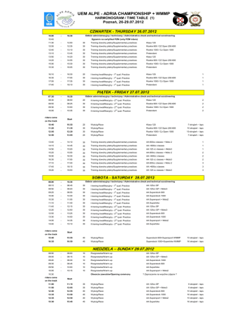 UEM ALPE - ADRIA CHAMPIONSHIP + WMMP HARMONOGRAM / TIME TABLE (1) Poznań, 26-29.07.2012 CZWARTEK - THURSDAY 26.07.2012 10.00 Odbiór administracyjny i techniczny / Administrative check and technical scrutineering - 18.30 11:30 - 12:00 30 Trening dowolny płatny/Supplementary practices Klasa 125 12:05 - 12:35 30 Trening dowolny płatny/Supplementary practices Rookie 600 / CZ Open 250-600 12:40 - 13:10 30 Trening dowolny płatny/Supplementary practices Rookie 1000 / Cz Open 1000 13:15 - 13:45 30 Trening dowolny płatny/Supplementary practices Pretendent 13:50 - 14:20 30 Trening dowolny płatny/Supplementary practices Klasa 125 14:25 - 14:55 30 Trening dowolny płatny/Supplementary practices Rookie 600 / CZ Open 250-600 15:00 - 15:30 30 Trening dowolny płatny/Supplementary practices Rookie 1000 / Cz Open 1000 15:35 - 16:05 30 Trening dowolny płatny/Supplementary practices Pretendent 10:45 Egzamin na certyfikat PZM (only PZM riders) st Klasa 125 1 st Rookie 600 / CZ Open 250-600 1 st Rookie 1000 / Cz Open 1000 1 st Pretendent 1 16:10 - 16:30 20 I trening kwalifikacyjny - 1 qual. Practice 16:35 - 17:05 30 I trening kwalifikacyjny - 1 qual. Practice 17:05 - 17:35 30 I trening kwalifikacyjny - 1 qual. Practice 17:40 - 18:10 30 I trening kwalifikacyjny - 1 qual. Practice 07:30 - 19.30 PIĄTEK - FRIDAY 27.07.2012 Odbiór administracyjny i techniczny / Administrative check and technical scrutineering 08:30 - 08:50 20 II trening kwalifikacyjny - 2nd qual. Practice Klasa 125 2 08:55 - 09:25 30 II trening kwalifikacyjny - 2nd qual. Practice Rookie 600 / CZ Open 250-600 2 09:30 - 10:00 30 II trening kwalifikacyjny - 2nd qual. Practice Rookie 1000 / Cz Open 1000 2 10:05 - 10:35 30 II trening kwalifikacyjny - 2nd qual. Practice Pretendent 2 riders come Start on the track 10:40 10:55 25 Wyścig/Race Klasa 125 11:20 11:35 30 Wyścig/Race Rookie 600 / CZ Open 250-600 10 okrążeń - laps 7 okrążeń – laps 12:05 12:20 30 Wyścig/Race Rookie 1000 / Cz Open 1000 10 okrążeń – laps 12:50 13:05 25 Wyścig/Race Pretendent 7 okrążeń – laps 13:40 - 14:10 30 Trening dowolny płatny/Supplementary practices AA 600cc classes + Moto 2 1 14:15 - 14:45 30 Trening dowolny płatny/Supplementary practices AA >600cc classes 1 14:50 - 15:20 30 Trening dowolny płatny/Supplementary practices AA 125 cc classes + Moto3 1 15:25 - 15:55 30 Trening dowolny płatny/Supplementary practices AA 600cc classes + Moto 2 2 16:00 - 16:30 30 Trening dowolny płatny/Supplementary practices AA >600cc classes 2 16:35 - 17:05 30 Trening dowolny płatny/Supplementary practices AA 125 cc classes + Moto3 2 17:10 - 17:40 30 Trening dowolny płatny/Supplementary practices AA 600cc classes + Moto 2 3 17:45 - 18:15 30 Trening dowolny płatny/Supplementary practices AA >600cc classes 3 18:20 - 18:50 30 Trening dowolny płatny/Supplementary practices AA 125 cc classes + Moto3 3 08.00 - 18.30 08:15 - 08:45 30 I trening kwalifikacyjny - 1 qual. Practice AA 125cc SP 08:50 - 09:20 30 I trening kwalifikacyjny - 1st qual. Practice AA 125cc GP + Moto3 09:25 - 09:55 30 I trening kwalifikacyjny - 1st qual. Practice AA Superstock 600 10:00 - 10:30 30 I trening kwalifikacyjny - 1st qual. Practice AA Superstock 1000 10:35 - 11:05 30 I trening kwalifikacyjny - 1st qual. Practice AA Supersport + Moto2 11:10 - 11:40 30 I trening kwalifikacyjny - 1 qual. Practice AA Superbike 11:45 - 12:15 30 II trening kwalifikacyjny - 2nd qual. Practice AA 125cc SP 12:20 - 12:50 30 II trening kwalifikacyjny - 2nd qual. Practice AA 125cc GP + Moto3 12:55 - 13:25 30 II trening kwalifikacyjny - 2nd qual. Practice AA Superstock 600 13:30 - 14:00 30 II trening kwalifikacyjny - 2nd qual. Practice AA Superstock 1000 14:05 - 14:35 30 II trening kwalifikacyjny - 2 qual. Practice AA Supersport + Moto2 14:40 - 15:10 30 II trening kwalifikacyjny - 2nd qual. Practice AA Superbike SOBOTA - SATURDAY 28.07.2012 riders come Odbiór administracyjny i techniczny / Administrative check and technical scrutineering st st nd Start on the track 15:40 15:55 40 Wyścig/Race Superstock 600+Supersport WMMP 15 okrążeń - laps 16:35 16:50 45 Wyścig/Race Superstock 1000+Superbike WMMP 16 okrążeń - laps NIEDZIELA – SUNDAY 29.07.2012 08:50 - 09:00 10 Rozgrzewka/Warm-up AA 125cc SP 09:05 - 09:15 10 Rozgrzewka/Warm-up AA 125cc GP + Moto3 09:20 - 09:30 10 Rozgrzewka/Warm-up AA Superstock 1000 09:35 - 09:45 10 Rozgrzewka/Warm-up AA Superstock 600 09:50 - 10:00 10 Rozgrzewka/Warm-up AA Superbike 10:05 - 10:15 10 Rozgrzewka/Warm-up 10:30 riders come on the track Otwarcie zawodów/Opening ceremony AA Supersport + Moto2 ? Zaproszenie na wspólne zdjęcie ? Start 11:00 11:15 35 Wyścig/Race AA 125cc SP 11:50 12:05 35 Wyścig/Race AA 125cc GP + Moto3 9 okrążeń - laps 12:40 12:55 40 Wyścig/Race AA Superstock 600 15 okrążeń - laps 13:35 13:50 45 Wyścig/Race AA Superstock 1000 16 okrążeń - laps 14:35 14:50 40 Wyścig/Race AA Supersport + Moto2 15 okrążeń - laps 15:30 15:45 45 Wyścig/Race AA Superbike 16 okrążeń - laps 9 okrążeń - laps