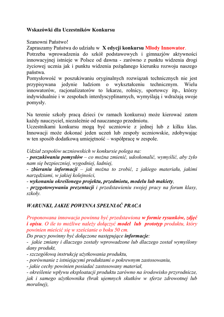 Wskazówki dla Uczestników Konkursu Szanowni Państwo! Zapraszamy Państwa do udziału w X edycji konkursu Młody Innowator. Potrzeba wprowadzenia do szkół podstawowych i gimnazjów aktywności innowacyjnej istnieje w Polsce od dawna - zarówno z punktu widzenia drogi życiowej ucznia jak i punktu widzenia pożądanego kierunku rozwoju naszego państwa. Pomysłowość w poszukiwaniu oryginalnych rozwiązań technicznych nie jest przypisywana jedynie ludziom o wykształceniu technicznym. Wielu innowatorów, racjonalizatorów to lekarze, rolnicy, sportowcy itp., którzy indywidualnie i w zespołach interdyscyplinarnych, wymyślają i wdrażają swoje pomysły. Na terenie szkoły pracą dzieci (w ramach konkursu) może kierować zatem każdy nauczyciel, niezależnie od nauczanego przedmiotu. Uczestnikami konkursu mogą być uczniowie z jednej lub z kilku klas. Innowacji może dokonać jeden uczeń lub zespoły uczniowskie, zdobywając w ten sposób dodatkową umiejętność – współpracę w zespole. Udział zespołów uczniowskich w konkursie polega na: - poszukiwaniu pomysłów – co można zmienić, udoskonalić, wymyślić, aby żyło nam się bezpieczniej, wygodniej, ładniej, - zbieraniu informacji – jak można to zrobić, z jakiego materiału, jakimi narzędziami, w jakiej kolejności, - wykonaniu określonego projektu, przedmiotu, modelu lub makiety, - przygotowywaniu prezentacji i przedstawieniu swojej pracy na forum klasy, szkoły. WARUNKI, JAKIE POWINNA SPEŁNIAĆ PRACA Proponowana innowacja powinna być przedstawiona w formie rysunków, zdjęć i opisu. O ile to możliwe należy dołączyć model lub prototyp produktu, który powinien mieścić się w sześcianie o boku 50 cm. Do pracy powinny być dołączone następujące informacje: - jakie zmiany i dlaczego zostały wprowadzone lub dlaczego został wymyślony dany produkt, - szczegółową instrukcję użytkowania produktu, - porównanie z istniejącymi produktami o pokrewnym zastosowaniu, - jakie cechy powinien posiadać zastosowany materiał, - określenie wpływu eksploatacji produktu zarówno na środowisko przyrodnicze, jak i samego użytkownika (brak ujemnych skutków w sferze zdrowotnej lub moralnej), - ocena własnej pracy - uwagi dotyczące wykonanego produktu, jego wady i zalety - sporządzenie wykazu usterek w zakresie funkcjonowania wyrobu i propozycje zmierzające do udoskonalenia lub uproszczenia działania produktu, bądź też dotyczących ułatwienia montażu lub uproszczenia wykonawstwa, - proponowaną nazwę handlową produktu, ulotkę reklamową lub hasło reklamowe, określenie grup społecznych lub wiekowych, wśród których należy szukać potencjalnych nabywców, - krótki opis, jak przebiegała praca. W miarę możliwości należy: - określić wpływ na środowisko zarówno produkcji danego produktu, jak i powstałych przy tym odpadów oraz jego „złomowania” (unieszkodliwiania, utylizacji). Z całej szkoły należy wybrać od 1 do 3 najlepszych prac i przesłać do 10 marca 2017 r. do działającego na danym terenie Domu Technika (NOT). Wyboru prac w szkole dokonuje komisja, w skład której powinni wchodzić zarówno nauczyciele jak i uczniowie. Mogą uczestniczyć w tym również rodzice. O składzie komisji decyduje szkoła. PRZEDMIOT OCENY Przedmiotem oceny na każdym szczeblu powinna być: - umiejętność wyszukania potrzeby, - pomysłowość, oryginalność rozwiązań, - przydatność, użyteczność - wpływ na poprawę warunków bezpieczeństwa w domu, w szkole, na ulicy, polepszenie ergonomii lub estetyki, - łatwość wykonania, - dostępność materiałów, - uzyskiwane oszczędności (energii, czasu, materiałów), - estetyka wykonania, - umiejętność oceny własnej pracy. Pomysły na innowacje należy czerpać z codziennego życia – rozmów z ludźmi, obserwacji otoczenia. Impulsem mogą być lekcje (pomoce dydaktyczne), pytania młodszych dzieci, nasze potrzeby, wymogi ekologii, poprawa estetyki, itp. Na każdym etapie tworzenia nowego produktu (lub jego modernizacji) młody innowator musi mieć na uwadze dobro nie tylko swoje ale i innych. Jego praca nie może przynosić nikomu szkody. Trzeba też pamiętać, że im prostsze jest rozwiązanie tym lepsze. Przykłady prac uczniów 1. Przyrząd do segregowania monet Potrzeba W sklepie, na poczcie pracownicy muszą liczyć duże ilości monet. Ich posegregowanie ułatwia liczenie. W jaki sposób sprawnie segregować monety? Jak skonstruować urządzenie ułatwiające tą pracę? Analiza zadania. Projektowanie Czym różnią się między sobą monety? W jaki sposób można wprawić monety w ruch? Jakie urządzenie można zastosować do segregacji monet? Jakie właściwości powinny mieć materiały zastosowane do wykonania odpowiedniego urządzenia? Jakie materiały charakteryzują się tymi właściwościami? Wykonanie urządzenia Wykonanie modelu urządzenia. Sprawdzenie działania. Wprowadzenie niezbędnych zmian w konstrukcji urządzenia. 2. Przedłużenie ręki Potrzeba Zdarza się, że trzeba wyjąć coś z miejsca, gdzie ręka nasza nie sięga lub podnieść z podłogi, gdy nie możemy się schylić. Analiza zadania. Projektowanie Jakie przedmioty lub urządzenia służą do chwytania i przenoszenia różnych przedmiotów? Jak można zmienić ich konstrukcję aby ułatwić sobie pracę? Wykonanie urządzenia Wykonanie modelu urządzenia. Sprawdzenie działania. Wprowadzenie niezbędnych zmian w konstrukcji urządzenia. 3. Smycz Przykład niekonwencjonalnego pomysłu – innowacji wykonanej w 2004 roku na konkurs ogólnopolski pt. „Wynalazek to nic trudnego” przez Maćka Krzysiaka ucznia szkoły podstawowej z Warszawy. Magnetyczna zapinka do smyczy Przykładowe sprawy „do załatwienia” - Co roku zmieniamy kalendarz – zużywa się materiał, rośnie ilość śmieci. - W szkole panuje ogromny hałas - wpływa to negatywnie na nasze zdrowie. - Na nagle otwierane drzwi może wpaść biegające dziecko - groz