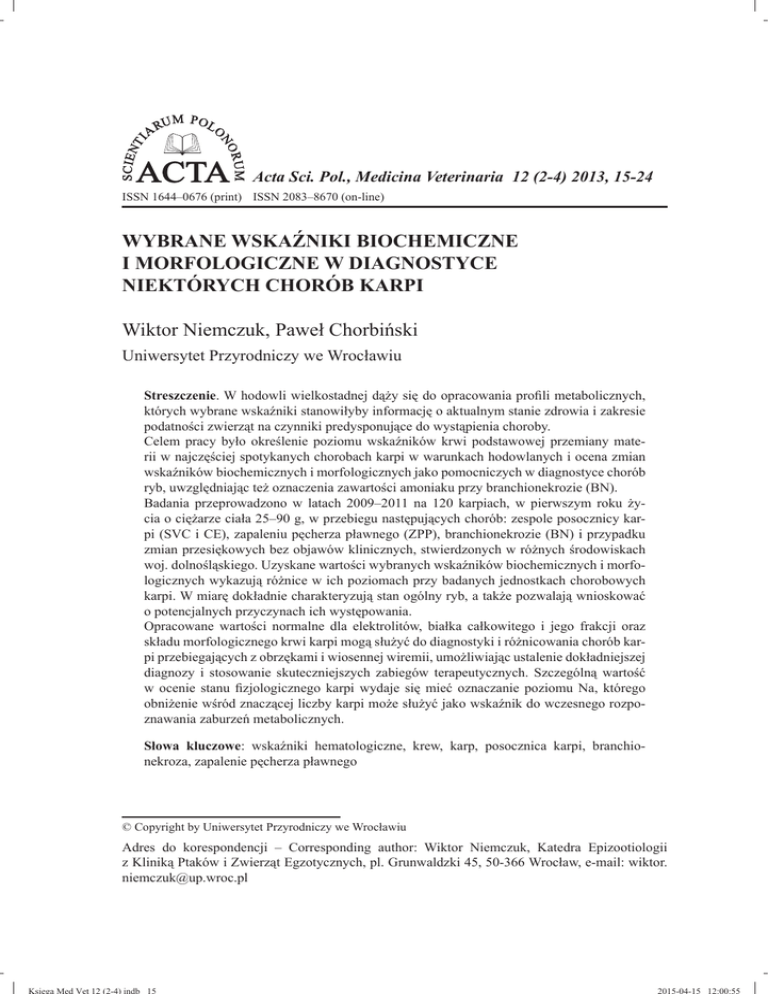 Acta Sci. Pol., Medicina Veterinaria 12 (2-4) 2013, 15-24 ISSN 1644–0676 (print) ISSN 2083–8670 (on-line) WYBRANE WSKAŹNIKI BIOCHEMICZNE I MORFOLOGICZNE W DIAGNOSTYCE NIEKTÓRYCH CHORÓB KARPI1 Wiktor Niemczuk, Paweł Chorbiński Uniwersytet Przyrodniczy we Wrocławiu Streszczenie. W hodowli wielkostadnej dąży się do opracowania profili metabolicznych, których wybrane wskaźniki stanowiłyby informację o aktualnym stanie zdrowia i zakresie podatności zwierząt na czynniki predysponujące do wystąpienia choroby. Celem pracy było określenie poziomu wskaźników krwi podstawowej przemiany materii w najczęściej spotykanych chorobach karpi w warunkach hodowlanych i ocena zmian wskaźników biochemicznych i morfologicznych jako pomocniczych w diagnostyce chorób ryb, uwzględniając też oznaczenia zawartości amoniaku przy branchionekrozie (BN). Badania przeprowadzono w latach 2009–2011 na 120 karpiach, w pierwszym roku życia o ciężarze ciała 25–90 g, w przebiegu następujących chorób: zespole posocznicy karpi (SVC i CE), zapaleniu pęcherza pławnego (ZPP), branchionekrozie (BN) i przypadku zmian przesiękowych bez objawów klinicznych, stwierdzonych w różnych środowiskach woj. dolnośląskiego. Uzyskane wartości wybranych wskaźników biochemicznych i morfologicznych wykazują różnice w ich poziomach przy badanych jednostkach chorobowych karpi. W miarę dokładnie charakteryzują stan ogólny ryb, a także pozwalają wnioskować o potencjalnych przyczynach ich występowania. Opracowane wartości normalne dla elektrolitów, białka całkowitego i jego frakcji oraz składu morfologicznego krwi karpi mogą służyć do diagnostyki i różnicowania chorób karpi przebiegających z obrzękami i wiosennej wiremii, umożliwiając ustalenie dokładniejszej diagnozy i stosowanie skuteczniejszych zabiegów terapeutycznych. Szczególną wartość w ocenie stanu fizjologicznego karpi wydaje się mieć oznaczanie poziomu Na, którego obniżenie wśród znaczącej liczby karpi może służyć jako wskaźnik do wczesnego rozpoznawania zaburzeń metabolicznych. Słowa kluczowe: wskaźniki hematologiczne, krew, karp, posocznica karpi, branchionekroza, zapalenie pęcherza pławnego © Copyright by Uniwersytet Przyrodniczy we Wrocławiu Adres do korespondencji – Corresponding author: Wiktor Niemczuk, Katedra Epizootiologii z Kliniką Ptaków i Zwierząt Egzotycznych, pl. Grunwaldzki 45, 50-366 Wrocław, e-mail: wiktor. [email protected] 16 W. Niemczuk, P. Chorbiński WSTĘP Współczesna epidemiologia kładzie nacisk na inne niż dotychczas podejście do chorób. Odnosi się ono do populacji ujmowanej w aspekcie ekologicznym, w którym rozpatruje się wzajemne interakcje między gospodarzem, zarazkiem i środowiskiem. Ujmuje to plastycznie diagram Śnieszko (ryc. 1). Takie podejście odbiega od dotychczas powszechnie przyjętego postulatu Kocha, w którym do postawienia diagnozy wystarczały izolacja i identyfikacja czynnika etiologicznego wywołującego chorobę. ŚRODOWISKO ENVIRONMENT ZARAZEK AGENT OSOBNIK POPULACJI HOST CHOROBA DISEASE Ryc. 1. Diagram według Śnieszko obrazujący wystąpienie choroby w ujęciu epidemiologicznym Pic. 1. Diagram by Śnieszko showing the occurrence of the disease in terms of epidemiological Obecnie, mimo bardzo rozwiniętej diagnostyki laboratoryjnej, a szczególnie jej części opartej na technice molekularnej, coraz trudniej o jednoznaczne postawienie diagnozy. Łączy się to przede wszystkim z tzw. poliinfekcjami, czyli występowaniem mieszanych zakażeń wirusowych i bakteryjnych, które jeszcze dodatkowo wikłane są pasożytniczymi inwazjami. W wielu przypadkach wyizolowany czynnik chorobowy nie może być uznany za wyłączną jej przyczynę. Coraz więcej chorób nie ma opracowanej etiologii opartej wyłącznie na jednym czynniku. Okazuje się bowiem, że pewne czynniki zakaźne wyizolowuje się zarówno od zwierząt chorych, jak i zdrowych (czynniki ubikwitarne). Takie oportunistyczne drobnoustroje wywołują chorobę jedynie przy współudziale innych czynników biotycznych i abiotycznych, do których zalicza się m.in. stres, niewłaściwe żywienie i utrzymanie. W hodowli wielkostadnej współczesna weterynaria musi rozpatrywać zdrowie stada, nie tylko jako brak choroby, ale również jego produkcyjność. Dąży się do opracowania profili metabolicznych dla konkretnej populacji (stada), których wybrane wskaźniki zdrowia stanowiłyby informację o aktualnym stanie i zakresie podatności na czynniki predysponujące. Posiadanie tak opracowanych wskaźników pozwalałoby na określenie tzw. czynników ryzyka potrzebnych szczególnie przy zwalczaniu chorób w ramach urzędowych programów. Intensywna hodowla karpi poprzez zagęszczenie obsad, sposoby żywienia, pogarszanie się jakości wody sprzyja występowaniu zaburzeń metabolicznych, do określenia których dotychczasowe kryteria okazują się w wielu przypadkach niewystarczające. Często nie jest możliwe wskazanie wyłącznie jednego czynnika chorobotwórczego powodującego Acta Sci. Pol. Wybrane wskaźniki biochemiczne... 17 wybuch choroby, gdyż w większości przypadków, w tym samym czasie działa na ryby wiele czynników stresowych [Blaxhall 1972]. Wynika to z warunków ekologicznych i silnego oddziaływania środowiska na organizm ryb, szczególnie na układ krwionośny, który u ryb jest ściśle związany z otaczającym je środowiskiem [Barham i wsp. 1980]. Dotychczasowa diagnostyka opierała się głównie na badaniu klinicznym, anatomopatologicznym, bakteriologicznym i parazytologicznym, która nie uwzględniała analizy tych przyczyn. W ostatnich latach bardzo istotne stało się badanie wirusologiczne poparte technikami molekularnymi (PCR). Obecnie zaś coraz bardziej przykłada się wagę do wykrywania subklinicznych stanów chorobowych, które wiążą się z zaburzeniami homeostazy ustrojowej. W celu ich stwierdzenia mogą być przydatne analizy krwi, z 
