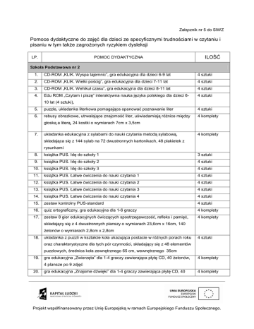 Załącznik nr 5 do SIWZ Pomoce dydaktyczne do zajęć dla dzieci ze specyficznymi trudnościami w czytaniu i pisaniu w tym także zagrożonych ryzykiem dysleksji LP. POMOC DYDAKTYCZNA ILOŚĆ Szkoła Podstawowa nr 2 1. CD-ROM „KLIK. Wyspa tajemnic”, gra edukacyjna dla dzieci 6-9 lat 4 sztuki 2. CD-ROM „KLIK. Wielki pościg”, gra edukacyjna dla dzieci 7-11 lat 4 sztuki 3. CD-ROM „KLIK. Wehikuł czasu”, gra edukacyjna dla dzieci 8-11 lat 4 sztuki 4. Edu ROM „Czytam i piszę” interaktywna nauka języka polskiego dla dzieci 6- 4 sztuki 10 lat (4 sztuki), 5. puzzle, układanka literkowa pomagająca opanować poznawanie liter 4 sztuki 6. rebusy obrazkowe, utrwalające znajomość liter, uświadamiają różnice między 4 komplety głoską a literą, 24 kostki o wymiarach 7cm x 3,5cm 7. układanka edukacyjna z sylabami do nauki czytania metodą sylabową, 4 komplety składająca się z 144 sylab na 72 dwustronnych kartonikach, 48 plakietek z rysunkami 8. książka PUS. Idę do szkoły 1 3 sztuki 9. książka PUS. Idę do szkoły 2 4 sztuki 10. książka PUS. Idę do szkoły 3 4 sztuki 11. książka PUS. Łatwe ćwiczenia do nauki czytania 1 4 sztuki 12. książka PUS. Łatwe ćwiczenia do nauki czytania 2 4 sztuki 13. książka PUS. Łatwe ćwiczenia do nauki czytania 3 4 sztuki 14. książka PUS. Łatwe ćwiczenia do nauki czytania 4 4 sztuki 15. zestaw kontrolny PUS-standard 4 sztuki 16. quiz ortograficzny, gra edukacyjna dla 1-6 graczy 4 komplety 17. zestaw 8 gier edukacyjnych ćwiczących spostrzegawczość, refleks i pamięć, 4 komplety składający się z 4 dwustronnych planszy o wymiarach 23,6cm x 16cm, 140 żetonów o wymiarach 2,8cm x 2,8cm 18. układanka z puzzli w kształcie koła ukazująca postacie w różnych porach roku 4 sztuki oraz charakterystyczne dla tych pór czynności, składający się z 48 elementów puzzlowych, średnica koła zewnętrznego 65 cm, wewnętrznego 35cm 19. gra edukacyjna „Zwierzęta” dla 1-4 graczy zawierająca płytę CD, 40 żetonów, 4 komplety 4 plansze po 9 zdjęć 20. gra edukacyjna „Znajome dźwięki” dla 1-4 graczy zawierająca płytę CD, 40 4 komplety Projekt współfinansowany przez Unię Europejską w ramach Europejskiego Funduszu Społecznego. żetonów, 4 plansze po 9 zdjęć (4 zestawy) 21. zestaw 14 kolorowych pacynek zawierający postacie z bajek, wykonane z 1 komplet miękkiej tkaniny 22. książka „3, 2, 1, 0... Start. Czytanie treningowe” autor Barbara Zakrzewska 1 sztuka Projekt współfinansowany przez Unię Europejską w ramach Europejskiego Funduszu Społecznego.