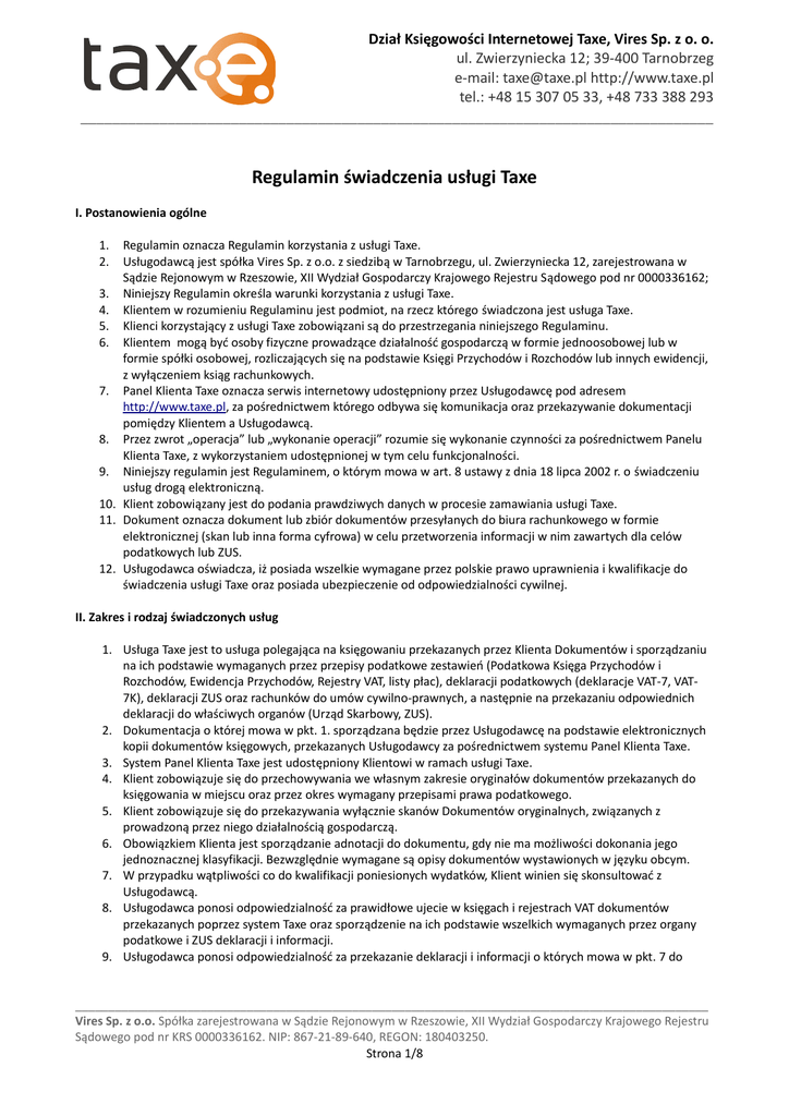 Dział Księgowości Internetowej Taxe, Vires Sp. z o. o. ul. Zwierzyniecka 12; 39-400 Tarnobrzeg e-mail: [email protected] http://www.taxe.pl tel.: +48 15 307 05 33, +48 733 388 293 ________________________________________________________________________________ Regulamin świadczenia usługi Taxe I. Postanowienia ogólne 1. 2. Regulamin oznacza Regulamin korzystania z usługi Taxe. Usługodawcą jest spółka Vires Sp. z o.o. z siedzibą w Tarnobrzegu, ul. Zwierzyniecka 12, zarejestrowana w Sądzie Rejonowym w Rzeszowie, XII Wydział Gospodarczy Krajowego Rejestru Sądowego pod nr 0000336162; 3. Niniejszy Regulamin określa warunki korzystania z usługi Taxe. 4. Klientem w rozumieniu Regulaminu jest podmiot, na rzecz którego świadczona jest usługa Taxe. 5. Klienci korzystający z usługi Taxe zobowiązani są do przestrzegania niniejszego Regulaminu. 6. Klientem mogą być osoby fizyczne prowadzące działalność gospodarczą w formie jednoosobowej lub w formie spółki osobowej, rozliczających się na podstawie Księgi Przychodów i Rozchodów lub innych ewidencji, z wyłączeniem ksiąg rachunkowych. 7. Panel Klienta Taxe oznacza serwis internetowy udostępniony przez Usługodawcę pod adresem http://www.taxe.pl, za pośrednictwem którego odbywa się komunikacja oraz przekazywanie dokumentacji pomiędzy Klientem a Usługodawcą. 8. Przez zwrot „operacja” lub „wykonanie operacji” rozumie się wykonanie czynności za pośrednictwem Panelu Klienta Taxe, z wykorzystaniem udostępnionej w tym celu funkcjonalności. 9. Niniejszy regulamin jest Regulaminem, o którym mowa w art. 8 ustawy z dnia 18 lipca 2002 r. o świadczeniu usług drogą elektroniczną. 10. Klient zobowiązany jest do podania prawdziwych danych w procesie zamawiania usługi Taxe. 11. Dokument oznacza dokument lub zbiór dokumentów przesyłanych do biura rachunkowego w formie elektronicznej (skan lub inna forma cyfrowa) w celu przetworzenia informacji w nim zawartych dla celów podatkowych lub ZUS. 12. Usługodawca oświadcza, iż posiada wszelkie wymagane przez polskie prawo uprawnienia i kwalifikacje do świadczenia usługi Taxe oraz posiada ubezpieczenie od odpowiedzialności cywilnej. II. Zakres i rodzaj świadczonych usług 1. Usługa Taxe jest to usługa polegająca na księgowaniu przekazanych przez Klienta Dokumentów i sporządzaniu na ich podstawie wymaganych przez przepisy podatkowe zestawień (Podatkowa Księga Przychodów i Rozchodów, Ewidencja Przychodów, Rejestry VAT, listy płac), deklaracji podatkowych (deklaracje VAT-7, VAT7K), deklaracji ZUS oraz rachunków do umów cywilno-prawnych, a następnie na przekazaniu odpowiednich deklaracji do właściwych organów (Urząd Skarbowy, ZUS). 2. Dokumentacja o której mowa w pkt. 1. sporządzana będzie przez Usługodawcę na podstawie elektronicznych kopii dokumentów księgowych, przekazanych Usługodawcy za pośrednictwem systemu Panel Klienta Taxe. 3. System Panel Klienta Taxe jest udostępniony Klientowi w ramach usługi Taxe. 4. Klient zobowiązuje się do przechowywania we własnym zakresie oryginałów dokumentów przekazanych do księgowania w miejscu oraz przez okres wymagany przepisami prawa podatkowego. 5. Klient zobowiązuje się do przekazywania wyłącznie skanów Dokumentów oryginalnych, związanych z prowadzoną przez niego działalnością gospodarczą. 6. Obowiązkiem Klienta jest sporządzanie adnotacji do dokumentu, gdy nie ma możliwości dokonania jego jednoznacznej klasyfikacji. Bezwzględnie wymagane są opisy dokumentów wystawionych w języku obcym. 7. W przypadku wątpliwości co do kwalifikacji poniesionych wydatków, Klient winien się skonsultować z Usługodawcą. 8. Usługodawca ponosi odpowiedzialność za prawidłowe ujecie w księgach i rejestrach VAT dokumentów przekazanych poprzez system Taxe oraz sporządzenie na ich podstawie wszelkich wymaganych przez organy podatkowe i ZUS deklaracji i informacji. 9. Usługodawca ponosi odpowiedzialność za przekazanie deklaracji i informacji o których mowa w pkt. 7 do ________________________________________________________________________________________________ Vires Sp. z o.o. Spółka zarejestrowana w Sądzie Rejonowym w Rzeszowie, XII Wydział Gospodarczy Krajowego Rejestru Sądowego pod nr KRS 0000336162. NIP: 867-21-89-640, REGON: 180403250. Strona 1/8 Dział Księgowości Internetowej Taxe, Vires Sp. z o. o. ul. Zwierzyniecka 12; 39-400 Tarnobrzeg e-mail: [email protected] http://www.taxe.pl tel.: +48 15 307 05 33, +48 733 388 293 ________________________________________________________________________________ odpowiednich organów (Urząd skarbowy oraz ZUS). 10. Usługodawca nie ponosi odpowiedzialności za błędy powstałe w wyniku przekazania skanów Dokumentów, których oryginalne wersje nie są w posiadaniu Klienta lub nie dotyczą prowadzonej przez niego działalności gospodarczej. 11. Klient zobowiązuje się do powiadomienia Usługodawcy o wszelkich zmianach dotyczących prowadzonej działalności gospodarczej, mającej wpływ na świadczenie usługi Taxe. 12. W ramach usługi Taxe, Usługodawca zobowiązuje się do bezpłatnego sporządzenia na wniosek Klienta rocznej deklaracji podatkowej, ujmującej wyłącznie dochody z działalności gospodarczej obsługiwanej w ramach usługi Taxe. 13. W przypadku konieczności ujęcia w rocznej deklaracji innych źródeł dochodów, ulg lub sporządzenia wspólnego z małżonkiem rozliczenia, naliczona zostanie dodatkowa opłata, zgodna z aktualnie obowiązującym Cennikiem usługi Taxe. 14. Dokumenty stanowiące podstawę do sporządzenia rocznej deklaracji podatkowej Klient zobowiązuje się dostarczyć nie później niż 10 dni roboczych przed ostatecznym terminem złożenia deklaracji. 15. W przypadku niedotrzymania terminu określonego w powyższym punkcie, Usługodawca nie ponosi odpowiedzialności za terminowe złożenie rocznej deklaracji podatkowej. 16. W przypadku przekazania przez Klienta rozliczaj