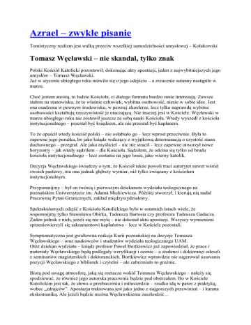 Azrael – zwykłe pisanie Tomistyczny realizm jest walką przeciw wszelkiej samodzielności umysłowej – Kołakowski Tomasz Węcławski – nie skandal, tylko znak Polski Kościół Katolicki pozostawił, dokonując akty apostazji, jeden z najwybitniejszych jego umysłów – Tomasz Węcławski. JuŜ w styczniu ubiegłego roku mówiło się o jego odejściu – a zrzucenie sutanny nastąpiło w marcu. Choć jestem ateistą, to ludzie Kościoła, ci duŜego formatu bardzo mnie interesują. Zawsze stałem na stanowisku, Ŝe to właśnie człowiek, wybitna osobowość, niesie w sobie idee. Jest ona osadzona w pewnym środowisku, w pewnej ekosferze, lecz tylko naprawdę wybitne osobowości kształtują rzeczywistość je otaczającą. Nie inaczej jest w Kościele. Węcławski w marcu ubiegłego roku nie zostawił jeszcze za sobą nauki Kościoła. Wtedy wyszedł z kościoła instytucjonalnego – przestał być księdzem, ale nie przestał być kapłanem. To Ŝe opuścił wtedy kościół polski – nie osłabiało go – lecz wprost przeciwnie. Była to zapewne jego poraŜka, bo jako ksiądz walczący z wyjątkową determinacją o czystość stanu duchownego – przegrał. Ale jako myśliciel – nic nie stracił – lecz zapewne otworzył nowe horyzonty – jak wtedy sądziłem – dla Kościoła. Sądziłem, Ŝe odcina się tylko od brudu kościoła instytucjonalnego – lecz zostanie na jego łonie, jako wierny katolik. Decyzja Węcławskiego świadczy o tym, Ŝe Kościół takŜe powoli traci autorytet nawet wśród swoich pasterzy, ma ona jednak głębszy wymiar, niŜ tylko związany z kościołem instytucjonalnym. Przypomnijmy – był on twórcą i pierwszym dziekanem wydziału teologicznego na poznańskim Uniwersytecie im. Adama Mickiewicza. Później stworzył, i kierują nią nadal Pracownię Pytań Granicznych, zakład międzywydziałowy. Spektakularnych odejść z Kościoła Katolickiego było w ostatnich latach wiele, Ŝe wspomnijmy tylko Stanisława Obirka, Tadeusza Bartosia czy profesora Tadeusza Gadacza. śaden jednak z nich, jeŜeli się nie mylę – nie dokonał aktu apostazji. Wszyscy wymienieni sprzeniewierzyli się sakramentowi kapłaństwa – lecz w Kościele pozostali. Symptomatyczna jest gwałtowna reakcja Kurii poznańskiej na decyzje Tomasza Węcławskiego – oraz naukowców i studentów wydziału teologicznego UAM. OtóŜ dziekan wydziału – ksiądz profesor Paweł Bortkiewicz juŜ zapowiedział, Ŝe prace i materiały Węcławskiego będą podlegały weryfikacji i ocenie – a studenci i doktoranci odeszli z seminariów magisterskich i doktoranckich. Bortkiewicz wprawdzie nie sugerował usuwania pozycji Węcławskiego z bibliotek i czytelni – ale zabrzmiało to groźnie. Biorą pod uwagę atmosferę, jaką się roztacza wokół Tomasza Węcławskiego – naleŜy się spodziewać, Ŝe równieŜ jego autorska pracownia będzie pod obstrzałem. Bo w Kościele Katolickim jest tak, Ŝe słowa o przebaczeniu i miłosierdziu – rzadko idą w parze z praktyką, wobec „zdrajców”. Apostazja traktowana jest jako jedno z najgorszych przewinień – i karana ekskomuniką. Ale jeŜeli będzie moŜna Węcławskiemu zaszkodzić… Wydawałoby się, Ŝe wyjście z Kościoła Węcławskiego ma tylko wymiar duchowy i teologiczny. Jednak nie wydaje się, Ŝeby tylko to było tego przyczyną. Niewątpliwie miała na jego postawę sprawa arcybiskupa Paetza, oskarŜanego o molestowanie kleryków, jak i sprawa Stanisława Wielgusa, w której to Tomasz Węcławski, jeszcze jako ksiądz – badał przekazane mu dokumenty, z których niedwuznacznie wynikała świadoma i słuŜalcza współpraca z organami SB. Niektórzy snują domysły, Ŝe wyjście z Kościoła (i wcześniejsze porzucenie stanu kapłańskiego) mogło nastąpić w wyniku zaangaŜowania się uczonego w prace komisji badających sprawy arcybiskupów Paetza i Wielgusa. Po obejrzeniu dokumentów i wysłuchaniu świadków miał on bowiem uznać winę obu hierarchów, a potem głośno wyraŜać swój sprzeciw wobec sposobu załatwienia tych kwestii przez Kościół. Zresztą Paetz, jak się okazało – teŜ był agentem bezpieki. Sprawa skłonności homoseksualnych Paetza, niepohamowanych, była w Poznaniu (a wcześniej w Olsztynie) znana – i skrzętnie ukrywana. Dopiero gwałtowna reakcja i głośne sformułowanie oskarŜeń właśnie przez Tomasza Węcławskiego, kazało Watykanowi zająć się tą sprawą powaŜnie. Biskup został odwołany z funkcji metropolity poznańskiego w roku 2002. Ale z widoku publicznego nie zszedł. Co jakiś czas jego wyniosła postać pojawia niespodziewanie w róŜnych miejscach, a to przy Benedykcie XVI właśnie, a to w czasie obchodów rocznicy poznańskiego czerwca. Dodatkowo, kilkanaście miesięcy temu wścibscy dziennikarze odkryli w Rzymie prywatny apartament arcybiskupa, o wartości – bagatela – okrągłego miliona euro. Iście ksiąŜęcy apartament! W znanej ksiąŜce „KsięŜa wobec bezpieki – na przykładzie archidiecezji krakowskiej” księdza Tadeusza Isakowicz – Zaleskiego, pojawia się jego nazwisko, w kontekście bardzo groźnym. Jest wielce prawdopodobne, Ŝe jego pobyt w Rzymie w latach 70 był wykorzystywany przez wywiad – być moŜe nie tylko polski. Nosił pseudonim “Fermo”. Ciekawe – ale wewnętrzna komisja historyczna krakowskiej kurii doszła na podstawie tych samych dokumentów, które były podstawą pracy Isakowicz – Zaleskiego, do innych konkluzji – Ŝe ksiądz jest czysty. Jednak nie tylko czynnik duchowy i Paetz z Wielgusem są w tej sprawie waŜne Istnieje jeszcze coś innego, co musiało wpłynąć na jego decyzję. Tym czymś, według mnie jest to, Ŝe Kościół Katolicki w Polsce nie ma pasterza i nie ma drogowskazu moralnego. Jest totalnie pogubiony w tym, co robi, jego wpływy i autorytet maleje gwałtownie. Jest wstrząsany aferami seksualnymi, pedofilskimi, finansowymi, czy lustracyjnymi. Podziały wewnątrz KEP s