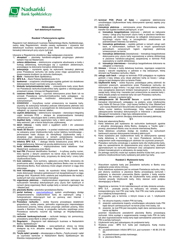 REGULAMIN kart debetowych business Rozdział 1.Postanowienia ogólne § 1. Regulamin kart debetowych business Nadsańskiego Banku Spółdzielczego, zwany dalej Regulaminem, określa zasady wydawania i używania kart debetowych business wydawanych przez Bank oraz zasady rozliczania transakcji dokonanych przy użyciu tych kart. § 2. Używane w Regulaminie określenia mają następujące znaczenie: 1) akceptant – placówka handlowo-usługowa przyjmująca płatności kartami Visa lub MasterCard; 2) antena zbliżeniowa – elektroniczne urządzenie wbudowane w kartę z funkcją zbliżeniową, komunikujące się z czytnikiem zbliżeniowym, pozwalające na dokonanie transakcji zbliżeniowej; 3) autoryzacja – wyrażenie zgody na wykonanie transakcji płatniczej przez Posiadacza rachunku lub osoby przez niego upoważnione do dysponowania środkami na rachunku bankowym; 4) Bank – Nadsański Bank Spółdzielczy 5) BPS S.A. – Bank Polskiej Spółdzielczości S.A. 6) bankomat – urządzenie umożliwiające wypłatę gotówki lub dodatkowo dokonywanie innych czynności przy użyciu karty; 7) blokada karty/zastrzeżenie karty - unieważnienie karty przez Bank lub Posiadacza rachunku/Użytkownika karty zgodnie z obowiązującymi przepisami prawa, Umową lub Regulaminem; 8) czasowa blokada karty – czynność dokonywana przez Bank lub na wniosek Posiadacza rachunku/Użytkownika karty polegająca na czasowym wstrzymaniu możliwości dokonywania transakcji autoryzowanych; 9) CVV2/CVC2 – trzycyfrowy numer umieszczony na rewersie karty, używany do autoryzacji transakcji podczas dokonywania płatności bez fizycznego użycia karty, w szczególności do dokonywania transakcji na odległość, np. poprzez Internet, telefon; 10) czytnik zbliżeniowy – elektroniczne narzędzie – stanowiące integralną część terminala POS – służące do przeprowadzania transakcji zbliżeniowych, odczytujące dane z anteny zbliżeniowej; 11) duplikat karty – kolejny egzemplarz karty z takim samym numerem i datą ważności, jak w karcie dotychczas użytkowanej; 12) dzień roboczy – każdy dzień z wyjątkiem sobót i dni ustawowo wolnych od pracy; 13) Hasło 3D Secure – przesyłane – w postaci wiadomości tekstowej SMS na wskazany przez Użytkownika karty numer telefonu komórkowego – jednorazowe hasło służące do identyfikacji Użytkownika karty i akceptacji jego dyspozycji w ramach potwierdzenia transakcji internetowych z wykorzystaniem zabezpieczenia 3D Secure; 14) Infolinia BPS S.A. – obsługa klienta świadczona przez BPS S.A. drogą telefoniczną, faksową lub pocztą elektroniczną (e-mail); 15) karta debetowa/karta – międzynarodowa karta debetowa Visa/ MasterCard, wydawana przez Bank; 16) kod PIN (Personal Identification Number) - 4-cyfrowy poufny numer, który łącznie z danymi zawartymi na karcie służy do elektronicznej identyfikacji Użytkownika karty, przypisany do danej karty i znany tylko Użytkownikowi karty; 17) kurs walutowy - kurs wymiany, ogłaszany przez Bank, stosowany do przeliczania walut, dostępny w każdej placówce Banku oraz na stronie internetowej Banku. Kurs walutowy może ulegać zmianom w ciągu dnia roboczego; 18) limit transakcyjny – kwota, do wysokości której Użytkownik karty może dokonywać transakcji gotówkowych lub bezgotówkowych w ciągu jednego dnia. Wysokość limitu ustalona jest indywidulanie dla każdej z wydanych kart oraz wymienionych transakcji; 19) organizacja płatnicza – międzynarodowa organizacja zajmująca się rozliczaniem transakcji dokonywanych przy użyciu kart wydanych w ramach danej organizacji; Bank wydaje karty w ramach organizacji Visa i MasterCard; 20) placówka Banku –placówka sprzedażowa Banku 21) portal kartowy – www.kartosfera.pl, system umożliwiający dostęp zarejestrowanemu Użytkownikowi karty do wybranych usług i funkcjonalności dotyczących kart za pomocą sieci Internet i przeglądarki internetowej; 22) Posiadacz rachunku – osoba fizyczna prowadząca działalność gospodarczą, osoba prawna, jednostka organizacyjna nieposiadająca osobowości prawnej, której ustawa przyznaje zdolność prawną, która zawarła z Bankiem Umowę; w przypadku rachunku wspólnego przez Posiadacza rachunku rozumie się każdego ze Współposiadaczy rachunku; 23) rachunek bankowy/rachunek – rachunek bieżący lub pomocniczy, prowadzony przez Bank w złotych polskich; 24) Regulamin - „Regulamin kart debetowych business w Nadsańskim Banku Spółdzielczym ” 25) strona internetowa Banku – www.sanbank.pl, strona na której dostępne są m.in. aktualne wersje Regulaminu oraz Taryfy opłat i prowizji; 26) Taryfa opłat i prowizji – obowiązująca w Banku „Taryfa prowizji i opłat za czynności bankowe w Nadsańskim Banku Spółdzielczym dla Klientów instytucjonalnych” 27) terminal POS (Point of Sale) – urządzenie elektroniczne umożliwiające Użytkownikowi karty dokonywanie operacji zapłaty przy użyciu karty; 28) transakcja płatnicza – zainicjowana przez Zleceniodawcę wpłata, transfer lub wypłata środków pieniężnych, w tym: a) transakcja bezgotówkowa (stykowa) – płatność za nabywane towary i usługi przy fizycznym użyciu karty w placówce handlowousługowej, jak również transakcja na odległość dokonywana bez fizycznego użycia karty, w szczególności zrealizowana za pośrednictwem Internetu lub telefonu; b) transakcja gotówkowa – wypłata gotówki w ramach usługi cash back, w bankomatach, bankach lub w innych uprawnionych jednostkach, oznaczonych logiem organizacji płatniczej umieszczonym na karcie; c) transakcja zbliżeniowa (bezstykowa) – transakcja bezgotówkowa dokonywana przy użyciu karty wyposażonej w antenę zbliżeniową w placówce handlowo-usługowej zaopatrzonej w terminal POS wyposażony w czytnik zbliżeniowy; d) transakcja internetowa – transakcja bezgotówkowa dokonana na odległość w Internecie; 28) Umowa – Umowa o kartę debetową business, regu