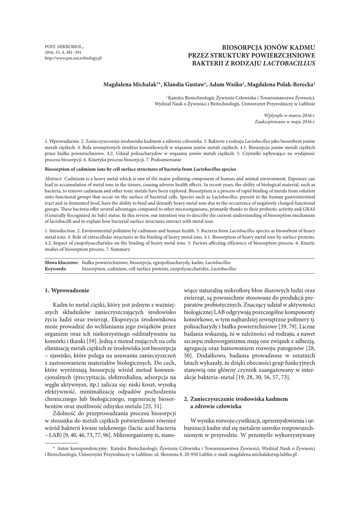 BIOSORPCJA JONÓW KADMU PRZEZ STRUKTURY POWIERZCHNIOWE BAKTERII Z RODZAJU LACTOBACILLUS POST. MIKROBIOL., 2016, 55, 4, 381–391 http://www.pm.microbiology.pl Magdalena Michalak1*, Klaudia Gustaw1, Adam Waśko1, Magdalena Polak-Berecka1 1 Katedra Biotechnologii, Żywienia Człowieka i Towaroznawstwa Żywności, Wydział Nauk o Żywności i Biotechnologii, Uniwersytet Przyrodniczy w Lublinie Wpłynęło w marcu 2016 r. Zaakceptowano w maju 2016 r. 1. Wprowadzenie. 2. Zanieczyszczenie środowiska kadmem a zdrowie człowieka. 3. Bakterie z rodzaju Lactobacillus jako biosorbent jonów metali ciężkich. 4. Rola zewnętrznych struktur komórkowych w wiązaniu jonów metali ciężkich. 4.1. Biosorpcja jonów metali ciężkich przez białka powierzchniowe. 4.2. Udział polisacharydów w wiązaniu jonów metali ciężkich. 5. Czynniki wpływające na wydajność procesu biosorpcji. 6. Kinetyka procesu biosorpcji. 7. Podsumowanie Biosorption of cadmium ions by cell surface structures of bacteria from Lactobacillus species Abstract: Cadmium is a heavy metal which is one of the major polluting component of human and animal environment. Exposure can lead to accumulation of metal ions in the tissues, causing adverse health effects. In recent years, the ability of biological material, such as bacteria, to remove cadmium and other toxic metals have been explored. Biosorption is a process of rapid binding of metals from solution onto functional groups that occur on the surface of bacterial cells. Species such as Lactobacillus, present in the human gastrointestinal tract and in fermented food, have the ability to bind and detoxify heavy metal ions due to the occurrence of negatively charged functional groups. These bacteria offer several advantages compared to other microorganisms, primarily thanks to their probiotic activity and GRAS (Generally Recognized As Safe) status. In this review, our intention was to describe the current understanding of biosorption mechanism of lactobacilli and to explain how bacterial surface structures interact with metal ions. 1. Introduction. 2. Environmental pollution by cadmium and human health. 3. Bacteria from Lactobacillus species as biosorbent of heavy metal ions. 4. Role of extracellular structures in the binding of heavy metal ions. 4.1. Biosorption of heavy metal ions by surface proteins. 4.2. Impact of exopolysaccharides on the binding of heavy metal ions. 5. Factors affecting efficiency of biosorption process. 6. Kinetic studies of biosorption process. 7. Summary Słowa kluczowe: białka powierzchniowe, biosorpcja, egzopolisacharydy, kadm, Lactobacillus Keywords: biosorption, cadmium, cell surface proteins, exopolysaccharides, Lactobacillus 1.Wprowadzenie Kadm to metal ciężki, który jest jednym z ważniejszych składników zanieczyszczających środowisko życia ludzi oraz zwierząt. Ekspozycja środowiskowa może prowadzić do wchłaniania jego związków przez organizm oraz ich niekorzystnego oddziaływania na komórki i tkanki [59]. Jedną z metod mających na celu eliminację metali ciężkich ze środowiska jest biosorpcja – zjawisko, które polega na usuwaniu zanieczyszczeń z zastosowaniem materiałów biologicznych. Do cech, które wyróżniają biosorpcję wśród metod konwencjonalnych (precypitacja, elektrodializa, adsorpcja na węglu aktywnym, itp.) zalicza się: niski koszt, wysoką efektywność, minimalizację odpadów pochodzenia chemicznego lub biologicznego, regenerację biosorbentów oraz możliwość odzysku metalu [25, 51]. Zdolność do przeprowadzania procesu biosorpcji w stosunku do metali ciężkich potwierdzono również wśród bakterii kwasu mlekowego (lactic acid bacteria – LAB) [9, 40, 46, 73, 77, 96]. Mikroorganizmy te, stano wiące naturalną mikroflorę błon śluzowych ludzi oraz zwierząt, są powszechnie stosowane do produkcji preparatów probiotycznych. Znaczący udział w aktywności biologicznej LAB odgrywają poszczególne komponenty komórkowe, w tym najbardziej zewnętrzne polimery tj. polisacharydy i białka powierzchniowe [39, 79]. Liczne badania wskazują, że w zależności od rodzaju, a nawet szczepu mikroorganizmu mają one związek z adhezją, agregacją oraz hamowaniem rozwoju patogenów [28, 50]. Dodatkowo, badania prowadzone w ostatnich latach wykazały, że dzięki obecności grup funkcyjnych stanowią one główny czynnik zaangażowany w inter akcje bakteria–metal [19, 28, 30, 56, 57, 73]. 2.Zanieczyszczenie środowiska kadmem a zdrowie człowieka W wyniku rozwoju cywilizacji, uprzemysłowienia i urbanizacji kadm stał się metalem szeroko rozpowszech nionym w przyrodzie. W przemyśle wykorzystywany * Autor korespondencyjny: Katedra Biotechnologii, Żywienia Człowieka i Towaroznawstwa Żywności, Wydział Nauk o Żywności i Biotechnologii, Uniwersytet Przyrodniczy w Lublinie; ul. Skromna 8, 20-950 Lublin; e-mail: [email protected] 382 MAGDALENA MICHALAK, KLAUDIA GUSTAW, ADAM WAŚKO, MAGDALENA POLAK-BERECKA jest przede wszystkim do produkcji akumulatorów, baterii niklowo-kadmowych oraz galwanicznych powłok ochronnych. Dodatkowo, związki kadmu wchodzą w skład barwników, stabilizatorów tworzyw sztucznych, czy materiałów fluorescencyjnych. Mogą być także używane do wytwarzania sztucznych ogni, stopów łożyskowych i lutowniczych bądź też prętów kadmowych [16]. Każdego roku do środowiska wprowadzanych jest 13 000 ton kadmu, który trafia do różnych ekosystemów i pozostaje w ciągłym obiegu zagrażając zdrowiu człowieka [70]. Związki kadmu dostają się do organizmu człowieka przede wszystkim drogą oddechową i pokarmową. Szacuje się, że w zależności od wielkości cząsteczek, 10–50% wdychanego kadmu jest absorbowana przez tkanki. Podobna zależność występuje w przypadku wchłaniana kadmu, który dostaje się do organizmu wraz z pożywieniem. Absorpcja tego metalu może wahać się w przedziale od około 5 do 10%, na co dodatkowo wpływa zawartość w diecie mikroel