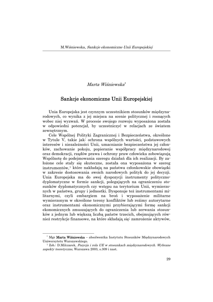 M.Wiśniewska, Sankcje ekonomiczne Unii Europejskiej Marta Wiśniewska ∗ Sankcje ekonomiczne Unii Europejskiej Unia Europejska jest czynnym uczestnikiem stosunków międzynarodowych, co wynika z jej miejsca na scenie politycznej i rosnących wobec niej wyzwań. W procesie swojego rozwoju wyposażona została w odpowiedni potencjał, by uczestniczyć w relacjach ze światem zewnętrznym. Cele Wspólnej Polityki Zagranicznej i Bezpieczeństwa, określone w Tytule V, takie jak: ochrona wspólnych wartości, podstawowych interesów i niezależności Unii, umacnianie bezpieczeństwa jej członków, zachowanie pokoju, popieranie współpracy międzynarodowej oraz demokracji, rządów prawa i ochrony praw człowieka zobowiązują Wspólnotę do podejmowania szeregu działań dla ich realizacji. By założone cele stały się skuteczne, została ona wyposażona w szereg instrumentów, 1 które nakładają na państwa członkowskie obowiązki w zakresie dostosowania swoich narodowych polityk do jej decyzji. Unia Europejska ma do swej dyspozycji instrumenty politycznodyplomatyczne w formie sankcji, polegających na ograniczeniu stosunków dyplomatycznych czy wstępu na terytorium Unii, wymierzonych w państwa, grupy i jednostki. Dysponuje też instrumentami militarnymi, czyli embargiem na broń i wyposażenie militarne wymierzonym w określone tereny konfliktów lub reżimy autorytarne oraz instrumentami ekonomicznymi przybierającymi formę sankcji ekonomicznych zmuszających do ograniczenia lub zerwania stosunków z jednym lub większą liczbą państw trzecich, obejmujących również restrykcje finansowe, na które składają się: zamrożenie aktywów, ∗ Mgr Marta Wiśniewska – absolwentka Instytutu Stosunków Międzynarodowych Uniwersytetu Warszawskiego. 1 Zob.: D.Milczarek, Pozycja i rola UE w stosunkach międzynarodowych. Wybrane aspekty teoretyczne, Warszawa 2003, s.309 i nast. 29 Studia Europejskie, 2/2005 ograniczenie transakcji kapitałowych czy wycofanie preferencji handlowych. Analizując wielość instrumentów wykorzystywanych przez Unię Europejską w jej działaniach zewnętrznych, można ustalić kierunki jej dążeń i ambicji międzynarodowych. Należy jednak podkreślić, że przede wszystkim potencjał ekonomiczny Unii sprzyja zajmowaniu przez nią czołowej pozycji i roli w stosunkach międzynarodowych. Z tego też względu sankcje ekonomiczne są narzędziem, któremu warto poświęcić uwagę, by przybliżyć ich istotę, mechanizm stosowania oraz znaczenie. 1. Pojęcie i znaczenie międzynarodowych sankcji ekonomicznych Państwo, które nie respektuje ustalonych reguł czy przyjętych norm zachowań międzynarodowych musi liczyć się z niekorzystną dla niego reakcją ze strony podmiotu pokrzywdzonego: państwa, grupy państw lub organizacji międzynarodowych. Reakcja ta to, zgodnie z zasadą wzajemności, ukaranie danego podmiotu za nieprzestrzeganie ustalonego porządku czy norm określane jako „sankcja”. Sankcje w prawie międzynarodowym są „negatywną reakcją spo- łeczności międzynarodowej, z którą spotyka się państwo naruszające normy prawa międzynarodowego”. 2 W polityce zagranicznej sankcje stanowią środek nacisku służący wyegzekwowaniu reguł postępowania, które uważa się za pożądane. Stosowane są przez państwa lub organizacje międzynarodowe i określa się je jako tzw. środki przymusu nie będące wojną, a więc np. represalia, retorsje, wszelkie zalecenia czy decyzje i inne środki podejmowane dla realizacji założonego celu. „Sankcje ekonomiczne sensu largo stanowią wszelkie środki o charakterze ogólnogospodarczym”. Mogą być całkowite – obejmując całość stosunków handlowych, bądź częściowe – odnosząc się do niektórych dziedzin działalności gospodarczej państw. Występują w różnorodnych formach, poczynając od najłagodniejszej postaci, jaką jest zawieszenie porozumień handlowych, a kończąc na ich zerwaniu bądź też ustanowieniu całkowitego embarga importowego i eksportowego. 3 Sankcje definiuje się używając pojęć pochodnych czy 2 Prawo międzynarodowe publiczne, red. R.Bierzanek, J.Symonides, Warszawa 2003, s.24. 3 P.A.G.Van Bergeijk, Economic Diplomacy. Trade and Commercial Policy. Positive and Negative Sanctions in New World Order, Aldershot 1994. 30 M.Wiśniewska, Sankcje ekonomiczne Unii Europejskiej zastępczych, tj. embargo, zakaz, bariera, bojkot, blokada handlowa, dyskryminacja. Określa się je jako „środki stosowane w stosunkach między państwami dla uzyskania określonych celów”. 4 „Sankcje eko- nomiczne polegają na tym, że dany podmiot prawa międzynarodowego (państwo, organizacja międzynarodowa lub grupa podmiotów) wykorzystuje swój potencjał gospodarczy przeciwko innemu podmiotowi (lub grupie podmiotów) w celu: a) ukarania tego ostatniego za złamanie określonej reguły czy normy lub b) zapobieżenia temu, aby kraj, wobec którego stosowane są sankcje, naruszył określone zasady czy normy lub osiągnął cel swego działania, względnie korzystał z rezultatów swego postępowania”. 5 Biorąc pod uwagę powyższą definicję stwierdza się, iż działania podmiotu stosującego sankcje ekonomiczne to stosowanie przymusu gospodarczego wobec kraju sankcjonowanego, uniemożliwiające mu osiągnięcie określonych celów. Podmiot sankcjonujący domaga się zmiany dotychczasowej polityki lub postępowania kraju „docelowego” sankcji. Stosowanie sankcji ekonomicznych nie prowadzi do zerwania stosunków dyplomatycznych, ewentualnie do ich ograniczenia. Rzadko natomiast przechodzi w stan wojny. Efektywność sankcji ekonomicznych zależy od metod i środków, jakimi dysponuje państwo czy organizacja stosująca sankcje ekonomiczne. Do ogólnie przyjętych sankcji tego typu zalicza się: – restrykcje eksportowe i importowe jako selektywne i częściowe embargo w celu pozbawienia kraju sankcjonowanego importu dóbr o istotnym znaczeniu dla funkc