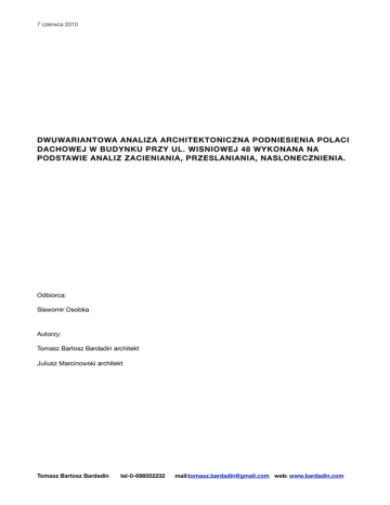 7 czerwca 2010 DWUWARIANTOWA ANALIZA ARCHITEKTONICZNA PODNIESIENIA POLACI DACHOWEJ W BUDYNKU PRZY UL. WISNIOWEJ 48 WYKONANA NA PODSTAWIE ANALIZ ZACIENIANIA, PRZESLANIANIA, NASLONECZNIENIA. Odbiorca: Slawomir Osobka Autorzy: Tomasz Bartosz Bardadin architekt Juliusz Marcinowski architekt Tomasz Bartosz Bardadin tel-0-698552232 mail:[email protected] web: www.bardadin.com 7 czerwca 2010 TEKST MIEJSCOWEGO PLANU ZAGOSPODAROWANIA PRZESTRZENNEGO REJONU STAREGO MOKOTOWA : 7.5 Szegolowe zasady realizacyjne dla obiekow objetych ochrona: 2) Dopuszcza sie rozbudowe poddasza budynku przy ul.Wisniowej 48 poprzez podniesienie polaci dachowej od strony podworka, przy jednoczesnym zachowaniu istniejacej geometrii polaci dachowej od strony ulicy wisniowej. ZAKRES OPRACOWANIA: DWUWARIANTOWA ANALIZA ARCHITEKTONICZNA PODNIESIENIA POLACI DACHOWEJ W BUDYNKU PRZY UL. WISNIOWEJ 48 WYKONANA NA PODSTAWIE ANALIZ: 01 - ANALIZA ZACIENIANIA 02 - ANALIZA PRZESLANIANIA 03 - ANALIZA NASLONECZNIENIA 04 - ANALIZA PODNIESIENIA POLACI DACHOWEJ - DWA WARIANTY: WARIANT 01- CALKOWITE PODNIESIENIE POLACI DACHOWEJ WARIANT 02 - DOCELOWE PODNIESIENIE WYBRANYCH FRAGMENTOW POLACI DACHOWEJ 05 - ANALIZA NASLONECZNIENIA PODDASZA DO CELOW PROJEKTOWYCH 06 - WSTEPNA ANALIZA ZAGOSPODAROWANIA PODDASZA PLAN ZAGOSPODAROWANIA TERENU BUD A - OBIEKT ANALIZOWANY, Budynek zlokalizowany przy ul. Wisniowej 48 BUD B - „OFFICYNA” budynek znajdujacy sie po stronie dziedzinca bud A. BUD C - Budynek sasiadujacy z budynkiem A na poludniu BUD D - Budynek sasiadujacy z budynkiem A na polnoc Tomasz Bartosz Bardadin tel-0-698552232 mail:[email protected] web: www.bardadin.com 7 czerwca 2010 BUDYNEK A , BUD B (OFFICYNA) Miedzy budynkiem A a budynkiem B zlokalizowany jest dziedziniec adoptowany na tymczasowy parking z elementami zieleni. Klatka schodowa budynku A wysunieta jest w kierunku budynku B odleglosc miedzy budynkami w tym „najblizszym” punkcie wynosi 13,78 m. BUDYNEK C Budynek zlokalizowany przy ul. Wisniowej 46, posadowiony na ostrej granicy dzialki z budynkiem A Gabaryty budynku C sa prawie identyczne z budynkiem A. Oba budynki posiadaja prawie taka sama wysokosc +/- 16 m. Miedzy budynkami remontowane jest ogrodzenie. BUDYNEK D Grupa niskich budynkow zlokalizowanych na dziedzincu budynkow naroznych miedzy ul. Wisniowa a ul. Rakowiecka. Budynki trzy kondygnacyjne z oknami skierowanymi na polnpc lub bez 1,30 godzinnego naslonecznienia. 01 - ANALIZA ZACIENIANIA Jesli przyjmiemy rzedna wykonczenia dziedzinca przy wyjsciu z budynku A na dziedziniec jako rzedna +/0.00 wysokosc krawedzi dachu wynosi +16.36 m a wysokosc kalenicy istniejacego dachu budynku A wynosi +19.55 m. Analiza zacieniania zostala wykonana wedlug linijki slonca opracowanej na czas naslonecznienia w dniach rownonocy (21 marca i 21 wrzesnia), szerokosc geograficzna warszawy 51.2. wedlug zalecen Rozporzadzenia Ministra Infrastruktury w sprawie warunkow technicznych, jakim powinny odpowiadac budynki i ich usytuowanie. WYNIK: W zacienianiu budynku Oficyny bardzo duza role odgrywa sasiadujacy budynek C. Analiza zacieniania zostala wykonana od godziny 7.00 do godziny 17.00. Od godziny 13.00 do godziny 17.00 budynek B OFFICYNA zaczyna byc zacieniany przed budynek A i budynek C. W godzinie 13.00 zacienianie budynku B 100% wynosi - Bud A - 30%; bud C - 60% W godzinie 14.30 zacienianie budynku B 100% wynosi - Bud A - 50%; bud C - 50% W godzinie 16.30 zacienianie budynku B 100% wynosi - Bud A - 90%; bud C - 10% Koniec analizy godzina 17.00 Tomasz Bartosz Bardadin tel-0-698552232 mail:[email protected] web: www.bardadin.com 7 czerwca 2010 02 - ANALIZA PRZESLANIANIA Obiekt opracowania - bud. B Officyna Analiza przeslaniania zostala wykonana wedlug zalecen Rozporzadzenia Ministra Infrastruktury w sprawie warunkow technicznych, jakim powinny odpowiadac budynki i ich usytuowanie: „§ 13. 1. Odległość budynku z pomieszczeniami przeznaczonymi na pobyt ludzi od innych obiektów powinna umożliwiać naturalne oświetlenie tych pomieszczeń - co uznaje się za spełnione, jeżeli: 1) między ramionami kąta 60°, wyznaczonego w płaszczyźnie poziomej, z wierzchołkiem usytuowanym w wewnętrznym licu ściany na osi okna pomieszczenia przesłanianego, nie znajduje się przesłaniająca część tego samego budynku lub inny obiekt przesłaniający w odległości mniejszej niż: a) wysokość przesłaniania - dla obiektów przesłaniających o wysokości do 35 m, b) 35 m - dla obiektów przesłaniających o wysokości ponad 35 m, 2) zostały zachowane wymagania, o których mowa w § 57 i 60. 2. Wysokość przesłaniania, o której mowa w ust. 1 pkt 1, mierzy się od poziomu dolnej krawędzi najniżej położonych okien budynku przesłanianego do poziomu najwyższej zacieniającej krawędzi obiektu przesłaniającego lub jego przesłaniającej części. 3. Dopuszcza się sytuowanie obiektu przesłaniającego w odległości nie mniejszej niż 10 m od okna pomieszczenia przesłanianego, takiego jak maszt, komin, wieża lub inny obiekt budowlany, bez ograniczenia jego wysokości, lecz o szerokości przesłaniającej nie większej niż 3 m, mierząc ją równolegle do płaszczyzny okna. 4. Odległości, o których mowa w ust. 1 pkt 1, mogą być zmniejszone nie więcej niż o połowę w zabudowie śródmiejskiej.” Elewacja Budynku B od strony dziedzinca jest rownomierna i symetrycznie podzielona w stosunku do wejscia. Po kazdej stronie sa zlokalizowane trzy okna. Okna zostaly zinwentaryzowane i ponumerowane. Wysokosc spodu okien w stosunku do ustalonego poziomu +/- 0.00 wynosi +2.40 m. Szerokosc wedlug zalaczonego rysunku. Tomasz Bartosz Bardadin tel-0-698552232 mail:[email protected] web: www.bardadin.com 7 czerwca 2010 01 -Rozpietosc kata 60 stopni 02-wysokosc krawedzi dachu 16.36 / 2 = 8.18 m 03-wysokosc kalenicy dachu 19.18/2=9.59 WYNIK Analiza najnizszych okien parteru Bud B udowodnila iz bud A nie przeslania bud B. -Oficyna. Odleglosc miedzy budynkami jest wystarczajaco duza abu budynek A nie odz