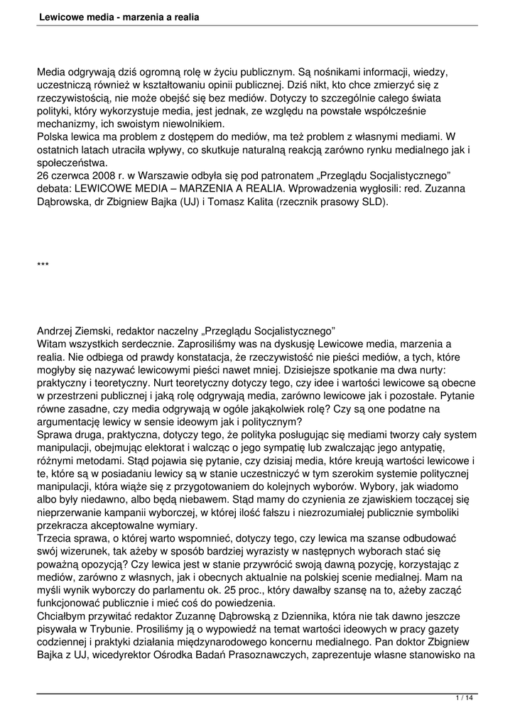 Lewicowe media - marzenia a realia Media odgrywają dziś ogromną rolę w życiu publicznym. Są nośnikami informacji, wiedzy, uczestniczą również w kształtowaniu opinii publicznej. Dziś nikt, kto chce zmierzyć się z rzeczywistością, nie może obejść się bez mediów. Dotyczy to szczególnie całego świata polityki, który wykorzystuje media, jest jednak, ze względu na powstałe współcześnie mechanizmy, ich swoistym niewolnikiem. Polska lewica ma problem z dostępem do mediów, ma też problem z własnymi mediami. W ostatnich latach utraciła wpływy, co skutkuje naturalną reakcją zarówno rynku medialnego jak i społeczeństwa. 26 czerwca 2008 r. w Warszawie odbyła się pod patronatem „Przeglądu Socjalistycznego” debata: LEWICOWE MEDIA – MARZENIA A REALIA. Wprowadzenia wygłosili: red. Zuzanna Dąbrowska, dr Zbigniew Bajka (UJ) i Tomasz Kalita (rzecznik prasowy SLD). *** Andrzej Ziemski, redaktor naczelny „Przeglądu Socjalistycznego” Witam wszystkich serdecznie. Zaprosiliśmy was na dyskusję Lewicowe media, marzenia a realia. Nie odbiega od prawdy konstatacja, że rzeczywistość nie pieści mediów, a tych, które mogłyby się nazywać lewicowymi pieści nawet mniej. Dzisiejsze spotkanie ma dwa nurty: praktyczny i teoretyczny. Nurt teoretyczny dotyczy tego, czy idee i wartości lewicowe są obecne w przestrzeni publicznej i jaką rolę odgrywają media, zarówno lewicowe jak i pozostałe. Pytanie równe zasadne, czy media odgrywają w ogóle jakąkolwiek rolę? Czy są one podatne na argumentację lewicy w sensie ideowym jak i politycznym? Sprawa druga, praktyczna, dotyczy tego, że polityka posługując się mediami tworzy cały system manipulacji, obejmując elektorat i walcząc o jego sympatię lub zwalczając jego antypatię, różnymi metodami. Stąd pojawia się pytanie, czy dzisiaj media, które kreują wartości lewicowe i te, które są w posiadaniu lewicy są w stanie uczestniczyć w tym szerokim systemie politycznej manipulacji, która wiąże się z przygotowaniem do kolejnych wyborów. Wybory, jak wiadomo albo były niedawno, albo będą niebawem. Stąd mamy do czynienia ze zjawiskiem toczącej się nieprzerwanie kampanii wyborczej, w której ilość fałszu i niezrozumiałej publicznie symboliki przekracza akceptowalne wymiary. Trzecia sprawa, o której warto wspomnieć, dotyczy tego, czy lewica ma szanse odbudować swój wizerunek, tak ażeby w sposób bardziej wyrazisty w następnych wyborach stać się poważną opozycją? Czy lewica jest w stanie przywrócić swoją dawną pozycję, korzystając z mediów, zarówno z własnych, jak i obecnych aktualnie na polskiej scenie medialnej. Mam na myśli wynik wyborczy do parlamentu ok. 25 proc., który dawałby szansę na to, ażeby zacząć funkcjonować publicznie i mieć coś do powiedzenia. Chciałbym przywitać redaktor Zuzannę Dąbrowską z Dziennika, która nie tak dawno jeszcze pisywała w Trybunie. Prosiliśmy ją o wypowiedź na temat wartości ideowych w pracy gazety codziennej i praktyki działania międzynarodowego koncernu medialnego. Pan doktor Zbigniew Bajka z UJ, wicedyrektor Ośrodka Badań Prasoznawczych, zaprezentuje własne stanowisko na 1 / 14 Lewicowe media - marzenia a realia temat ewolucji polskich mediów w okresie transformacji 1989–2008, prawie w okresie dwudziestolecia od upadku „Trybuny Ludu”. Podejmie próbę odpowiedzi na pytanie czy są lewicowe media. Zaprosiliśmy również Tomasza Kalitę, rzecznika prasowego SLD, z prośbą o próbę odpowiedzi na pytanie jak sytuują się media w praktyce działania parlamentarnej partii politycznej, a taką partią jest SLD. dr. Zbigniew Bajka: Ewolucja polskich mediów w okresie transformacji 1989-2008. Czy są dziś lewicowe media? Może zacznę od odpowiedzi na pytanie, co się stało z prasą stricte lewicową. Potocznie mówi się, że do czasów transformacji ustrojowej, do roku 1990, cała prasa w Polsce należała do lewicy, nawet jeśli była to przynależność do partyjnej lewicy, a w każdym razie podległość. Jest rzeczą niewątpliwą, że przez kilkadziesiąt lat, od końca lat czterdziestych do początku lat dziewięćdziesiątych, wyłącznym prawie przedsiębiorstwem, które sprzedawało, rozprowadzało, drukowało, organizowało prasę redakcyjną w Polsce była Robotnicza Spółdzielnia Wydawnicza „Prasa”, (RSW „Prasa”), później po zmianie nazwy RSW „Prasa-Książka-Ruch”. Decyzja o likwidacji tego największego koncernu prasowo-wydawniczego w Europie Środkowowschodniej, była przede wszystkim decyzją polityczną. Wyłącznie rozbicie tego molocha mogło rozpocząć okres tworzenia nowego ładu, przynajmniej jeśli chodzi o rynek prasowy w Polsce. Trwała dyskusja na temat, w którym kierunku rynek mediów ma iść. Można wskazać, że nie tylko w Polsce, ale i w innych krajach post socjalistycznych zwyciężył model brytyjski, czyli prasa miała pójść w całości w ręce prywatne, a radio i telewizja miały mieć charakter dualistyczny, czyli państwowe radio i telewizja były przekształcone w publiczne, w spółki publicznej, z drugiej strony był tworzący się rynek mediów komercyjnych. Uważam, że była to jedna z gorzej przeprowadzonych reform. Nie mam na myśli tzw. słuszności dziejowej, natomiast sam sposób przeprowadzania i uchybienia, które powstały w procesie likwidacji, i to uchybienia bardzo poważne – spowodowały, że stracono część dobrych tytułów. Na gruzach RSW uwłaszczyli się różni, przedsiębiorczy redaktorzy i wydawcy. Takie przykłady mamy właściwie w każdym mieście, mamy także w skali ogólnokrajowej. Nie mówię tu o ludziach, którzy od podstaw zakładali swoje firmy i dorobili się. Natomiast przejęcia tytułów były wyłącznie efektem sprytu, zapobiegliwości i posiadania odpowiednich pieniędzy w określonym czasie. Można wskazać na kilku wcale nie wybitnych redaktorów, którzy umiejętnie pracując zabezpieczyli 