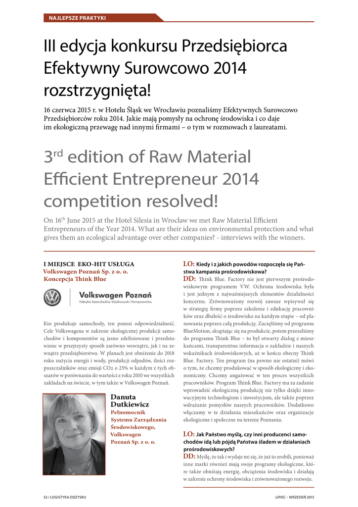 Najlepsze praktyki III edycja konkursu Przedsiębiorca Efektywny Surowcowo 2014 rozstrzygnięta! 16 czerwca 2015 r. w Hotelu Śląsk we Wrocławiu poznaliśmy Efektywnych Surowcowo Przedsiębiorców roku 2014. Jakie mają pomysły na ochronę środowiska i co daje im ekologiczną przewagę nad innymi firmami – o tym w rozmowach z laureatami. 3rd edition of Raw Material Efficient Entrepreneur 2014 competition resolved! On 16th June 2015 at the Hotel Silesia in Wroclaw we met Raw Material Efficient Entrepreneurs of the Year 2014. What are their ideas on environmental protection and what gives them an ecological advantage over other companies? - interviews with the winners. I MIEJSCE EKO-HIT USŁUGA Volkswagen Poznań Sp. z o. o. Koncepcja Think Blue Kto produkuje samochody, ten ponosi odpowiedzialność. Cele Volkswagena w zakresie ekologicznej produkcji samochodów i komponentów są jasno zdefiniowane i przedstawione w przejrzysty sposób zarówno wewnątrz, jak i na zewnątrz przedsiębiorstwa. W planach jest obniżenie do 2018 roku zużycia energii i wody, produkcji odpadów, ilości rozpuszczalników oraz emisji CO2 o 25% w każdym z tych obszarów w porównaniu do wartości z roku 2010 we wszystkich zakładach na świecie, w tym także w Volkswagen Poznań. Danuta Dutkiewicz Pełnomocnik Systemu Zarządzania Środowiskowego, Volkswagen Poznań Sp. z o. o. 52 / Logistyka Odzysku LO: Kiedy i z jakich powodów rozpoczęła się Pań- stwa kampania prośrodowiskowa? Think Blue. Factory nie jest pierwszym prośrodowiskowym programem VW. Ochrona środowiska była i jest jednym z najważniejszych elementów działalności koncernu. Zrównoważony rozwój zawsze wpisywał się w strategię firmy poprzez szkolenie i edukację pracowników oraz dbałość o środowisko na każdym etapie – od planowania poprzez całą produkcję. Zaczęliśmy od programu BlueMotion, skupiając się na produkcie, potem przeszliśmy do programu Think Blue – to był otwarty dialog z mieszkańcami, transparentna informacja o zakładzie i naszych wskaźnikach środowiskowych, aż w końcu obecny Think Blue. Factory. Ten program (na pewno nie ostatni) mówi o tym, że chcemy produkować w sposób ekologiczny i ekonomiczny. Chcemy angażować w ten proces wszystkich pracowników. Program Think Blue. Factory ma za zadanie wprowadzić ekologiczną produkcję nie tylko dzięki innowacyjnym technologiom i inwestycjom, ale także poprzez wdrażanie pomysłów naszych pracowników. Dodatkowo włączamy w te działania mieszkańców oraz organizacje ekologiczne i społeczne na terenie Poznania. DD: LO: Jak Państwo myślą, czy inni producenci samo- chodów idą lub pójdą Państwa śladem w działaniach prośrodowiskowych? DD: Myślę, że tak i wydaje mi się, że już to zrobili, ponieważ inne marki również mają swoje programy ekologiczne, które także obniżają energię, obciążenia środowiska i działają w zakresie ochrony środowiska i zrównoważonego rozwoju. lipiec – wrzesień 2015 Najlepsze praktyki II MIEJSCE EKO-HIT USŁUGA Polpharma S.A. Nagroda Zielonych Procesów badań i rozwoju oraz projektowania. Z Programu Zrównoważonego Rozwoju wybierane są najbardziej efektywne inicjatywy. Zgłaszając inicjatywę do nagrody, każdy pracownik angażuje się i dokłada własną cegiełkę w działania prośrodowiskowe. W ramach realizacji Polityki Zrównoważonego Rozwoju Środowiskowego i Deklaracji Zasad Zielonego Procesu, Polpharma jako firma farmaceutyczna, prowadząca też produkcję chemiczną, zobowiązała się wdrażać ekologiczne praktyki oraz podejmować działania ograniczające wpływ produkcji na środowisko. Jednym z narzędzi jest Nagroda Zielonych Procesów. Ma ona motywować, wyróżniać i doceniać działania pracowników, którzy przyczyniają się do poprawy ekowydajności i efektywności energetycznej produktów, usług oraz procesów produkcyjnych i pomocniczych. Inicjatywy zgłoszone przez pracowników oceniane są przez zespół ekspertów z różnych obszarów firmy pod kątem: korzyści środowiskowych i finansowych, transferu wiedzy oraz wartości naukowej. Grażyna Kaczyńska Kierownik Działu Zrównoważonego Rozwoju i Ochrony Środowiska, Polpharma S.A. III MIEJSCE EKO-HIT USŁUGA Polpharma S.A. Wszyscy na rowery W ramach Polityki Zrównoważonego Rozwoju Środowiskowego i Deklaracji Zasad Ekotransportu firma zobowiązała się wspierać i promować korzystanie z transportu rowerowego oraz podejmować działania zmniejszające ślad ekologiczny. Celem rozpoczęcia praktyki było zmotywowanie pracowników do regularnych dojazdów rowerem do pracy. Dodatkową motywacją jest system nagród za regularne dojazdy. Za każdy wjazd rowerem zapisywanym na karcie dostępu do firmy, przyznawany jest 1 pkt=1 zł w systemie kafeteryjnym MyBenefit. Realizowane są także działania edukacyjne dla pracowników i społeczności lokalnej w zakresie bezpiecznej jazdy rowerem. Grażyna Kaczyńska Kierownik Działu Zrównoważonego Rozwoju i Ochrony Środowiska, Polpharma S.A. LO: Czym jest ślad ekologiczny i jak można go zmniejszać? Ślad ekologiczny to wskaźnik zapotrzebowania człowieka na zasoby naturalne. Porównywana jest konsumpcja zasobów naturalnych ze zdolnością planety Ziemi do ich regeneracji. Jest miernikiem, który potrafi pokazać, jak każdy z nas czy też firma oddziałuje na środowisko. Zmniejszanie śladu ekologicznego to zarówno codzienne działania, jak i wielkie przedsięwzięcia w skali kraju czy też firm. Polpharma zdecydowała się między innymi na wdrożenie programu „Wszyscy na rowery”, który zachęca pracowników do codziennych dojazdów do pracy rowerem. To właśnie rower jest jednym z nielicznych środków transportu, które nie wydzielają spalin. Jazda rowerem jest średnio 13 razy mniej szkodliwa dla środowiska naturalnego od jazdy samochodem. Zatem wybór roweru może znacznie zmniejszyć emisję CO2 do atmosfery i tym samym ograniczać