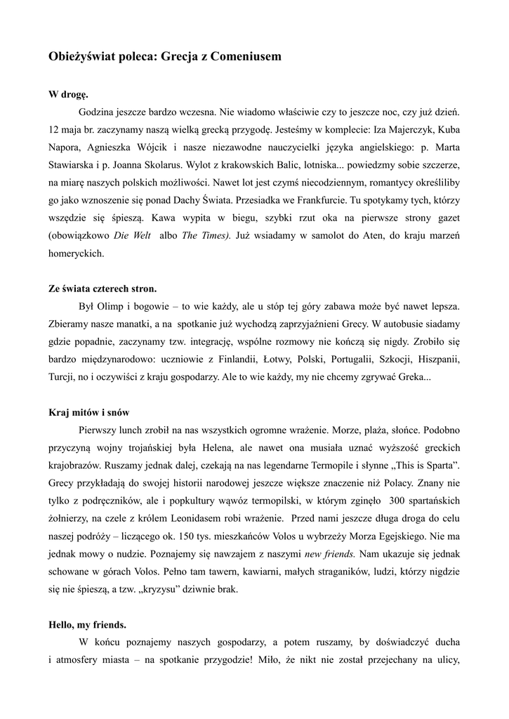Obieżyświat poleca: Grecja z Comeniusem W drogę. Godzina jeszcze bardzo wczesna. Nie wiadomo właściwie czy to jeszcze noc, czy już dzień. 12 maja br. zaczynamy naszą wielką grecką przygodę. Jesteśmy w komplecie: Iza Majerczyk, Kuba Napora, Agnieszka Wójcik i nasze niezawodne nauczycielki języka angielskiego: p. Marta Stawiarska i p. Joanna Skolarus. Wylot z krakowskich Balic, lotniska... powiedzmy sobie szczerze, na miarę naszych polskich możliwości. Nawet lot jest czymś niecodziennym, romantycy określiliby go jako wznoszenie się ponad Dachy Świata. Przesiadka we Frankfurcie. Tu spotykamy tych, którzy wszędzie się śpieszą. Kawa wypita w biegu, szybki rzut oka na pierwsze strony gazet (obowiązkowo Die Welt albo The Times). Już wsiadamy w samolot do Aten, do kraju marzeń homeryckich. Ze świata czterech stron. Był Olimp i bogowie – to wie każdy, ale u stóp tej góry zabawa może być nawet lepsza. Zbieramy nasze manatki, a na spotkanie już wychodzą zaprzyjaźnieni Grecy. W autobusie siadamy gdzie popadnie, zaczynamy tzw. integrację, wspólne rozmowy nie kończą się nigdy. Zrobiło się bardzo międzynarodowo: uczniowie z Finlandii, Łotwy, Polski, Portugalii, Szkocji, Hiszpanii, Turcji, no i oczywiści z kraju gospodarzy. Ale to wie każdy, my nie chcemy zgrywać Greka... Kraj mitów i snów Pierwszy lunch zrobił na nas wszystkich ogromne wrażenie. Morze, plaża, słońce. Podobno przyczyną wojny trojańskiej była Helena, ale nawet ona musiała uznać wyższość greckich krajobrazów. Ruszamy jednak dalej, czekają na nas legendarne Termopile i słynne „This is Sparta”. Grecy przykładają do swojej historii narodowej jeszcze większe znaczenie niż Polacy. Znany nie tylko z podręczników, ale i popkultury wąwóz termopilski, w którym zginęło 300 spartańskich żołnierzy, na czele z królem Leonidasem robi wrażenie. Przed nami jeszcze długa droga do celu naszej podróży – liczącego ok. 150 tys. mieszkańców Volos u wybrzeży Morza Egejskiego. Nie ma jednak mowy o nudzie. Poznajemy się nawzajem z naszymi new friends. Nam ukazuje się jednak schowane w górach Volos. Pełno tam tawern, kawiarni, małych straganików, ludzi, którzy nigdzie się nie śpieszą, a tzw. „kryzysu” dziwnie brak. Hello, my friends. W końcu poznajemy naszych gospodarzy, a potem ruszamy, by doświadczyć ducha i atmosfery miasta – na spotkanie przygodzie! Miło, że nikt nie został przejechany na ulicy, bo w Grecji każdy porusza się do drogach, jak mu się tylko żywnie podoba. Sama Grecja nie jest też dobrym miejscem na dietę. Je się głównie późnymi wieczorami i to w wersji „large”. No i nikt nie jada tam śniadań! My jednak nie zwracamy uwagi na takie szczegóły. Spędzamy wieczór w porcie, ktoś przynosi gitarę, śpiewamy, mieszając nasze wszystkie języki. Nieważne, że nikt z nas nie rozumie greckiego, jest wesoło, jesteśmy razem. Chwilo trwaj... „Mój kolega ma dzisiaj maturę, nie ma czasu dla mnie w ogóle...” Matury trwają, ale w Polsce. Tutaj dzień w szkole wygląda zupełnie inaczej. Na lekcjach brak dyscypliny, reguł, zasad, jest głośno, wszyscy krzyczą, gadają, plotkują, a nauczyciele tez nie są zainteresowani swoim przedmiotem. O wiele bardziej wolą pogadać o piłce, pięknych kobietach, dobrym winie. We wtorek 13 maja skupiamy się na prezentacjach orientujących się wokół The Four Elements of Nature, a tematem przewodnim był tym razem Fire. Były narodowe i regionalne pieśni oraz stroje, tradycyjne potrawy, zwyczaje, tańce, greckie przedstawienie o mitologii, no i my... w strojach harcerskich, z gitarą, z piosenką na ustach. A co, wolno nam! Resztę dnia spędzamy w mieście na grach integracyjnych i zwiedzaniu rekonstrukcji statku Argonautów. Jest przy tym kupa śmiechu i bynajmniej nie a la brytyjski humor. Za granicę wyobraźni. Środa, 14 maja(?- łatwo stracić poczucie czasu), godzina... nie mam pojęcia. Zgubiłam gdzieś zegarek. Wyruszamy na wycieczkę do Meteory, gdzie znajdują się słynne klasztory, niemal zwisające z nieba, wpisane na listę UNESCO. Po drodze odwiedzamy wiele małych miejscowości, obserwujemy mieszkańców i ich codzienne życie. Robimy też mnóstwo zdjęć, trochę jak japońscy turyści... Może to więc skutki globalizacji? W samej szkole, spotykamy Michała, rodem z Polski. Lekkie złamanie zasady „inglisz only” Przyjemnie mieć takiego przewodnika, zawsze doradzi, do którego sklepu nie wchodzić, bo łatwo mogą okantować naiwnych turystów. No tak Grecja... „wolnoć Tomku...”. W czwartek 15 maja odwiedzamy Archeologiczne Muzeum w Volos, a w nim uczestniczymy w warsztatach garncarskich. Przypominają nam się trochę czasy przedszkola. Nie ma to jak upaćkać sąsiada pokaźną ilością gliny. Młodość w każdym języku brzmi tak samo. Potem wyjeżdżamy do Makrinitsa Enviromental Centre. Może i nie mają tam samochodów, telefonów, Internetu, kontaktu ze światem, ale co kilkanaście km dalej mieści się tam stok narciarski... Pokazują nam zdjęcia z ostatnich zim, zaznaczając „To nie jest fotomontaż”. Wieczorami organizujemy wspólne spotkania na plaży. Ktoś rozpala ognisko. Można poczuć się jak u siebie w domu, ale w sumie nie ma żadnej różnicy. Daleko, tysiące kilometrów od domu, las i góry ze słynnych baśni, czasami znikają. Tak bardzo chciałbym zostać kumplem twym. Nasz ostatni wieczór jest nieco smutny. Zżyliśmy się ze sobą. Finowie bynajmniej nie tęsknią za śniegiem, reniferami i św. Mikołajem, Hiszpanie jakoś nie wspominają o Realu, Barcy czy torreadorach, Szkoci zakopali gdzieś w swoich szafach kilty, no a Grecy tylko przyjacielsko przypominają Turkom, że sałatka grecka jest lepsza od klasycznego kebaba. Ach, ta polityczna poprawność. W końcu przestają się nam mylić greckie imiona, chociaż rezygnujemy, gdy trzeba zapamiętać tych wszystkich „Papadopulusów” w greckiej repre