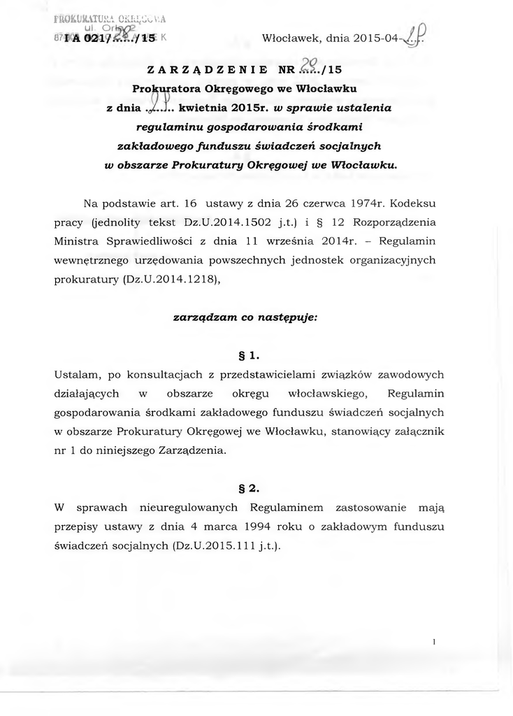 f80£UKATURA CKIiLCCV;A ul. Or: 6 7 A 021/ yWS K W łocławek, d n ia 2 0 1 5 -0 4 - ZARZĄDZBNIB NR /1 5 P ro k u ra to ra O k ręgow ego w e W łocław k u z d n ia .^L J . . k w ie tn ia 2 0 1 5 r . w s p r a w ie u s ta le n ia r e g u la m in u g o s p o d a r o w a n ia ś r o d k a m i z a k ła d o w e g o f u n d u s z u ś w ia d c z e ń s o c ja ln y c h w o b s z a r z e P r o k u r a tu r y O k rę g o w e j w e W ło c ła w k u . Na p o d staw ie a rt. 16 u staw y z d n ia 26 czerw ca 1974r. K odeksu pracy (jednolity te k s t Dz.U .2 0 1 4 .1 5 0 2 j.t.) i § 12 R ozporządzenia M inistra S praw iedliw ości z d n ia 11 w rz eśn ia 2 0 1 4 r. - R egulam in w ew nętrznego u rz ę d o w a n ia pow szechnych je d n o s te k organizacyjnych p ro k u ra tu ry (D z.U .2014.1218), z a r z ą d z a m co n a stę p u je : § 1. U stalam , po k o n su lta c ja c h z p rzed staw icielam i zw iązków zaw odowych działających w o bszarze okręgu w łocław skiego, R egulam in gosp o d aro w an ia śro d k am i zakładow ego fu n d u s z u św iadczeń socjalnych w obszarze P ro k u ra tu ry Okręgowej we W łocław ku, stan o w iący załącznik n r 1 do niniejszego Z arządzenia. §2. W sp raw ac h n ieu reg u lo w an y ch R egulam inem zasto so w an ie m ają przepisy u sta w y z d n ia 4 m a rc a 1994 ro k u o zakładow ym fu n d u sz u św iadczeń so cjaln y ch (D z.U .2015.111 j.t.). 1 §3. Traci m oc Z arządzenie P ro k u ra to ra Okręgowego we W łocław ku n r 3 4 /1 2 z d n ia 20 czerw ca 2012 ro k u w spraw ie u sta n o w ie n ia R egulam inu g o sp odaro w an ia śro d k am i zakładow ego fu n d u s z u św iadczeń socjalnych w obszarze P ro k u ra tu ry Okręgowej we W łocław ku. §4. Z arządzenie w chodzi w życie z dniem 01 m a ja 2 0 1 5 r PROKURAT JA N S :RĘGOWY CKI WM/WM 2 Z ałącznik nr 1 do Zarządzenia nr .<£jś?../2015 Prokuratora Okręgowego we Włocławku z dnia w kwietnia 2015r. REGULAMIN gospodarowania środkami zakładowego funduszu świadczeń socjalnych w obszarze Prokuratury Okręgowej we Włocławku I. Postanowienia wstępne §1Zasady tworzenia zakładowego funduszu świadczeń socjalnych zwanego dalej Funduszem oraz zasady gospodarowania Funduszem zostały opracowane na podstawie: • Ustawy z dnia 4 marca 1994r. o zakładowym funduszu świadczeń socjalnych (Dz.U.2015.11l.j.t) • Rozporządzenia Ministra Pracy i Polityki Socjalnej z dnia 9 marca 2009r. w sprawie sposobu ustalania przeciętnej liczby zatrudnionych w celu naliczania odpisu na zakładowy fundusz świadczeń socjalnych (Dz.U.2009.43.349), • Obwieszczenia Prezesa Głównego Urzędu Statystycznego w sprawie przeciętnego wynagrodzenia miesięcznego w gospodarce narodowej w roku poprzednim lub w drugim półroczu roku poprzedniego, jeżeli przeciętne wynagrodzenie z tego okresu stanowiło kwotę wyższą, wydawanego corocznie dla potrzeb naliczania odpisu podstawowego na Fundusz. §2. Zakładowy fundusz świadczeń socjalnych, tworzy się w Prokuraturze Okręgowej we Włocławku z corocznego odpisu podstawowego naliczanego w stosunku do przeciętnej liczby zatrudnionych w danym roku kalendarzowym we wszystkich prokuraturach obszaru Prokuratury Okręgowej we Włocławku, na podstawie przepisów ustawy z dnia 4 marca 1994r. o zakładowym funduszu świadczeń socjalnych. 3 §3. 1. Wysokość odpisu podstawowego na jednego zatrudnionego wynosi 37,5% przeciętnego wynagrodzenia miesięcznego w gospodarce narodowej w roku poprzednim lub w drugim półroczu roku poprzedniego, jeżeli przeciętne wynagrodzenie z tego okresu stanowiło kwotę wyższą. 2. Zwiększa się Fundusz o 6,25% przeciętnego wynagrodzenia miesięcznego (o którym mowa wyżej) na każdego prokuratora w stanie spoczynku, osobę pobierającą uposażenie rodzinne, emeryta i rencistę objętego opieką socjalną. 3. Wysokość odpisu podstawowego zwiększa się o 6,25% przeciętnego wynagrodzenia miesięcznego, o którym mowa w pkt. 1, na każdą zatrudnioną osobę, w stosunku do której orzeczono znaczny lub umiarkowany stopień niepełnosprawności. 4. Łączną liczbę pracowników, prokuratorów w stanie spoczynku, osób pobierających uposażenie rodzinne, emerytów i rencistów, o której mowa w ust. 2 oraz osób o których mowa w ust. 3 ustala się na podstawie wykazu tworzonego przez specjalistę ds. kadr na dzień 1 stycznia danego roku. 5. Wykaz, o którym mowa w ust. 4, poza liczbą pracowników, podlega aktualizacji raz w roku w momencie naliczania wysokości należnego na dany roku odpisu na zfśs. Aktualizacja liczby pracowników uprawnionych do korzystania z zfśs odbywa się zgodnie ze stosownymi przepisami. §4. Równowartość dokonanych odpisów i zwiększeń naliczonych zgodnie z § 3 pkt. 1, 2 i 3 na dany rok kalendarzowy przekazywana jest przez Prokuraturę Okręgową we Włocławku na rachunek bankowy Funduszu w terminie do dnia 30 września danego roku, z tym, że w terminie do dnia 31 maja tego roku przekazywana jest kwota stanowiąca, co najmniej 75% równowartości tych odpisów. §5. Środki Funduszu zwiększa się o: a) wpływy z oprocentowania pożyczek udzielonych na cele mieszkaniowe, b) odsetki od środków Funduszu zgromadzonych na rachunku bankowym, d) darowizny oraz odpisy osób fizycznych i prawnych, c) inne środki określone w odrębnych przepisach. §6. Środki Funduszu niewykorzystane w danym roku kalendarzowym przechodzą na rok następny. §7. Środki Funduszu gromadzone są na odrębnym rachunku bankowym. Koszty związane z prowadzeniem rachunku zaliczane są w koszty działalności Prokuratury Okręgowej we Włocławku. §8. Środki Funduszu na poszczególne formy pomocy socjalnej są przyznawane w formie pieniężnej i rzeczowej. §9. Środkami Funduszu administruje i dysponuje Prokurator Okręgowy we Włocławku po zaciągnięciu opinii Komisji ds. zakładowego ds. zakładowego funduszu świadczeń socjalnych, zwaną dalej Komisją. § 10. 1. Świadczenia z Fundusz