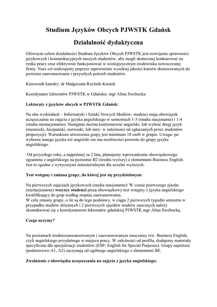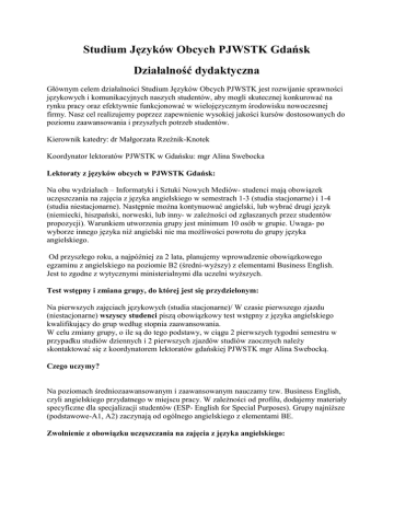 Studium Języków Obcych PJWSTK Gdańsk Działalność dydaktyczna Głównym celem działalności Studium Języków Obcych PJWSTK jest rozwijanie sprawności językowych i komunikacyjnych naszych studentów, aby mogli skutecznej konkurować na rynku pracy oraz efektywnie funkcjonować w wielojęzycznym środowisku nowoczesnej firmy. Nasz cel realizujemy poprzez zapewnienie wysokiej jakości kursów dostosowanych do poziomu zaawansowania i przyszłych potrzeb studentów. Kierownik katedry: dr Małgorzata Rzeźnik-Knotek Koordynator lektoratów PJWSTK w Gdańsku: mgr Alina Swebocka Lektoraty z języków obcych w PJWSTK Gdańsk: Na obu wydziałach – Informatyki i Sztuki Nowych Mediów- studenci mają obowiązek uczęszczania na zajęcia z języka angielskiego w semestrach 1-3 (studia stacjonarne) i 1-4 (studia niestacjonarne). Następnie można kontynuować angielski, lub wybrać drugi język (niemiecki, hiszpański, norweski, lub inny- w zależności od zgłaszanych przez studentów propozycji). Warunkiem utworzenia grupy jest minimum 10 osób w grupie. Uwaga- po wyborze innego języka niż angielski nie ma możliwości powrotu do grupy języka angielskiego. Od przyszłego roku, a najpóźniej za 2 lata, planujemy wprowadzenie obowiązkowego egzaminu z angielskiego na poziomie B2 (średni-wyższy) z elementami Business English. Jest to zgodne z wytycznymi ministerialnymi dla uczelni wyższych. Test wstępny i zmiana grupy, do której jest się przydzielonym: Na pierwszych zajęciach językowych (studia stacjonarne)/ W czasie pierwszego zjazdu (niestacjonarne) wszyscy studenci piszą obowiązkowy test wstępny z języka angielskiego kwalifikujący do grup według stopnia zaawansowania. W celu zmiany grupy, o ile są do tego podstawy, w ciągu 2 pierwszych tygodni semestru w przypadku studiów dziennych i 2 pierwszych zjazdów studiów zaocznych należy skontaktować się z koordynatorem lektoratów gdańskiej PJWSTK mgr Alina Swebocką. Czego uczymy? Na poziomach średniozaawansowanym i zaawansowanym nauczamy tzw. Business English, czyli angielskiego przydatnego w miejscu pracy. W zależności od profilu, dodajemy materiały specyficzne dla specjalizacji studentów (ESP- English for Special Purposes). Grupy najniższe (podstawowe-A1, A2) zaczynają od ogólnego angielskiego z elementami BE. Zwolnienie z obowiązku uczęszczania na zajęcia z języka angielskiego: Istnieje możliwość zwolnienia z lektoratu na warunkach podanych poniżej. Po wydaniu zgody na transferowanie oceny można ubiegać się o redukcję czesnego. Termin składania podań o transferowanie oceny z lektoratu jest podany na stronie Uczelni. Zasady transferowania ocen: 1. ocena z języka angielskiego z innej uczelni - ocena musi być potwierdzona zaświadczeniem z pieczątką Dziekanatu z poprzedniej uczelni. Transferujemy tylko oceny za kursy na poziomie średniozaawansowanym i wyższym. W przypadku braku informacji o poziomie, rezerwujemy prawo odmowy, jeśli Państwa wynik w teście (mniej niż 36 punktów na 50) i/lub rozmowa z lektorem uznającym ocenę wskazuje na poziom niższy. W przypadku transferów z innej uczelni, ostatnia z wystawionych ocen nie może być starsza niż 5 lat. Ocenę przepisuje się semestr za semestr bez względu na tryb studiów. 2. certyfikat CPE (transfer na ocenę 5) lub ekwiwalent (IELTS, TOEIC etc.- ocena w zależności od ilości punktów) 3. certyfikat CAE lub ekwiwalent z oceną minimum B (transfer na ocenę 3), A (transfer na ocenę 4). Certyfikat nie może być starszy niż 5 lat. Aby ubiegać się o transfer oceny z języka angielskiego należy złożyć w Dziekanacie odpowiednie podanie w terminie każdorazowo określonym na stronie Uczelni. Zasady zaliczania kursów językowych: Szczegółowe zasady zawsze ustala lektor prowadzący, ale wszyscy przestrzegamy następujących wytycznych: 1. obecność jest obowiązkowa, to znaczy dopuszczalna liczba nieobecności w semestrze wynosi 4 dla studentów studiów stacjonarnych i 2 dla niestacjonarnych. Po przekroczeniu tej liczby, lektorzy obniżają ocenę. W przypadku przekroczenia limitu 10 nieobecności dla studiów dziennych i 3 dla zaocznych, student nie otrzymuje zaliczenia. Decyzję o trybie jego uzyskania podejmuje Dziekan w porozumieniu z prowadzącym. 2. w semestrze przeprowadzamy minimum 2 testy. W niektórych semestrach jeden z nich może być zastąpiony oceną z prezentacji 'biznesowej'. Egzaminy oferowane studentom: Wzorem innych uczelni, prowadzimy własne, nieobowiązkowe egzaminy z języka angielskiego i wydajemy certyfikaty Business English PJWSTK. Egzaminy są oferowane na poziomie B1, B2 oraz C1 (dla zaawansowanych). W przyszłym roku planujemy poszerzenie oferty egzaminacyjnej o egzamin TOEIC (Test of English for International Communication ). Bliższe informacje na początku nowego roku akademickiego 2014/15. Egzaminów z drugiego języka nie przewidujemy, ale możemy to rozważyć, jeśli będzie takie zapotrzebowanie. . Skład osobowy SJO PJWSTK Gdańsk: mgr Alina Swebocka- koordynator lektoratów z ramienia SJO PJWSTK mgr Ilona Gorczyńska mgr Patrycja Orłowska mgr Anna Tur-Krużycka mgr Izabela Dzudziak mgr Anna Adamczak mgr Aleksandra Dambek mgr Monika Mechlińska-Pauli mgr Agnieszka Szymianiec- język hiszpański mgr Joanna Puzyrewska- język niemiecki mgr Joanna Zakrzewska- język japoński mgr Ewelina Czapowiecka-Kawala- język norweski
