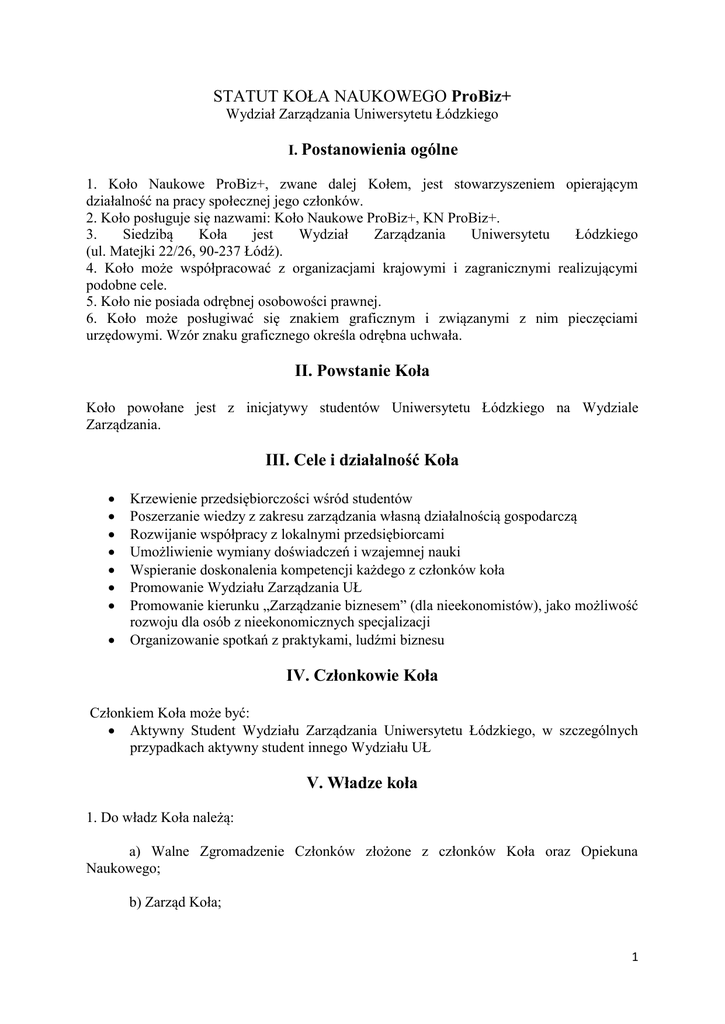 STATUT KOŁA NAUKOWEGO ProBiz+ I. Postanowienia ogólne II