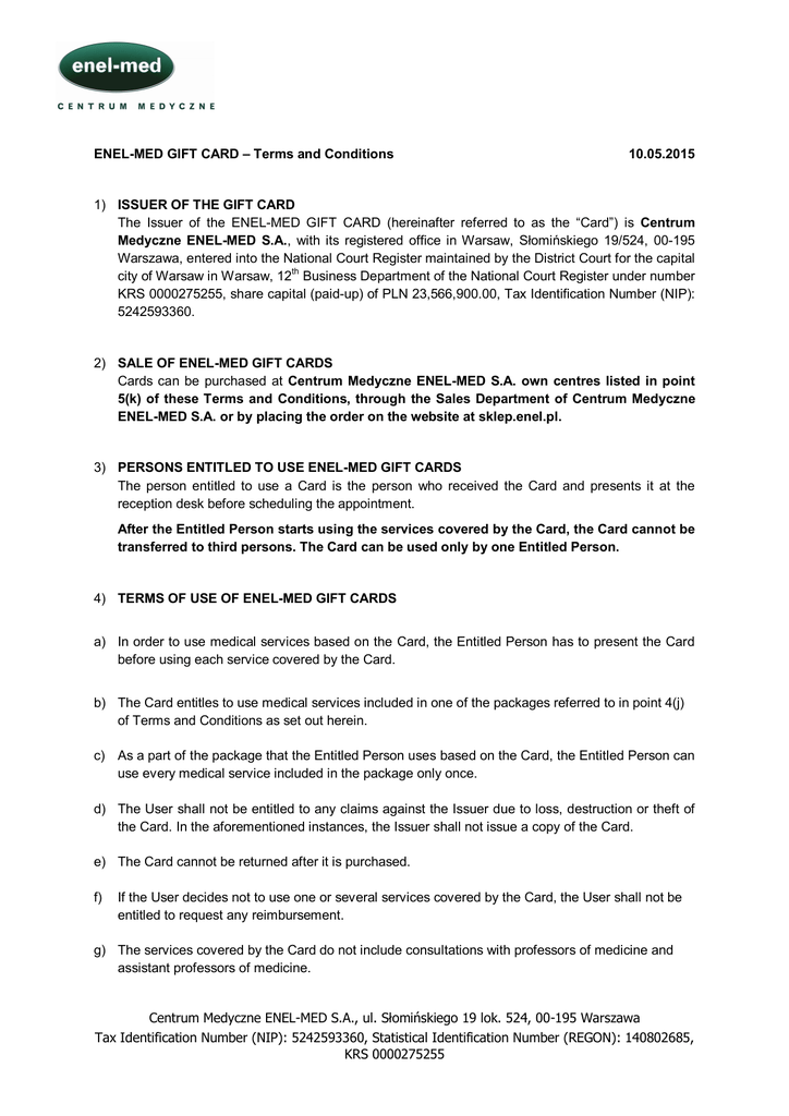 ENEL-MED GIFT CARD – Terms and Conditions 10.05.2015 1) ISSUER OF THE GIFT CARD The Issuer of the ENEL-MED GIFT CARD (hereinafter referred to as the “Card”) is Centrum Medyczne ENEL-MED S.A., with its registered office in Warsaw, Słomińskiego 19/524, 00-195 Warszawa, entered into the National Court Register maintained by the District Court for the capital city of Warsaw in Warsaw, 12th Business Department of the National Court Register under number KRS 0000275255, share capital (paid-up) of PLN 23,566,900.00, Tax Identification Number (NIP): 5242593360. 2) SALE OF ENEL-MED GIFT CARDS Cards can be purchased at Centrum Medyczne ENEL-MED S.A. own centres listed in point 5(k) of these Terms and Conditions, through the Sales Department of Centrum Medyczne ENEL-MED S.A. or by placing the order on the website at sklep.enel.pl. 3) PERSONS ENTITLED TO USE ENEL-MED GIFT CARDS The person entitled to use a Card is the person who received the Card and presents it at the reception desk before scheduling the appointment. After the Entitled Person starts using the services covered by the Card, the Card cannot be transferred to third persons. The Card can be used only by one Entitled Person. 4) TERMS OF USE OF ENEL-MED GIFT CARDS a) In order to use medical services based on the Card, the Entitled Person has to present the Card before using each service covered by the Card. b) The Card entitles to use medical services included in one of the packages referred to in point 4(j) of Terms and Conditions as set out herein. c) As a part of the package that the Entitled Person uses based on the Card, the Entitled Person can use every medical service included in the package only once. d) The User shall not be entitled to any claims against the Issuer due to loss, destruction or theft of the Card. In the aforementioned instances, the Issuer shall not issue a copy of the Card. e) The Card cannot be returned after it is purchased. f) If the User decides not to use one or several services covered by the Card, the User shall not be entitled to request any reimbursement. g) The services covered by the Card do not include consultations with professors of medicine and assistant professors of medicine. Centrum Medyczne ENEL-MED S.A., ul. Słomińskiego 19 lok. 524, 00-195 Warszawa Tax Identification Number (NIP): 5242593360, Statistical Identification Number (REGON): 140802685, KRS 0000275255 h) The “Healthy Child” and “Five Consultations” Cards are also available to children (0-18 years of age). In this case, the services can be carried out by paediatric specialists. Other Cards are intended for adults (above 18 years of age). i) In order to use the medical services covered by the Card, it is necessary to previously schedule an appointment directly at a Centrum Medyczne ENEL-MED S.A. centre or by calling the national Call Centre at 22 23 07 007. j) Scope of Card packages: I. The “Preventive Care” package includes: ultrasound of the abdominal cavity, complete blood count, general urine examination, TSH, glucose in serum, creatinine, lipid profile, transaminases (ALT), and consultation with a specialist in internal medicine. II. The “Healthy Heart” package includes: resting ECG, lipid profile, ultrasound, echocardiogram, and a cardiologist consultation. III. The “Five Consultations” package includes: any 5 specialist consultations, including individual psychological consultations. (do not include dental consultations). IV. The “Healthy Woman” package is dedicated to women up to 45 years of age and it covers breast ultrasound, transvaginal ultrasound, and a gynaecological consultation with (vaginal) gynaecological cytology. The services covered by the Card should be used after a menstrual period between the 5th and the 9th day of the cycle, unless the doctor recommends otherwise. V. The “Healthy Man” package includes: testicular ultrasound (or prostate ultrasound), automated complete blood count, general urine examination, TSH, glucose in serum, creatinine in serum, lipid profile, transaminases (ALT and AST), total PSA, uric acid in serum, and a consultation with a specialist in internal medicine. VI. The “Healthy Spine” package covers 5 spine massages lasting 30 minutes each. VII. The “FIT” package covers a consultation with a dietician and includes preparation of an individual diet for 14 days. VIII. The “Healthy Child” package includes: three paediatric or paediatric specialist consultations and a package of 15% discounts on laboratory examinations (the discounts apply during the term of use of the Card). IX. The “Beautiful Smile” package includes dental check-up performed by a restorative dentist and oral hygiene procedures, including scaling, sandblasting and fluoridation performed by a qualified dental hygienist. X. The whiteCARD package includes a consultation with a dentist and teeth whitening using the Opalescence – Boost in-office method. Centrum Medyczne ENEL-MED S.A., ul. Słomińskiego 19 lok. 524, 00-195 Warszawa Tax Identification Number (NIP): 5242593360, Statistical Identification Number (REGON): 140802685, KRS 0000275255 k) Medical services covered by the Card can be used only at the centres listed below, provided that the particular service is available at the particular centre. Medical services included in the “Beautiful Smile” package can be used only at Centrum Medyczne ENEL-MED S.A. centres that offer dental services. Medical services included in the “whiteCARD” package are available only at the Atrium Centre in Warsaw, Al. Jana Pawła II 29. l) Selecting the card for Warsaw or “other cities” determines the place of using the services based on the card – cards, in the case of which the “other cities” option was selected, will be used at a selected centre outside Warsaw. Own Centrum Medyczne ENEL-MED Centres: 1. 2. 3. 4. 5. 6. 7. 8. 9. 10. 11. 12. 13. GDAŃSK – Grunwaldzka Centre, Aleja Grunwaldzka 163, 80-266 Gdańsk KRAKÓW – 