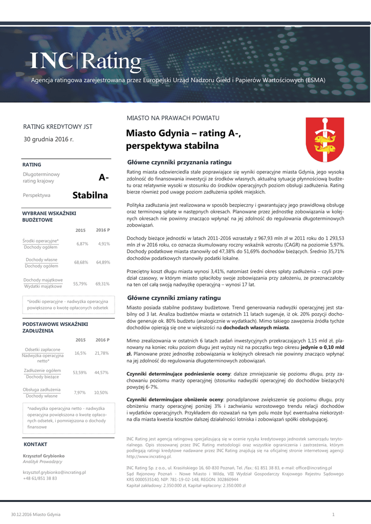 Agencja ratingowa zarejestrowana przez Europejski Urząd Nadzoru Giełd i Papierów Wartościowych (ESMA) MIASTO NA PRAWACH POWIATU RATING KREDYTOWY JST Miasto Gdynia – rating A-, perspektywa stabilna 30 grudnia 2016 r. Główne czynniki przyznania ratingu RATING A- Długoterminowy rating krajowy Perspektywa Stabilna WYBRANE WSKAŹNIKI BUDŻETOWE 2015 2016 P Środki operacyjne* Dochody ogółem 6,87% 4,91% Dochody własne Dochody ogółem 68,68% 64,89% Dochody majątkowe Wydatki majątkowe 55,79% 69,31% *środki operacyjne - nadwyżka operacyjna powiększona o kwotę opłaconych odsetek PODSTAWOWE WSKAŹNIKI ZADŁUŻENIA 2015 2016 P Odsetki zapłacone Nadwyżka operacyjna netto* 16,5% 21,78% Zadłużenie ogółem Dochody bieżące 53,59% 44,57% Obsługa zadłużenia Dochody własne 7,97% 10,50% *nadwyżka operacyjna netto - nadwyżka operacyjna powiększona o kwotę opłaconych odsetek, i pomniejszona o dochody finansowe KONTAKT Krzysztof Grybionko Analityk Prowadzący [email protected] +48 61/851 38 83 30.12.2016 Miasto Gdynia Rating miasta odzwierciedla stale poprawiające się wyniki operacyjne miasta Gdynia, jego wysoką zdolność do finansowania inwestycji ze środków własnych, aktualną sytuację płynnościową budżetu oraz relatywnie wysoki w stosunku do środków operacyjnych poziom obsługi zadłużenia. Rating bierze również pod uwagę poziom zadłużenia spółek miejskich. Polityka zadłużania jest realizowana w sposób bezpieczny i gwarantujący jego prawidłową obsługę oraz terminową spłatę w następnych okresach. Planowane przez jednostkę zobowiązania w kolejnych okresach nie powinny znacząco wpłynąć na jej zdolność do regulowania długoterminowych zobowiązań. Dochody bieżące jednostki w latach 2011-2016 wzrastały z 967,93 mln zł w 2011 roku do 1 293,53 mln zł w 2016 roku, co oznacza skumulowany roczny wskaźnik wzrostu (CAGR) na poziomie 5,97%. Dochody podatkowe miasta stanowiły od 47,38% do 51,69% dochodów bieżących. Średnio 35,71% dochodów podatkowych stanowiły podatki lokalne. Przeciętny koszt długu miasta wynosi 3,41%, natomiast średni okres spłaty zadłużenia – czyli przedział czasowy, w którym miasto spłaciłoby swoje zobowiązania przy założeniu, że przeznaczałoby na ten cel całą swoją nadwyżkę operacyjną – wynosi 17 lat. Główne czynniki zmiany ratingu Miasto posiada stabilne podstawy budżetowe. Trend generowania nadwyżki operacyjnej jest stabilny od 3 lat. Analiza budżetów miasta w ostatnich 11 latach sugeruje, iż ok. 20% pozycji dochodów generuje ok. 80% budżetu (analogicznie w wydatkach). Mimo takiego zawężenia źródła tychże dochodów opierają się one w większości na dochodach własnych miasta. Mimo zrealizowania w ostatnich 6 latach zadań inwestycyjnych przekraczających 1,15 mld zł, planowany na koniec roku poziom długu jest wyższy niż na początku tego okresu jedynie o 0,10 mld zł. Planowane przez jednostkę zobowiązania w kolejnych okresach nie powinny znacząco wpłynąć na jej zdolność do regulowania długoterminowych zobowiązań. Czynniki determinujące podniesienie oceny: dalsze zmniejszanie się poziomu długu, przy zachowaniu poziomu marży operacyjnej (stosunku nadwyżki operacyjnej do dochodów bieżących) powyżej 6-7%. Czynniki determinujące obniżenie oceny: ponadplanowe zwiększenie się poziomu długu, przy obniżeniu marży operacyjnej poniżej 3% i zachwianiu wzrostowego trendu relacji dochodów i wydatków operacyjnych. Przykładem do rozważań na tym polu może być ewentualna niekorzystna dla miasta kwestia kosztów dalszej działalności lotniska i zobowiązań spółki obsługującej. INC Rating jest agencją ratingową specjalizującą się w ocenie ryzyka kredytowego jednostek samorządu terytorialnego. Opis stosowanej przez INC Rating metodologii oraz wszystkie ograniczenia i zastrzeżenia, którym podlegają ratingi kredytowe nadawane przez INC Rating znajdują się na oficjalnej stronie internetowej agencji http://www.incrating.pl. INC Rating Sp. z o.o., ul. Krasińskiego 16, 60-830 Poznań, Tel. /fax.: 61 851 38 83, e-mail: [email protected] Sąd Rejonowy Poznań - Nowe Miasto i Wilda, VIII Wydział Gospodarczy Krajowego Rejestru Sądowego KRS 0000535140, NIP: 781-19-02-148, REGON: 302860944 Kapitał zakładowy: 2.350.000 zł, Kapitał wpłacony: 2.350.000 zł 1 Wybrane wskaźniki finansowe WSKAŹNIK 2011 2012 2013 2014 2015 Nadwyżka operacyjna netto / Dochody bieżące netto 3,80% 1,79% 3,34% 4,80% 7,33% 5,19% 4,38% Nadwyżka operacyjna / Dochody bieżące 3,42% 0,13% 1,80% 2,70% 6,28% 4,15% 3,08% Nadwyżka (deficyt) / Dochody ogółem -7,96% -5,20% -12,32% -0,76% -0,84% 0,74% -4,39% Wolne środki / Dochody ogółem 12,16% 8,25% 1,05% 3,15% 3,17% 0,00% 4,63% Środki operacyjne / Dochody ogółem 4,92% 2,16% 3,54% 3,85% 6,87% 4,91% 4,37% 108 734,65% -96,19% 1 360,64% 53,64% 150,94% -24,61% 18 363,18% -1,15% 1,70% 3,68% 8,49% 8,54% 6,39% 4,61% 5,49% 5,91% 10,77% 6,32% 1,99% -4,20% 4,38% Zmiana zadłużenia ogółem (zmiana w ciągu roku) 5,96% 6,04% 11,00% 6,32% 1,99% -1,70% 4,93% Odsetki zapłacone / Nadwyżka operacyjna netto 48,14% 133,70% 61,45% 35,28% 16,50% 21,78% 52,81% 19,16% 12,21% 19,75% 6,23% 7,97% 10,50% 12,64% 13,53% 8,62% 13,87% 4,63% 5,97% 7,33% 8,99% 258,80% 344,20% 361,02% 105,27% 79,76% 138,95% 214,67% Zadłużenie bezpośrednie / Dochody bieżące 48,87% 50,85% 54,07% 56,16% 53,12% 44,57% 51,27% Zadłużenie ogółem / Dochody bieżące 49,03% 50,96% 54,22% 56,48% 53,59% 44,57% 51,47% 14,27 396,40 30,06 20,80 8,45 10,74 - Zadłużenie ogółem / Dochody własne 69,43% 72,21% 77,21% 75,88% 71,53% 63,84% 71,69% Zadłużenie bezpośrednie / Dochody własne 69,20% 72,07% 77,00% 75,46% 70,90% 63,84% 71,41% 30,40% 38,27% 45,05% 55,34% 50,25% 44,57% 43,98% 9,94% 6,67% 5,52% 4,10% 5,31% 7,65% 6,53% Dochody podatkowe / Dochody bieżące 51,69% 50,42% 48,71% 49,73% 49,67% 47,38% 49,60% Podatki lokalne / Dochody podatkowe ogółem 39