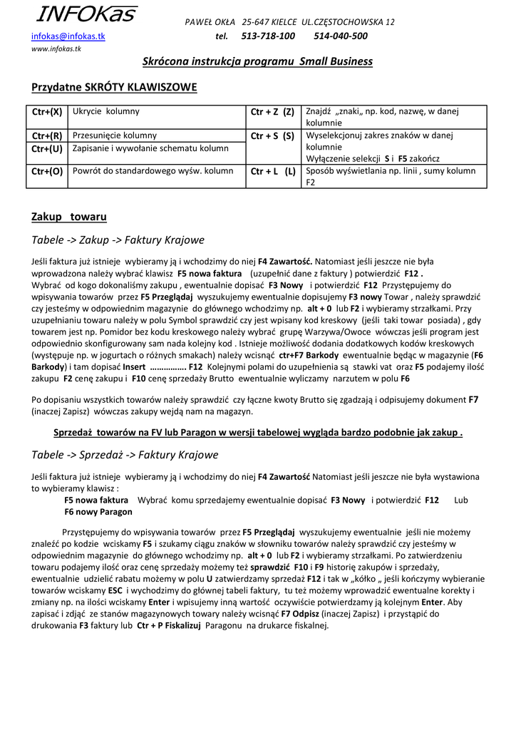 [email protected] PAWEŁ OKŁA 25-647 KIELCE UL.CZĘSTOCHOWSKA 12 tel. 513-718-100 514-040-500 www.infokas.tk Skrócona instrukcja programu Small Business Przydatne SKRÓTY KLAWISZOWE Ctr+(X) Ukrycie kolumny Ctr + Z (Z) Ctr+(R) Przesunięcie kolumny Ctr+(U) Zapisanie i wywołanie schematu kolumn Ctr + S (S) Ctr+(O) Powrót do standardowego wyśw. kolumn Ctr + L (L) Znajdź „znaki„ np. kod, nazwę, w danej kolumnie Wyselekcjonuj zakres znaków w danej kolumnie Wyłączenie selekcji S i F5 zakończ Sposób wyświetlania np. linii , sumy kolumn F2 Zakup towaru Tabele -> Zakup -> Faktury Krajowe Jeśli faktura już istnieje wybieramy ją i wchodzimy do niej F4 Zawartość. Natomiast jeśli jeszcze nie była wprowadzona należy wybrać klawisz F5 nowa faktura (uzupełnić dane z faktury ) potwierdzić F12 . Wybrać od kogo dokonaliśmy zakupu , ewentualnie dopisać F3 Nowy i potwierdzić F12 Przystępujemy do wpisywania towarów przez F5 Przeglądaj wyszukujemy ewentualnie dopisujemy F3 nowy Towar , należy sprawdzić czy jesteśmy w odpowiednim magazynie do głównego wchodzimy np. alt + 0 lub F2 i wybieramy strzałkami. Przy uzupełnianiu towaru należy w polu Symbol sprawdzić czy jest wpisany kod kreskowy (jeśli taki towar posiada) , gdy towarem jest np. Pomidor bez kodu kreskowego należy wybrać grupę Warzywa/Owoce wówczas jeśli program jest odpowiednio skonfigurowany sam nada kolejny kod . Istnieje możliwość dodania dodatkowych kodów kreskowych (występuje np. w jogurtach o różnych smakach) należy wcisnąć ctr+F7 Barkody ewentualnie będąc w magazynie (F6 Barkody) i tam dopisać Insert ……………. F12 Kolejnymi polami do uzupełnienia są stawki vat oraz F5 podajemy ilość zakupu F2 cenę zakupu i F10 cenę sprzedaży Brutto ewentualnie wyliczamy narzutem w polu F6 Po dopisaniu wszystkich towarów należy sprawdzić czy łączne kwoty Brutto się zgadzają i odpisujemy dokument F7 (inaczej Zapisz) wówczas zakupy wejdą nam na magazyn. Sprzedaż towarów na FV lub Paragon w wersji tabelowej wygląda bardzo podobnie jak zakup . Tabele -> Sprzedaż -> Faktury Krajowe Jeśli faktura już istnieje wybieramy ją i wchodzimy do niej F4 Zawartość Natomiast jeśli jeszcze nie była wystawiona to wybieramy klawisz : F5 nowa faktura Wybrać komu sprzedajemy ewentualnie dopisać F3 Nowy i potwierdzić F12 Lub F6 nowy Paragon Przystępujemy do wpisywania towarów przez F5 Przeglądaj wyszukujemy ewentualnie jeśli nie możemy znaleźć po kodzie wciskamy F5 i szukamy ciągu znaków w słowniku towarów należy sprawdzić czy jesteśmy w odpowiednim magazynie do głównego wchodzimy np. alt + 0 lub F2 i wybieramy strzałkami. Po zatwierdzeniu towaru podajemy ilość oraz cenę sprzedaży możemy też sprawdzić F10 i F9 historię zakupów i sprzedaży, ewentualnie udzielić rabatu możemy w polu U zatwierdzamy sprzedaż F12 i tak w „kółko „ jeśli kończymy wybieranie towarów wciskamy ESC i wychodzimy do głównej tabeli faktury, tu też możemy wprowadzić ewentualne korekty i zmiany np. na ilości wciskamy Enter i wpisujemy inną wartość oczywiście potwierdzamy ją kolejnym Enter. Aby zapisać i zdjąć ze stanów magazynowych towary należy wcisnąć F7 Odpisz (inaczej Zapisz) i przystąpić do drukowania F3 faktury lub Ctr + P Fiskalizuj Paragonu na drukarce fiskalnej. [email protected] PAWEŁ OKŁA 25-647 KIELCE UL.CZĘSTOCHOWSKA 12 tel. 513-718-100 514-040-500 www.infokas.tk Inwentaryzacja skrócona w Programie Small Business Instrukcja dodatkowa dostępna na stronie : http://www.infokas-kielce.strefa.pl/inwentaryzacja.html Podstawowe kroki przed inwentaryzacją : 1.Zakończyć dzień na kasie fiskalnej (czyli odczytać i odpisać sprzedaż z magazynu) 2 Sprawdzić czy wszystkie dokumenty zostały odpisane (zakupy , wz , paragony, Faktury sprzedaży i tp. Miesiące->Funkcje Serwisowe->Dokumenty które należy odpisać 3. Jeśli mamy INWENTARYZATOR należy go zaprogramować „świeżymi” Towarami Miesiące->Inne Urządzenie->Inwentaryzatory->Inwentaryzator1..4 Opcja ZAŁADOWANIE TOWARÓW , a w kolektorze np. 422 (czekać aż się towary prześlą i zaindeksują) Mając przygotowane i sprawdzone dane przystępujemy do Inwentaryzacji Raporty->Inwentura->Protokół Różnic Korekta Stanów Widzimy rejestr protokołów F5 nowy protokół i uzupełniamy parametry : F2 Cena – Cena1, F3 Data –ustawić na dzień wykonywania zliczeń, F4- wybieramy magazyn w którym robimy inwentaryzacje oraz w F5 i F6 zwężamy listę towarów do Grup i Kategorii np. jeśli mamy grupę Pieczywo najczęściej nie chcemy zliczać danego asortymentu , wówczas należy odznaczyć taką grupę , tak samo np. Doładowania telefoniczne. Kolejnym parametrem jest F7 Stan rzeczywisty i jeśli robimy pełną inwentaryzację należy zaznaczyć opcję Wstępnie Wyzeruj (czyli podczas pobierania towarów z magazynów kolumna stan rzeczywisty zostanie wyzerowana- pusta ) natomiast Ustal według komputera w protokole zostaną wprowadzone ilości jakie są na stanie według komputera (taką opcję wykorzystujemy jeśli chcemy dokonać tylko niewielkich korekt na stanie). W starszych wersjach programu mamy F4 wypełnij i dalej postępujemy jak wyżej. Po przygotowaniu takiej listy towarów przystępujemy do wprowadzania danych (ilości oraz jeśli system wymaga cen zakupu ) F5 wprowadź ręcznie , lub Z znajdź i Enter na Stan rzeczywisty. Możemy również przez F7 z Inwentaryzatora wczytujemy dane zliczone w Kolektorze uruchamiamy np. 411 Uwaga po wczytaniu z kolektora zaleca się skasować dany dokument tak aby nie zdublować zliczeń przy kolejnym zaczytywaniu. Uwaga jeśli wyszliśmy z programu , zrobiliśmy np. jakąś przerwę a już wprowadziliśmy część towarów NIE WOLNO wciskać F4 POBIERZ DANE lub F5 NOWY PROTOKÓŁ gdyż się wszystko wyzeruje i na nowo musimy jeszcze raz liczyć. Należy odnaleźć właściwy protokół w rejestrze (prawdopodobnie ostatni na samym dole ) i wej