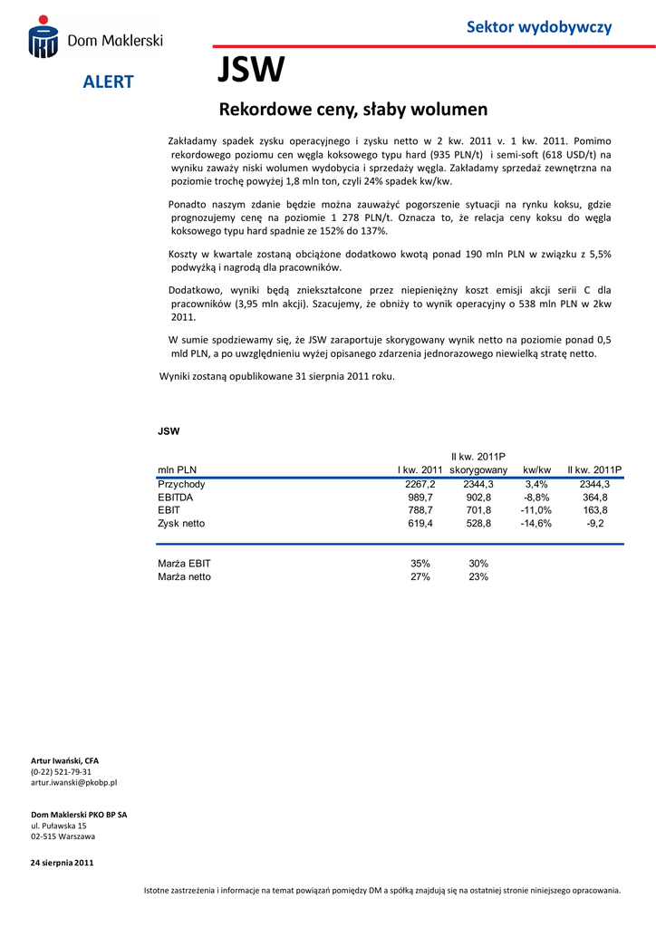 Sektor wydobywczy JSW ALERT Rekordowe ceny, słaby wolumen Zakładamy spadek zysku operacyjnego i zysku netto w 2 kw. 2011 v. 1 kw. 2011. Pomimo rekordowego poziomu cen węgla koksowego typu hard (935 PLN/t) i semi-soft (618 USD/t) na wyniku zaważy niski wolumen wydobycia i sprzedaży węgla. Zakładamy sprzedaż zewnętrzna na poziomie trochę powyżej 1,8 mln ton, czyli 24% spadek kw/kw. Ponadto naszym zdanie będzie można zauważyć pogorszenie sytuacji na rynku koksu, gdzie prognozujemy cenę na poziomie 1 278 PLN/t. Oznacza to, że relacja ceny koksu do węgla koksowego typu hard spadnie ze 152% do 137%. Koszty w kwartale zostaną obciążone dodatkowo kwotą ponad 190 mln PLN w związku z 5,5% podwyżką i nagrodą dla pracowników. Dodatkowo, wyniki będą zniekształcone przez niepieniężny koszt emisji akcji serii C dla pracowników (3,95 mln akcji). Szacujemy, że obniży to wynik operacyjny o 538 mln PLN w 2kw 2011. W sumie spodziewamy się, że JSW zaraportuje skorygowany wynik netto na poziomie ponad 0,5 mld PLN, a po uwzględnieniu wyżej opisanego zdarzenia jednorazowego niewielką stratę netto. Wyniki zostaną opublikowane 31 sierpnia 2011 roku. JSW mln PLN Przychody EBITDA EBIT Zysk netto MarŜa EBIT MarŜa netto II kw. 2011P I kw. 2011 skorygowany 2267,2 2344,3 989,7 902,8 788,7 701,8 619,4 528,8 35% 27% kw/kw 3,4% -8,8% -11,0% -14,6% II kw. 2011P 2344,3 364,8 163,8 -9,2 30% 23% Artur Iwański, CFA (0-22) 521-79-31 [email protected] Dom Maklerski PKO BP SA ul. Puławska 15 02-515 Warszawa 24 sierpnia 2011 Istotne zastrzeżenia i informacje na temat powiązań pomiędzy DM a spółką znajdują się na ostatniej stronie niniejszego opracowania. Dom Maklerski PKO Bank Polski SA ul. Puławska 15, 02-515 Warszawa tel. (0-22) 521-80-00, fax (0-22) 521-79-46 e-mail: [email protected] Telefony kontaktowe Wydział Analiz Rynkowych Dyrektor Przemysł paliwowy, chemiczny, spożywczy Sektor energetyczny, deweloperski Handel, media, telekomunikacja, informatyka Sektor wydobywczy, materiały budowlane E-commerce, analiza techniczna Grzegorz Zawada, CFA (022) 521 79 43 [email protected] Monika Kalwasińska (022) 521 79 41 [email protected] Stanisław Ozga, CFA (022) 521 79 13 [email protected] Włodzimierz Giller (022) 521 79 17 [email protected] Artur Iwański, CFA (022) 521 79 31 [email protected] Przemysław Smoliński (022) 521 79 10 [email protected] Wydział Klientów Instytucjonalnych Dariusz Andrzejak Krzysztof Kubacki Tomasz Ilczyszyn Tomasz Zabrocki (0-22) 521 91 39 [email protected] (0-22) 521 82 10 [email protected] (0-22) 521 82 10 [email protected] (0-22) 521-82-13 [email protected] Piotr Dedecjus Magdalena Kupiec Paweł Kochut (0-22) 521 91 40 [email protected] (0-22) 521 91 50 [email protected] (0-22) 521-82-14 [email protected] Objaśnienie używanej terminologii fachowej min (max) 52 tyg - minimum ( maksimum) kursu rynkowego akcji w okresie ostatnich 52 tygodni kapitalizacja - iloczyn ceny rynkowej akcji i liczby akcji EV - suma kapitalizacji i długu netto spółki free float (%) - udział liczby akcji ogółem pomniejszonej o 5% pakiety akcji znajdujące się w posiadaniu jednego akcjonariusza i akcje własne należące do spółki, w ogólnej liczbie akcji śr obrót/msc - średni obrót na miesiąc obliczony jako suma wartości obrotu za ostatnie 12 miesięcy podzielona przez 12 ROE - stopa zwrotu z kapitałów własnych ROA - stopa zwrotu z aktywów EBIT - zysk operacyjny EBITDA - zysk operacyjny + amortyzacja EPS - zysk netto na 1 akcję DPS - dywidenda na 1 akcję CEPS - suma zysku netto i amortyzacji na 1 akcję P/E - iloraz ceny rynkowej akcji i EPS P/BV - iloraz ceny rynkowej akcji i wartości księgowej jednej akcji EV/EBITDA - iloraz kapitalizacji powiększonej o dług netto spółki oraz EBITDA marża brutto na sprzedaży - relacja zysku brutto na sprzedaży do przychodów netto ze sprzedaży marża EBITDA - relacja sumy zysku operacyjnego i amortyzacji do przychodów netto ze sprzedaży marża EBIT - relacja zysku operacyjnego do przychodów netto ze sprzedaży rentowność netto - relacja zysku netto do przychodów netto ze sprzedaży Rekomendacje stosowane przez DM KUPUJ - uważamy, że akcje spółki posiadają co najmniej 15% potencjał wzrostu AKUMULUJ - uważamy, że akcje spółki posiadają potencjał wzrostu nie większy niż 15% NEUTRALNIE - oczekujemy względnie stabilnych notowań akcji spółki REDUKUJ - uważamy, że akcje spółki posiadają potencjał spadku nie większy niż 15% SPRZEDAJ - uważamy, że akcje spółki posiadają co najmniej 15% potencjał spadku Rekomendacje wydawane przez DM obowiązują przez okres 12 miesięcy od daty wydania lub do momentu zrealizowania kursu docelowego, chyba, że w tym okresie zostaną zaktualizowane. DM dokonuje aktualizacji wydawanych rekomendacji w zależności od sytuacji rynkowej i subiektywnej oceny analityków. Częstotliwość takich aktualizacji nie jest określona. Zastrzeżenie o spekulacyjnym charakterze rekomendacji oznacza, że horyzont inwestycji jest skrócony do 3 miesięcy, a inwestycja jest obarczona podwyższonym ryzykiem. Stosowane metody wyceny DM opiera się zasadniczo na trzech metodach wyceny: DCF (model zdyskontowanych przepływów pieniężnych), metoda wskaźnikowa (porównanie wartości podstawowych wskaźników rynkowych z podobnymi wskaźnikami dla innych firm reprezentujących dany sektor) oraz model zdyskontowanych dywidend. Wadą metody DCF oraz modelu zdyskontowanych dywidend jest duża wrażliwość na przyjęte założenia, w szczególności te, które odnoszą się do określenia wartości rezydualnej. Modelu zdyskontowanych dywidend nie można ponadto zastosować w przypadku wyceny spółek nie mających ukształtowanej polityki dywidendowej. Zaletami obydwu wymienionych metod jest ich niezależność w stosunku do bieżących wycen rynkowych porównywalnych spółek. Zaletą metody wskaźnikowej jest z kolei to, że bazuje ona na wymiernej wycenie rynko