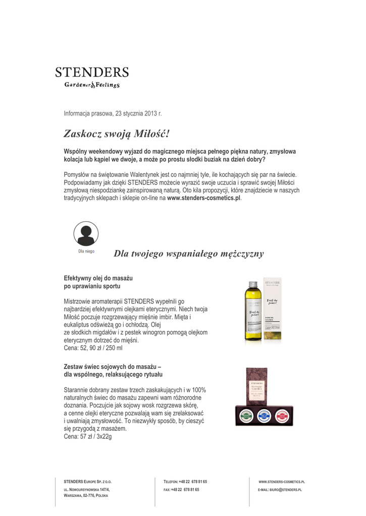 Informacja prasowa, 23 stycznia 2013 r. Zaskocz swoją Miłość! Wspólny weekendowy wyjazd do magicznego miejsca pełnego piękna natury, zmysłowa kolacja lub kąpiel we dwoje, a może po prostu słodki buziak na dzień dobry? Pomysłów na świętowanie Walentynek jest co najmniej tyle, ile kochających się par na świecie. Podpowiadamy jak dzięki STENDERS możecie wyrazić swoje uczucia i sprawić swojej Miłości zmysłową niespodziankę zainspirowaną naturą. Oto kila propozycji, które znajdziecie w naszych tradycyjnych sklepach i sklepie on-line na www.stenders-cosmetics.pl. Dla twojego wspaniałego mężczyzny Efektywny olej do masażu po uprawianiu sportu Mistrzowie aromaterapii STENDERS wypełnili go najbardziej efektywnymi olejkami eterycznymi. Niech twoja Miłość poczuje rozgrzewający mięśnie imbir. Mięta i eukaliptus odświeżą go i ochłodzą. Olej ze słodkich migdałów i z pestek winogron pomogą olejkom eterycznym dotrzeć do mięśni. Cena: 52, 90 zł / 250 ml Zestaw świec sojowych do masażu – dla wspólnego, relaksującego rytuału Starannie dobrany zestaw trzech zaskakujących i w 100% naturalnych świec do masażu zapewni wam różnorodne doznania. Poczujcie jak sojowy wosk rozgrzewa skórę, a cenne olejki eteryczne pozwalają wam się zrelaksować i uwalniają zmysłowość. To niezwykły sposób, by cieszyć się przygodą z masażem. Cena: 57 zł / 3x22g STENDERS EUROPE SP. Z O.O. TELEFON: +48 22 678 81 65 WWW.STENDERS-COSMETICS.PL UL. NOWOURSYNOWSKA 147/4, FAX: +48 22 E-MAIL: [email protected] WARSZAWA, 02-776, POLSKA 678 81 65 Musująca kula do kąpieli „SEX” w kształcie serca Ta ręcznie wykonana kula do kąpieli wypełni łazienkę aromatem pełnym pasji. Gdy twoja Miłość będzie cieszyć się rytuałem kąpieli, jego skórą zaopiekują się sól morska i olej z pestek winogron. Gra zapachów płynących z olejków eterycznych z drzewa sandałowego i paczuli zainspiruje was do zmysłowej przygody. Cena: ok. 20 zł / 130g Niech każdy jej dzień stanie się luksusowy! 24-karatowy Złoty Eliksir do kąpieli Już żony starożytnych faraonów egipskich znały wartość kąpieli w złocie. Połączenie nowoczesnych technologii i dóbr natury zapewnia jeszcze bardziej wydajne działanie skarbów natury. Ekskluzywny zapach pozostawi elegancki aromat na skórze jeszcze długo po kąpieli. Cena: 69, 90 zł / 250 ml 24-karatowe Złote Mydło Ekskluzywne Złote Mydło wniesie wyjątkową atmosferę do jej łazienki. Drobiny złota ukryte w mydle, docierają podczas mycia do głębszych warstw skóry i pomagają regenerować się jej komórkom. Wyciąg z granatów uprawianych w południowym słońcu, to znakomite źródło przeciwutleniaczy, które dodatkowo odnowią skórę. Cena: 47, 90 zł / 115 g Truskawkowe mydło w kształcie serca Nasze ręcznie wykonane, urocze mydło w kształcie serca, oczyści jej skórę, wnosząc aromat słodkich pól truskawek. Drobiny z truskawek, będą ożywiająco masować jej skórę, a naturalny olej z pestek moreli zadba o jej nawilżenie i gładkość. Cena: 21,90 zł / 100g Musująca kula do kąpieli „EROTICA” w kształcie serca Ta ręcznie wykonana kula do kąpieli wypełni łazienkę bukietem zmysłowego aromatu. Gdy twoja Miłość będzie cieszyć się rytuałem kąpieli, jej skórą zaopiekują się sól morska i olej z pestek winogron. Poczujcie zmysłową grę olejków aromatycznych z drzewa sandałowego i ylang-ylang, które wprawią Was w romantyczny nastrój. Cena: ok 20 zł / 130 g Świeca sojowa do masażu ciała „EROS” To zaskakujący i w pełni naturalny produkt z wosku sojowego, pełen wartościowych olejków eterycznych. Dzięki niemu odkryjecie romantyczną przygodę z masażem. Poczujcie jak sojowy wosk rozgrzewa skórę, a cenne olejki eteryczne pozwolą wam się zrelaksować i uwolnią zmysłowość. Cena: 21 zł / 22g *** STENDERS to ogrodnik uczuć. Pochodzi z północnej Europy, gdzie czerpiąc z roślin i kwiatów, tworzy nowatorskie, unikalne kosmetyki inspirowane naturą. Każdy powstały w ten sposób produkt wprowadza naturę w miejski tryb życia. STENDERS sprawia, że dzień rozkwita, a oczy błyszczą. Nasyca uczuciami wszystko wokół – Ciebie, Twoją łazienkę, Twoją ulicę oraz ludzi, którzy Cię otaczają. STENDERS to zespół kreatywnych, radosnych i twórczych osób, zafascynowanych wyjątkowymi kosmetykami – zdrowszymi, bogatszymi i pełnymi doznań. Uczucia uchwyciliśmy w ponad 300 unikalnych produktach kosmetycznych, które mieszkają blisko 200 butikach na całym świecie. W Polsce STENDERS obecny jest od 2003 roku. Posiada 7 sklepów firmowych w takich miastach jak: Warszawa, Kraków, Poznań, Katowice oraz Łódź. Więcej informacji: Joanna Kukla Marketing & PR Manager STENDERS Europe Sp. z o.o. tel. +48 600 213 001 e-mail: [email protected]