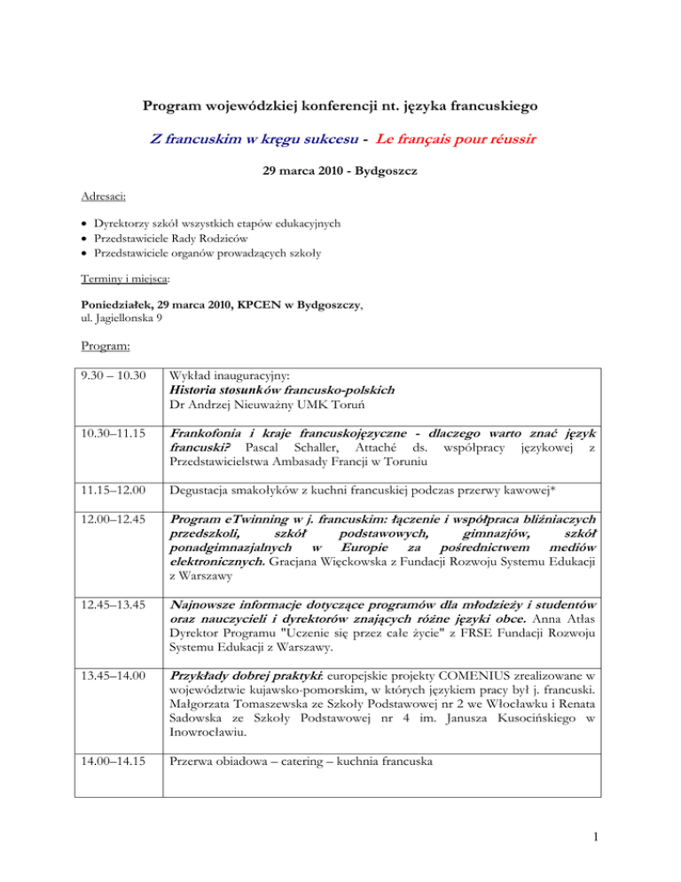 Program wojewódzkiej konferencji nt. języka francuskiego Z francuskim w kręgu sukcesu - Le français pour réussir 29 marca 2010 - Bydgoszcz Adresaci: • Dyrektorzy szkół wszystkich etapów edukacyjnych • Przedstawiciele Rady Rodziców • Przedstawiciele organów prowadzących szkoły Terminy i miejsca: Poniedziałek, 29 marca 2010, KPCEN w Bydgoszczy, ul. Jagiellonska 9 Program: 9.30 – 10.30 Wykład inauguracyjny: Historia stosunków francusko-polskich Dr Andrzej NieuwaŜny UMK Toruń 10.30–11.15 Frankofonia i kraje francuskojęzyczne - dlaczego warto znać język francuski? Pascal Schaller, Attaché ds. współpracy językowej z Przedstawicielstwa Ambasady Francji w Toruniu 11.15–12.00 Degustacja smakołyków z kuchni francuskiej podczas przerwy kawowej* 12.00–12.45 Program eTwinning w j. francuskim: łączenie i współpraca bliźniaczych przedszkoli, szkół podstawowych, gimnazjów, szkół ponadgimnazjalnych w Europie za pośrednictwem mediów elektronicznych. Gracjana Więckowska z Fundacji Rozwoju Systemu Edukacji z Warszawy 12.45–13.45 Najnowsze informacje dotyczące programów dla młodzieŜy i studentów oraz nauczycieli i dyrektorów znających róŜne języki obce. Anna Atłas Dyrektor Programu "Uczenie się przez całe Ŝycie" z FRSE Fundacji Rozwoju Systemu Edukacji z Warszawy. 13.45–14.00 Przykłady dobrej praktyki: europejskie projekty COMENIUS zrealizowane w województwie kujawsko-pomorskim, w których językiem pracy był j. francuski. Małgorzata Tomaszewska ze Szkoły Podstawowej nr 2 we Włocławku i Renata Sadowska ze Szkoły Podstawowej nr 4 im. Janusza Kusocińskiego w Inowrocławiu. 14.00–14.15 Przerwa obiadowa – catering – kuchnia francuska 1 14.15–15.00 Perspektywy pracy we francuskich firmach. Joanna Jaroch Kierownik Działu ds. Rozwoju Usług z Francuskiej Izby Przemysłowo-Handlowej w Warszawie oraz przykłady kariery w firmie francuskiej w województwie kujawsko-pomorskim dla osób władających j. francuskiem (Fabryka Bonduelle w Gniewkowie) 15.00–15.30 Fundusz współpracy francusko-polskiej wsparciem dla partnerów zainteresowanych kształceniem zawodowym. Joanna Jaroch Kierownik Działu ds. Rozwoju Usług z Francuskiej Izby Przemysłowo-Handlowej w Warszawie 15.30-16.15 Języki obce w szkołach naszego województwa. Ewa Jaśkowska, koordynator ds. nauczania języków obcych, st. wizytator w Kuratorium Oświaty w Bydgoszczy 16.15-16.30 Pierwsze kroki w języku francuskim – krótka lekcja francuskiego dla uczestników konferencji. ElŜbieta Bonowicz Toruń *Menu przygotowane przez Restaurację SAN MARCO z Torunia: O godzinie 18.30 organizatorzy zapraszają na pierwszy w naszym województwie koncert w wykonaniu Diany Świder Paris, Paris … piosenka francuska, który odbędzie się w Akademickiej Przestrzeni Kulturalnej WSG w Bydgoszczy ul. Garbary 2. Organizatorzy: • Departament Edukacji, Sportu i Turystyki Urzędu Marszałkowskiego w Toruniu www.kujawsko-pomorskie.pl • Kujawsko-Pomorskie Kuratorium Oświaty www.kuratorium.uwoj.bydgoszcz.pl • Ambasada Francji w Polsce www.ambafrance-pl.org • Kujawsko-Pomorskie Centrum Edukacji Nauczycieli w Bydgoszczy www.cen.bydgoszcz.pl • Kujawsko-Pomorskie Centrum Edukacji Nauczycieli w Toruniu www.kpcen-torun.edu.pl • PROF-EUROPE Stowarzyszenie Nauczycieli Języka Francuskiego www.profeurope.pl ________________________________________________________________ 2