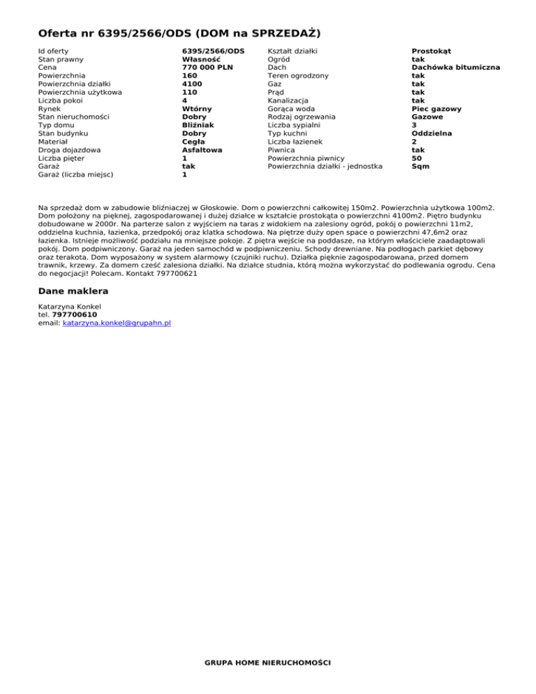 Oferta nr 6395/2566/ODS (DOM na SPRZEDAŻ) Id oferty Stan prawny Cena Powierzchnia Powierzchnia działki Powierzchnia użytkowa Liczba pokoi Rynek Stan nieruchomości Typ domu Stan budynku Materiał Droga dojazdowa Liczba pięter Garaż Garaż (liczba miejsc) 6395/2566/ODS Własność 770 000 PLN 160 4100 110 4 Wtórny Dobry Bliźniak Dobry Cegła Asfaltowa 1 tak 1 Kształt działki Ogród Dach Teren ogrodzony Gaz Prąd Kanalizacja Gorąca woda Rodzaj ogrzewania Liczba sypialni Typ kuchni Liczba łazienek Piwnica Powierzchnia piwnicy Powierzchnia działki - jednostka Prostokąt tak Dachówka bitumiczna tak tak tak tak Piec gazowy Gazowe 3 Oddzielna 2 tak 50 Sqm Na sprzedaż dom w zabudowie bliźniaczej w Głoskowie. Dom o powierzchni całkowitej 150m2. Powierzchnia użytkowa 100m2. Dom położony na pięknej, zagospodarowanej i dużej działce w kształcie prostokąta o powierzchni 4100m2. Piętro budynku dobudowane w 2000r. Na parterze salon z wyjściem na taras z widokiem na zalesiony ogród, pokój o powierzchni 11m2, oddzielna kuchnia, łazienka, przedpokój oraz klatka schodowa. Na piętrze duży open space o powierzchni 47,6m2 oraz łazienka. Istnieje możliwość podziału na mniejsze pokoje. Z piętra wejście na poddasze, na którym właściciele zaadaptowali pokój. Dom podpiwniczony. Garaż na jeden samochód w podpiwniczeniu. Schody drewniane. Na podłogach parkiet dębowy oraz terakota. Dom wyposażony w system alarmowy (czujniki ruchu). Działka pięknie zagospodarowana, przed domem trawnik, krzewy. Za domem cześć zalesiona działki. Na działce studnia, którą można wykorzystać do podlewania ogrodu. Cena do negocjacji! Polecam. Kontakt 797700621 Dane maklera Katarzyna Konkel tel. 797700610 email: [email protected] GRUPA HOME NIERUCHOMOŚCI Powered by TCPDF (www.tcpdf.org)