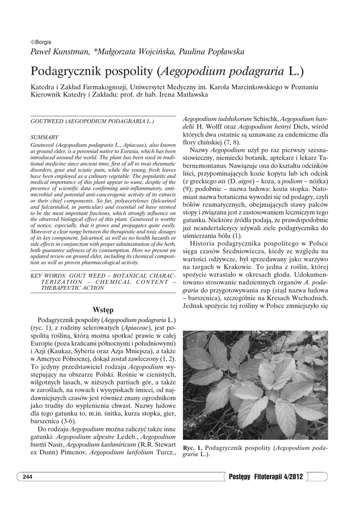 Borgis Paweł Kunstman, *Małgorzata Wojcińska, Paulina Popławska Podagrycznik pospolity (Aegopodium podagraria L.) Katedra i Zakład Farmakognozji, Uniwersytet Medyczny im. Karola Marcinkowskiego w Poznaniu Kierownik Katedry i Zakładu: prof. dr hab. Irena Matławska GOUTWEED (AEGOPODIUM PODAGRARIA L.) SUMMARY Goutweed (Aegopodium podagraria L., Apiaceae), also known as ground elder, is a perennial native to Eurasia, which has been introduced around the world. The plant has been used in traditional medicine since ancient time, first of all to treat rheumatic disorders, gout and sciatic pain, while the young, fresh leaves have been employed as a culinary vegetable. The popularity and medical importance of this plant appear to wane, despite of the presence of scientific data confirming anit-inflammatory, antimicrobial and potential anti-cancerogenic activity of its extracts or their chief components. So far, polyacetylenes (falcarinol and falcarindiol, in particular) and essential oil have seemed to be the most important fractions, which strongly influence on the observed biological effect of this plant. Goutweed is worthy of notice, especially, that it grows and propagates quite easily. Moreover a clear range between the therapeutic and toxic dosages of its key component, falcarinol, as well as no health hazards or side effects in conjunction with proper administration of the herb, both guarantee safeness of its consumption. Here we present an updated review on ground elder, including its chemical composition as well as proven pharmacological activity. KEY WORDS: GOUT WEED – BOTANICAL CHARACTERIZATION – CHEMICAL CONTENT – THERAPEUTIC ACTION Wstęp Podagrycznik pospolity (Aegopodium podagraria L.) (ryc. 1), z rodziny selerowatych (Apiaceae), jest pospolitą rośliną, którą można spotkać prawie w całej Europie (poza krańcami północnymi i południowymi) i Azji (Kaukaz, Syberia oraz Azja Mniejsza), a także w Ameryce Północnej, dokąd został zawleczony (1, 2). To jedyny przedstawiciel rodzaju Aegopodium występujący na obszarze Polski. Rośnie w cienistych, wilgotnych lasach, w niższych partiach gór, a także w zaroślach, na rowach i wysypiskach śmieci, od najdawniejszych czasów jest również znany ogrodnikom jako trudny do wyplenienia chwast. Nazwy ludowe dla tego gatunku to, m.in. śnitka, kurza stopka, gier, barszcnica (3-6). Do rodzaju Aegopodium można zaliczyć także inne gatunki: Aegopodium alpestre Ledeb., Aegopodium burttii Nasir, Aegopodium kashmiricum (R.R. Stewart ex Dunn) Pimenov, Aegopodium latifolium Turcz., 244 Aegopodium tadshikorum Schischk, Aegopodium handelii H. Wolff oraz Aegopodium henryi Diels, wśród których dwa ostatnie są uznawane za endemiczne dla flory chińskiej (7, 8). Nazwy Aegopodium użył po raz pierwszy szesnastowieczny, niemiecki botanik, aptekarz i lekarz Tabernemontanus. Nawiązuje ona do kształtu odcinków liści, przypominających kozie kopyta lub ich odcisk (z greckiego aix (D. aigos) – koza, a podiom – nóżka) (9); podobnie – nazwa ludowa: kozia stopka. Natomiast nazwa botaniczna wywodzi się od podagry, czyli bólów reumatycznych, obejmujących stawy palców stopy i związana jest z zastosowaniem leczniczym tego gatunku. Niektóre źródła podają, że prawdopodobnie już neandertalczycy używali ziele podagrycznika do uśmierzania bólu (1). Historia podagrycznika pospolitego w Polsce sięga czasów Średniowiecza, kiedy ze względu na wartości odżywcze, był sprzedawany jako warzywo na targach w Krakowie. To jedna z roślin, której spożycie wzrastało w okresach głodu. Udokumentowano stosowanie nadziemnych organów A. podagraria do przygotowywania zup (stąd nazwa ludowa – barszcnica), szczególnie na Kresach Wschodnich. Jednak spożycie tej rośliny w Polsce zmniejszyło się Ryc. 1. Podagrycznik pospolity (Aegopodium podagraria L.). Postępy Fitoterapii 4/2012 Podagrycznik pospolity (Aegopodium podagraria L.) na przestrzeni wieków, w przeciwieństwie do krajów Europy Zachodniej, w których nadal ma ona znaczenie kulinarne. W północno-zachodnich Niemczech podagrycznik jest zbierany na „zieloną zupę”, przy czym preferowane są młode liście oraz łodygi wraz z ogonkami liściowymi. Młode liście podagrycznika stanowią namiastkę szpinaku, często przygotowuje się z nich wiosenne sałatki (4, 10-14). Charakterystyka botaniczna A. podagraria to bylina okrywowa, osiągająca wysokość od 60 do 90 cm. Ma rozgałęzione, pełzające kłącze wraz z aromatycznymi korzeniami. Łodyga jest naga, pusta, bruzdowana, prosto wzniesiona, rozgałęziona w części szczytowej. Liście dolne podwójnie trójlistkowe; nierówne u nasady (sercowate, jajowate lub jajowatopodłużne), na szczycie zaostrzone, nierówno piłkowane i ciemnozielone; liście górne – trójlistkowe. Baldachy 12-20 – promieniowe, jednakowej długości, złożone z małych białych kwiatów; pokrywy oraz pokrywek najczęściej brak. Kwiaty są obupłciowe i męskie, koloru białego lub różowego, do 3 mm średnicy; kielich bez ząbków. Kwiat złożony jest z 5 płatków korony, odwrotnie sercowatych, pręcików 5 i słupka 1. Okres kwitnienia, w zależności od położenia geograficznego, przypada na maj-wrzesień. Owocem jest rozłupnia, rozpadająca się na 2 rozłupki (10, 12, 15). Podagrycznik pospolity jest typowym przedstawicielem rodzaju Aegopodium. Może występować w odmianie Variegatum – o liściach biało-pstrych. Nadzwyczajna żywotność tej rośliny wynika ze zdolności do odrastania nawet z najmniejszego fragmentu kłącza. Dlatego podagrycznik nie nadaje się do kompostowania, gdyż sprzyja ono rozprzestrzenianiu się tej byliny i utrudnia jej usuwanie. Gatunek preferuje miejsca zacienione, wilgotne, gliniaste, zasobne w azot; rozrastając się hamuje wzrost innych chwastów (16, 17). tłuszczowych; falkarinol i jego pochodne – z kwasu oleinowego. Najpierw w wyniku dehydrogenacji oraz β-oksydacji powst