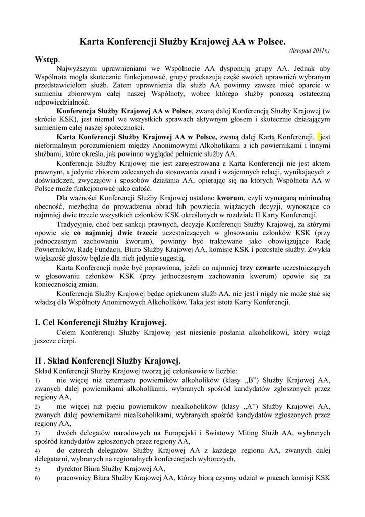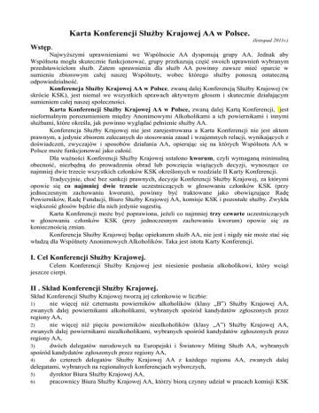 Karta Konferencji Służby Krajowej AA w Polsce. (listopad 2011r.) Wstęp. Najwyższymi uprawnieniami we Wspólnocie AA dysponują grupy AA. Jednak aby Wspólnota mogła skutecznie funkcjonować, grupy przekazują część swoich uprawnień wybranym przedstawicielom służb. Zatem uprawnienia dla służb AA powinny zawsze mieć oparcie w sumieniu zbiorowym całej naszej Wspólnoty, wobec którego służby ponoszą ostateczną odpowiedzialność. Konferencja Służby Krajowej AA w Polsce, zwaną dalej Konferencją Służby Krajowej (w skrócie KSK), jest niemal we wszystkich sprawach aktywnym głosem i skutecznie działającym sumieniem całej naszej społeczności. Karta Konferencji Służby Krajowej AA w Polsce, zwaną dalej Kartą Konferencji, jest nieformalnym porozumieniem między Anonimowymi Alkoholikami a ich powiernikami i innymi służbami, które określa, jak powinno wyglądać pełnienie służby AA. Konferencja Służby Krajowej nie jest zarejestrowana a Karta Konferencji nie jest aktem prawnym, a jedynie zbiorem zalecanych do stosowania zasad i wzajemnych relacji, wynikających z doświadczeń, zwyczajów i sposobów działania AA, opierając się na których Wspólnota AA w Polsce może funkcjonować jako całość. Dla ważności Konferencji Służby Krajowej ustalono kworum, czyli wymaganą minimalną obecność, niezbędną do prowadzenia obrad lub powzięcia wiążących decyzji, wynoszące co najmniej dwie trzecie wszystkich członków KSK określonych w rozdziale II Karty Konferencji. Tradycyjnie, choć bez sankcji prawnych, decyzje Konferencji Służby Krajowej, za którymi opowie się co najmniej dwie trzecie uczestniczących w głosowaniu członków KSK (przy jednoczesnym zachowaniu kworum), powinny być traktowane jako obowiązujące Radę Powierników, Radę Fundacji, Biuro Służby Krajowej AA, komisje KSK i pozostałe służby. Zwykła większość głosów będzie dla nich jedynie sugestią. Karta Konferencji może być poprawiona, jeżeli co najmniej trzy czwarte uczestniczących w głosowaniu członków KSK (przy jednoczesnym zachowaniu kworum) opowie się za koniecznością zmian. Konferencja Służby Krajowej będąc opiekunem służb AA, nie jest i nigdy nie może stać się władzą dla Wspólnoty Anonimowych Alkoholików. Taka jest istota Karty Konferencji. I. Cel Konferencji Służby Krajowej. Celem Konferencji Służby Krajowej jest niesienie posłania alkoholikowi, który wciąż jeszcze cierpi. II . Skład Konferencji Służby Krajowej. Skład Konferencji Służby Krajowej tworzą jej członkowie w liczbie: 1) nie więcej niż czternastu powierników alkoholików (klasy „B”) Służby Krajowej AA, zwanych dalej powiernikami alkoholikami, wybranych spośród kandydatów zgłoszonych przez regiony AA, 2) nie więcej niż pięciu powierników niealkoholików (klasy „A”) Służby Krajowej AA, zwanych dalej powiernikami niealkoholikami, wybranych spośród kandydatów zgłoszonych przez regiony AA, 3) dwóch delegatów narodowych na Europejski i Światowy Miting Służb AA, wybranych spośród kandydatów zgłoszonych przez regiony AA, 4) do czterech delegatów Służby Krajowej AA z każdego regionu AA, zwanych dalej delegatami, wybranych na regionalnych konferencjach wyborczych, 5) dyrektor Biura Służby Krajowej AA, 6) pracownicy Biura Służby Krajowej AA, którzy biorą czynny udział w pracach komisji KSK (w tym osoby redagujące biuletyny: „Zdrój”, „Wieści z AA” i „Skrytka 2/4/3”). 7) zespół prowadzący Konferencję Służby Krajowej. Konferencja Służby Krajowej oraz Rada Powierników, z własnej inicjatywy bądź na wniosek komisji KSK, mogą zaprosić przyjaciół AA, a także ekspertów, biegłych i znawców tematu z głosem doradczym. III. Relacje między Konferencją Służby Krajowej a Wspólnotą AA. Konferencja Służby Krajowej działa na rzecz Wspólnoty AA i służy jej, zajmuje się całokształtem spraw dotyczących wspólnoty jako całości, jest opiekunem służb AA oraz strażnikiem Dwunastu Kroków AA i Dwunastu Tradycji AA. Dzięki niej Wspólnota AA w Polsce może wyrażać swoje poglądy na wszystkie istotne tematy dotyczące AA oraz w sprawie niebezpiecznych odstępstw od Dwunastu Tradycji AA. Konferencja Służby Krajowej, będąc głosem sumienia Wspólnoty AA w Polsce, jest jedynym głosem AA jako całości w Polsce. Wszyscy członkowie uczestniczący w obradach KSK powinni mieć możliwość głosowania zgodnie z własnym sumieniem. Powinni też mieć możliwość swobodnego decydowania o tym, jakie pytania należy postawić na forum KSK w celu uzyskania informacji lub poddania określonego problemu pod dyskusję. Członkowie Konferencji Służby Krajowej, pełniąc służbę, kierują się duchem Dwunastu Kroków AA, Dwunastu Tradycji AA i Dwunastu Koncepcji AA. Żadna zmiana nie może być dokonana w Dwunastu Krokach AA, Dwunastu Tradycjach AA i 12 -ej Koncepcji AA bez pisemnej zgody trzech czwartych grup AA na całym świecie. IV. Rada Powierników. Fundacja BSK. Rada Fundacji. Biuro Służby Krajowej AA. Rada Powierników. Konferencja Służby Krajowej uznaje, że główna inicjatywa i czynna odpowiedzialność za większość spraw związanych ze służbami AA powinna należeć do obdarzonych zaufaniem członków Konferencji, działających jako Rada Powierników Służby Krajowej AA w Polsce, zwaną dalej Radą Powierników. Radę Powierników tworzą: 1) powiernicy alkoholicy, 2) powiernicy niealkoholicy, 3) delegaci narodowi. Powiernicy są planistami głównych działań Wspólnoty AA w Polsce i na nich spoczywa największa odpowiedzialność za sprawy Wspólnoty AA, finanse AA oraz za zarządzanie tymi obszarami. Powiernicy powinni więc zawsze dysponować wsparciem komisji KSK, Biura Służby Krajowej AA i innych służb AA. Główną zasadą służby powierników jest otaczanie opieką oraz inspirowanie wszystkich służb we Wspólnocie AA do niesienia posłania i dbanie o duchowe wart