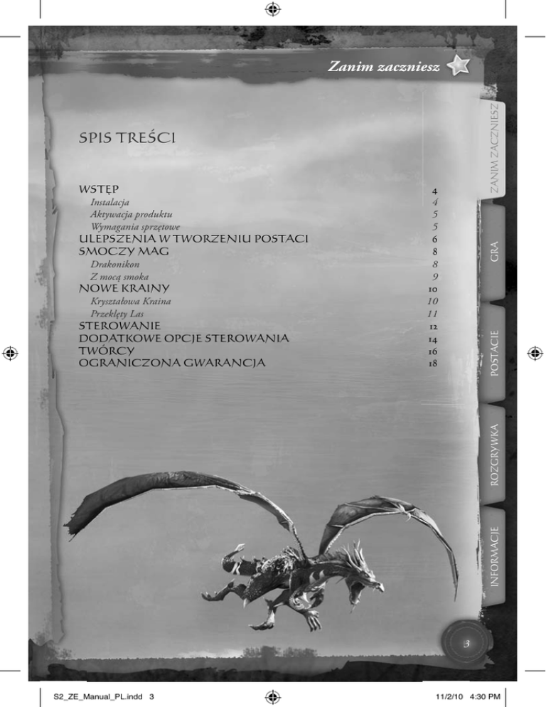 ZANIM ZACZNIESZ Zanim zaczniesz SPIS TREŚCI POSTACIE GRA 4 4 5 5 6 8 8 9 10 10 11 12 14 16 18 INFORMACJE ROZGRYWKA WSTĘP Instalacja Aktywacja produktu Wymagania sprzętowe ULEPSZENIA W TWORZENIU POSTACI SMOCZY MAG Drakonikon Z mocą smoka NOWE KRAINY Kryształowa Kraina Przeklęty Las STEROWANIE DODATKOWE OPCJE STEROWANIA TWÓRCY OGRANICZONA GWARANCJA 3 S2_ZE_Manual_PL.indd 3 11/2/10 4:30 PM Zanim zaczniesz WSTĘP Witamy w „Sacred 2 – Złota edycja“! Oprócz 6 klas postaci i rozległego świata „Sacred 2 – Fallen Angel“ oferuje następujące elementy: Dwie nowe krainy czekają na odkrycie. Znajdziesz tam nowe zadania i zagadki do rozwiązania, trudności do przezwyciężenia, potężnych wrogów do pokonania oraz nowe przedmioty do zdobycia. Słowem - wszystko, o czym marzyć może prawdziwy bohater! Legendarna Kryształowa Kraina serafii położona jest na północny zachód od Ankarii. Tylko najlepsi łowcy przetrwają na ich terenach łowieckich. Nieprzenikniona dżungla kryje od wieków straszliwe blizny Przeklętego Lasu, a wraz z nimi tragiczną tajemnicę, którą odkryć może tylko prawdziwy bohater. Jeśli chcesz poznać jedną z tych nowych, fascynujących krain, udaj się do Thylysium, stolicy królestwa elfów. Tam, na przystani, odszukaj kapitana, który umożliwi ci podróż do obu miejsc. Mamy nadzieję, że „Sacred 2 - Złota edycja“ dostarczy ci dobrej zabawy! INSTALACJA Umieść płytę DVD Sacred 2 w napędzie DVD. Jeśli włączona jest funkcja autostart, program instalacyjny uruchomi się automatycznie. W przeciwnym wypadku należy ręcznie uruchomić program „setup.exe“ umieszczony na płycie DVD Sacred. Postępuj zgodnie z instrukcjami na ekranie, by zainstalować grę na swoim komputerze. Plik readme zawiera istotne informacje techniczne. Znajdziesz go w menu Autostart gry lub w menu Start systemu Windows. W pliku tym znajdują się również najnowsze zmiany, wprowadzone po wydrukowaniu tej instrukcji. Najświeższe informacje dotyczące Sacred 2 znajdziesz na stronie internetowej www.sacred2.com. 4 S2_ZE_Manual_PL.indd 4 11/2/10 4:30 PM ZANIM ZACZNIESZ Zanim zaczniesz AKTYWACJA PRODUKTU Jeśli chcesz przeinstalować grę lub kupić nowy komputer, możesz zwrócić licencję do serwera aktywacyjnego, by móc z niej ponownie skorzystać. To samo dotyczy odsprzedaży gry. Odwiedź www.unlock.Sacred2.com, by dowiedzieć się więcej o aktywacji i rozwiązaniach możliwych problemów. GRA W trakcie instalacji Sacred 2 komputer połączy się z Internetem. Po jej zakończeniu pojawi się komunikat z prośbą o podanie kodu aktywacyjnego - znajdziesz go na tylnej okładce tej instrukcji. Po wprowadzeniu go i aktywowaniu gry możesz zagłębić się w świat Sacred 2 – Złota edycja! Każdy kod aktywacyjny wystarczy na dwa komputery. WYMAGANIA SPRZĘTOWE POSTACIE • Procesor Dual Core 2,0 GHz • 2 GB RAM • Karta graficzna 512 MB RAM kompatybilna z DirectX® 9.0c z obsługą technologii Pixel Shader 3.0 (nVidia® GeForce™ 8800 lub ATI® Radeon HD 3870) • karta dźwiękowa z opcją dźwięku przestrzennego 5.1 (kompatybilna z EAX 5.0, DirectX 9.0c [dla XP] lub DirectX 10.0 [ Vista]), oraz głośniki lub słuchawki z systemem przestrzennym • Napęd DVD • Mysz z kółkiem • 25 GB wolnej przestrzeni dyskowej oraz co najmniej 600 MB dla pliku stronicowania • Microsoft® Windows XP (32/64 bity) z Service Packiem 3 / Vista (32/64 bity) z Service Packiem 1 • DirectX 9.0c (dołączony do gry) • Karta sieciowa oraz szybkie połączenie z Internetem (co najmniej DSL) do gry wieloosobowej w sieci ROZGRYWKA • Procesor 2.4 GHz • 1 GB RAM • Karta graficzna 256 MB RAM kompatybilna z DirectX® 9.0c z obsługą technologii Pixel Shader 2.0 (nVidia® GeForce™ 6800 lub ATI® Radeon® X800) • Karta dźwiękowa kompatybilna z DirectX • Napęd DVD • 20 GB wolnej przestrzeni dyskowej oraz co najmniej 600 MB dla pliku stronicowania • Microsoft® Windows XP (32/64 bity) z Service Packiem 3 / Vista (32/64 bity) z Service Packiem 1 • DirectX 9.0c (dołączony do gry) • połączenie z Internetem lub dostęp do poczty e-mail (w celu wprowadzenia kodu aktywacyjnego) Polecamy jednak następującą konfigurację: INFORMACJE Do gry w Sacred 2 - Złota edycja potrzebny jest komputer o następujących minimalnych parametrach sprzętowych: 5 S2_ZE_Manual_PL.indd 5 11/2/10 4:30 PM Gra ULEPSZENIA W TWORZENIU POSTACI Postacie rozwinięte w Sacred 2 - Fallen Angel dostępne są również po zainstalowaniu dodatku Władca Smoków. Natomiast przy tworzeniu kolejnych postaci mamy do dyspozycji nowe możliwości. Gra wzbogacona została o zupełnie nowe style gry dla klas znanych z Sacred 2 – Fallen Angel. g 1 3 4 2 1 Smoczy mag To nowa postać w „Władca Smoków” - potężny mag z umiejętnościami transformacji. Może grać w obu kampaniach i wybierać spośród wszystkich sześciu bóstw. 2 Dotyk eksperta Tryb ten wprowadza zupełnie nowy styl gry, również dla wcześniej stworzonych postaci. Oferuje on szybszą niż wcześniej regenerację sztuk walki. Od tej pory wszystkie aspekty będą regenerować się po wykorzystaniu sztuki walki, co umożliwia wydajny styl gry graczom, którzy chcą skoncentrować się na konkretnym aspekcie (na przykład: smoczy mag jako mag żywiołów lub wysoki elf jako czysty obraz ognia). Jeśli w trakcie tworzenia postaci tryb ten zostanie wyłączony, zastosowane zostaną oryginalne zasady rozgrywki, co sprzyja walce z użyciem dwóch aspektów jednocześnie, zamiast na przemian. Raz podjętej decyzji nie można cofnąć, jest ona definitywna dla rozwoju postaci. 6 S2_ZE_Manual_PL.indd 6 11/2/10 4:30 PM 4 Chochlik noszący W dodatku „Władca Smoków” każda postać otrzymuje chochlika noszącego, który óry towarzyszy jej w drodze i umożliwia dostęp do osobistej skrzyni gracza (domyślnie nie poprzez „X”). Znacznie ułatwia to korzystanie ze zbieranych w trakcie gry przedmiotów. miotów. Kolor cho