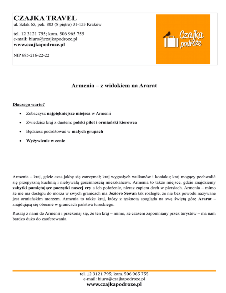 CZAJKA TRAVEL ul. Szlak 65, pok. 803 (8 piętro) 31-153 Kraków tel. 12 3121 795; kom. 506 965 755 e-mail: [email protected] www.czajkapodroze.pl NIP 685-216-22-22 Armenia – z widokiem na Ararat Dlaczego warto? Zobaczysz najpiękniejsze miejsca w Armenii Zwiedzisz kraj z duetem: polski pilot i ormiański kierowca Będziesz podróżować w małych grupach Wyżywienie w cenie Armenia – kraj, gdzie czas jakby się zatrzymał; kraj wygasłych wulkanów i koniaku; kraj mogący pochwalić się przepyszną kuchnią i niebywałą gościnnością mieszkańców. Armenia to także miejsce, gdzie znajdziemy zabytki pamiętające początki naszej ery a ich położenie, nieraz zapiera dech w piersiach. Armenia – mimo że nie ma dostępu do morza w swych granicach ma Jezioro Sewan tak rozległe, że nie bez powodu nazywane jest ormiańskim morzem. Armenia to także kraj, który z tęsknotą spogląda na swą świętą górę Ararat – znajdującą się obecnie w granicach państwa tureckiego. Ruszaj z nami do Armenii i przekonaj się, że ten kraj – mimo, ze czasem zapomniany przez turystów – ma nam bardzo dużo do zaoferowania. tel. 12 3121 795; kom. 506 965 755 e-mail: [email protected] www.czajkapodroze.pl PROGRAM WYJAZDU 1 dzień: Nocny wylot z Warszawy – zgodnie z rozkładem lotów – 22.35 2 dzień: EREWAŃ Wczesnoporanny przylot do Erewania. Przejazd do hotelu na nocleg. Odpoczynek. Po śniadaniu zwiedzanie stolicy Armenii, m.in. Plac Republiki, Plac Wolności, gmach Opery, Kaskady. Kolacja w ormiańskiej restauracji. Wieczorem spacer na Plac Republiki na pokaz tańczących fontann. Nocleg w Erewaniu 3 dzień: ZWARTNOC – KHOR VIRAP – NORAVANK-SISIAN Po śniadaniu przejazd do Zwartnoc – zwiedzanie ruin katedry z VII wieku. Następnie zatrzymamy się w Khor Virap, gdzie oprócz okazałego zespołu klasztornego będzie można podziwiać świętą górę Ormian – Ararat. Potem udamy się na południe do malowniczo położonego kościółka Noravank. Po drodze zatrzymamy się jednak na degustację wina z granatów. Na koniec dojedziemy do Sisian na nocleg. 4 dzień: TATEW – GORIS – ZORAC KARER Po śniadaniu ruszamy na południe do monasteru Tatew – malowniczo położonego wśród wąwozów. Do klasztoru dotrzemy najdłuższą kolejką linową świata. Następnie przejedziemy do Goris, gdzie odwiedzimy Muzeum Etnograficzne i zobaczymy jaskiniowy system mieszkalny. Na koniec dnia odwiedzimy ormiańskie Stonehenge – Zorac Karer. Do dziś pozostaje tajemnicą kto i w jakim celu ustawił kamienie akurat w tym miejscu. Powrót na nocleg do Sisian. 5 dzień: NORATUS – SEVANAVANK Po śniadaniu ruszmy na północ. Najpierw odwiedzimy selimski karawansaraj, następnie zatrzymamy się na największym cmentarzu z ormiańskimi płytami nagrobnymi – chaczkarami w Noratus. Po południu zwiedzimy kompleks klasztorny Sevanavank położony nad jeziorem Sewan. Nocleg w okolicach Sewan 6 dzień: SANAHIN – HAGHPAT Zwiedzanie zabytków Armenii Północnej, malowniczo położonych wśród wzgórz kompleksów świątynnych: Sanahin i Haghpat. Po południu dotrzemy do stolicy Armenii. Nocleg w Erewaniu. 7 dzień: GARNI - GEGARD Przejazd i zwiedzanie Garni, które słynie z bazaltowej świątyni poświęconej bogu słońca. Następnie przejazd do Gegard – zespołu klasztornego z IV w. Powrót do Erewania na nocleg 8 dzień: EREWAŃ – POŻEGNANIE Zwiedzanie: Matenadaran, Erebuni – starożytne miasto-twierdza, Muzeum Malarstwa, Muzeum Parajanova, Muzeum Koniaku. Nocleg w Erewaniu. 9 dzień: Około 3 w nocy przejazd na lotnisko, odprawa, wylot do Polski. Przylot do Warszawy o godzinie 6.30 rano Kolejność zwiedzania może ulec zmianie. tel. 12 3121 795; kom. 506 965 755 e-mail: [email protected] www.czajkapodroze.pl CENA OBEJMUJE: 8 noclegów zgodnie z programem Wyżywienie dwa razy dziennie: śniadania i obiadokolacje (w kilku miejscach zamiast obiadokolacji obiad) Opiekę polskiego pilota Transport zgodnie z programem Ubezpieczenie KL, NNW, bagażu CENA NIE OBEJMUE: Biletu lotniczego na trasie Warszawa-Erewań-Warszawa (ok.1000-1500 PLN, im wcześniej zakup, tym niższa cena) Wydatków na pamiątki Biletów wstępu (ok. 10-20 USD) TERMINY/CENY TERMIN CENA 21.07 – 29.07.2015 870 PLN + 670 USD Część w PLN – płatna w biurze przed wyjazdem: zaliczka w momencie zapisu, pozostała kwota 60 dni przed wyjazdem. Opłata za bilet lotniczy w momencie jego zakupu. Część w USD – płatna pilotowi pierwszego dnia po przylocie na miejsce. UWAGA – Banknoty USD muszą być wydane po 1996 roku, nie mogą być zniszczone, zapisane. BILETY LOTNICZE: Nasze biuro zajmie się zakupem biletów lotniczych. Po zebraniu się grupy, szukamy dla Państwa najkorzystniejszej opcji przelotu. Po zaakceptowaniu i wpłacie, dokonujemy zakupu. JAK SIĘ ZAPISAĆ? 1. 1. Odwiedź nasze biuro w Krakowie - ul. Szlak 65 lub zadzwoń do nas: kom. 506 965 755 lub napisz maila: [email protected] lub wypełnij formularz na naszej stronie. 2. Omówimy wszystkie szczegóły, odpowiemy na Twoje pytania i jeśli wszystko zaakceptujesz podpiszemy umowę (osobiście lub w formie skanu) 3. Będziesz mieć 2-3 dni na wpłatę zaliczki. 4. Następnie zajmiemy się wyszukaniem najtańszego połączenia lotniczego dla Ciebie. Po zaakceptowaniu ceny – kupimy bilet. Możesz też samodzielnie się tym zająć. 5. 2-3 tygodnie przed wyjazdem otrzymasz od nas wyczerpujący informator na temat Twojego wyjazdu. OPIS ZAKWATEROWANIA Noclegi w hotelach i pensjonatach. Pokoje 2-3 osobowe z łazienkami. tel. 12 3121 795; kom. 506 965 755 e-mail: [email protected] www.czajkapodroze.pl OPIS TRANSPORTU wynajęty komfortowy bus z klimatyzacją na całej trasie SPECYFIKA WYJAZDU Armenia – z widokiem na Ararat– to wyjazd oznaczony jako SZLAK ZIELONY. Wyjazd przeznaczony dla turysty, który w komfortowy sposób chce zobaczyć wszystko co warto w Armenii. Program został skonstruowany w taki sposób, by przy jednoczesnym zwiedzaniu wielu m