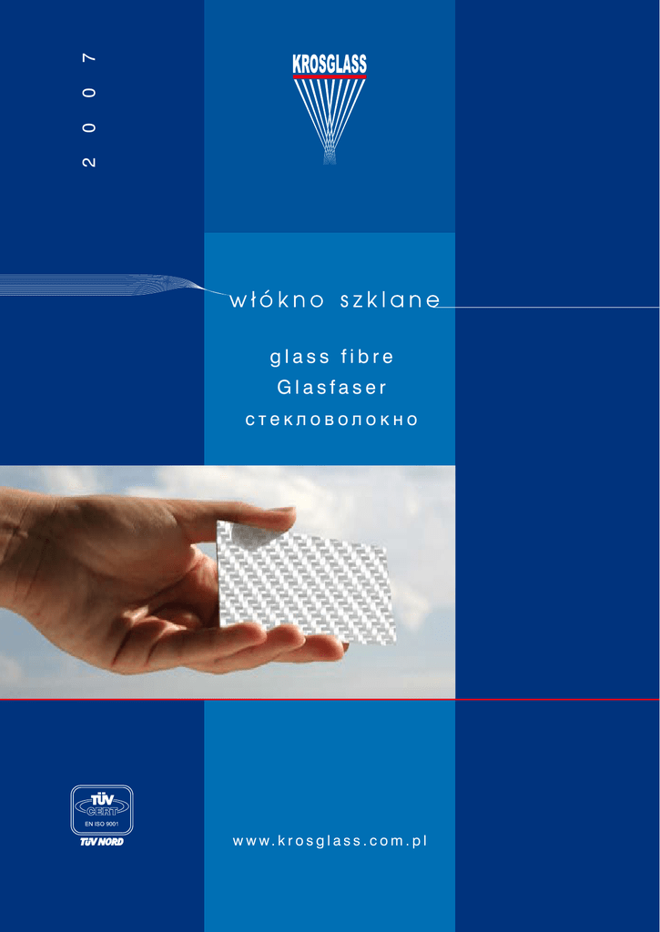 7 0 0 2 glass fibre Glasfaser стекловолокно w w w. k r o s g l a s s . c o m . p l s C o n t e n t s p i s t r e ś c I n h a l t m a t y s z k l a n e chopped s t r a n d m a t Glasma t t e n стекломаты i С о д е р ж а н и е 4 r o w i n g roving Roving ровинг 12 r o w i n g c i ę t y chopped s t r a n d s Geschn i t t e n e r R o v i n g ровинг рубленый 22 t k a n iny rowingowe woven r o v i n g f a b r i c s Glassei d e n s t r a n g g e w e b e ткань из ровинга 27 S Z ANO W NI PA Ń ST W O Od 1 stycznia 2004 roku został wydzielony z Krośnieńskich Hut Szkła w Krośnie Zakład Włókna Szklanego pod nazwą KROSGLASS. Produkcja włókna szklanego w Krośnie została uruchomiona w 1971 roku. W naszym zakładzie produkowane jest włókno szklane ze szkła typu E (boro-glino-krzemianowe) w postaci mat szklanych, rowingów ciągłych, ciętych i teksturowanych oraz tkanin rowingowych. Ma ono szerokie zastosowanie w wielu gałęziach produkcji, przede wszystkim w przemyśle stoczniowym, motoryzacyjnym i budowlanym. Wysoką jakość naszych produktów potwierdzają otrzymane certyfikaty i dopuszczenia z takich towarzystw jak: Lloyd’s Register of Shipping, Germanischer Lloyd, Det Norske Veritas czy Polski Rejestr Statków. Jednak najważniejszym potwierdzeniem wysokiej klasy naszych produktów są opinie licznych klientów w kraju jak również poza granicami Polski. Nasze wyroby znalazły odbiorców w takich krajach jak kraje UE, Rosja, Ukraina, Zjednoczone Emiraty Arabskie, a nawet Australia czy Nowa Zelandia. Stale rozwijamy potencjał produkcyjny jednocześnie dbając o odpowiedni standard jakościowy naszych produktów. Dba o to zespół wysokiej klasy specjalistów w dziedzinach technologii, zarządzania i marketingu. Służymy fachową pomocą przy doborze odpowiedniego asortymentu, jesteśmy również otwarci na produkcję nowych asortymentów. Informacje techniczne zawarte w tym katalogu stanowią wycinek naszych możliwości technologicznych. D EAR SIRS On 1st January 2004 the Glass Fibre Plant was extracted from Krosno Glassworks taking the name KROSGLASS. The production of glass fibre was started in 1971. In our company glass fibre is produced from glass type E (boro-alumino-silicate) in the form of glass fibre chopped strand mats, roving, chopped strands and textured roving and woven roving fabrics. It has a wide range of application in many branches of production, mainly in shipping, motorization and construction industry. The excellent quality of our products is confirmed by Certificates of the renown foreign and domestic standardisation institutions: Lloyd’s Register of Shipping, Germanisher Lloyd, Det Norske Veritas and Polish Ship Register. However, the most important confirmation of the high quality of our products are opinions of our numerous domestic and foreign customers. Our products meets the appreciation and approval of the customers, not only Polish but also foreign for example: EU, Russia, Ukraine, United Arab Emirates and even Australia and New Zealand. We constantly develop our production potential as well as we take care of the high quality standard of our products. It is achieved mainly due to the work of highly qualified specialists in fields of technology, management and marketing. We offer our customers a wide range of assortment as well as professional advice on its choice. Furthermore, we are open to production of the new assortment. Technical information presented in this catalog exemplify only the sample of our technical abilities. SEHR GEEHRTE DAMEN UND HERREN seit dem 1. Januar 2004 ist die Produktion der Glasfaserstoffe, die zuvor zu den Hüttenbetrieben in Krosno gehört hatte, ein selbständiger Betrieb mit dem Namen KROSGLASS. Die Produktion von Glasfaserstoffen begann in Krosno im Jahr 1971. In diesem Betrieb werden Glasfaserstoffe vom Glastyp E (Bor-Aluminium-Silikat) in Form von Glasmatten, endlosen, geschnittenen und texturierten Glasseidensträngen sowie als Rovingstoff hergestellt. Die Glasfaserstoffe finden breite Anwendung in vielen Produktionszweigen. Sie werden vor allem in der Schiffbauindustrie, im Automobilbau und in der Bauindustrie verwendet. Die hohe Qualität unserer Produkte wird durch verschiedene Zertifikate und Zulassungen von Gesellschaften wie dem Lloyd`s Register of Shipping, dem Germanischen Lloyd, der Norske Veritas und dem Polnischen Schiffsregister bescheinigt. Die beste Bestätigung des hohen Niveaus unserer Erzeugnisse ist jedoch ihre Anerkennung bei Tausenden von Kunden im In- und Ausland. Unsere Produkte werden in die EULänder, nach Russland, in die Ukraine, in die Vereinigten Arabischen Emirate und auch nach Australien und Neuseeland exportiert. Wir erweitern ständig unsere Produktionskapazitäten, nicht ohne dafür Sorge zu tragen, dass der hohe Qualitätsstandard unserer Produkte erhalten bleibt. Darum kümmern sich unsere hochqualifizierten Fachleute aus den Bereichen Technologie, Verwaltung und Marketing. Wir beraten unsere Kunden qualifiziert bei der Wahl des für sie passenden Produkts und sind immer bereit neue Produktvariationen in unser Sortiment aufzunehmen. Die in diesem Katalog enthaltenen technischen Informationen können leider nur einen Teil unserer technologischen Möglichkeiten darstellen. У В АЖАЕ М Ы Е Г О С П ОДА ! 1 января 2004 года из Кросненского Стекольного Завода в г.Кросно выделился Завод Стекловолокна под названием «KROSGLASS». Производство стекловолокна в Кросно началось в 1971 году. Наш завод выпускает стекловолокно из стекла типа Е (алюмоборосиликатное) в виде стекломатов, прямого ровинга, рубленого и текстурированного ровинга, а также