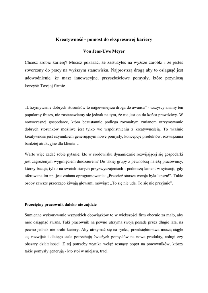 Kreatywność - pomost do ekspresowej kariery Von Jens-Uwe Meyer Chcesz zrobić karierę? Musisz pokazać, że zasłużyłeś na wyższe zarobki i że jesteś stworzony do pracy na wyższym stanowisku. Najprostszą drogą aby to osiągnąć jest udowodnienie, że masz innowacyjne, przyszłościowe pomysły, które przyniosą korzyść Twojej firmie. „Utrzymywanie dobrych stosunków to najpewniejsza droga do awansu” - wszyscy znamy ten popularny frazes, nie zastanawiamy się jednak na tym, że nie jest on do końca prawdziwy. W nowoczesnej gospodarce, która bezustannie podlega rozmaitym zmianom utrzymywanie dobrych stosunków możliwe jest tylko we współistnieniu z kreatywnością. To właśnie kreatywność jest czynnikiem generującym nowe pomysły, koncepcje produktów, rozwiązania bardziej atrakcyjne dla klienta… Warto więc zadać sobie pytanie: kto w środowisku dynamicznie rozwijającej się gospodarki jest zagrożonym wyginięciem dinozaurem? Do takiej grupy z pewnością należą pracownicy, którzy bazują tylko na swoich starych przyzwyczajeniach i podnoszą lament w sytuacji, gdy oferowana im np. jest zmiana oprogramowania: „Przecież starsza wersja była lepsza!”. Takie osoby zawsze przecząco kiwają głowami mówiąc: „To się nie uda. To się nie przyjmie”. Przeciętny pracownik daleko nie zajdzie Sumienne wykonywanie wszystkich obowiązków to w większości firm obecnie za mało, aby móc osiągnąć awans. Taki pracownik na pewno utrzyma swoją posadę przez długie lata, na pewno jednak nie zrobi kariery. Aby utrzymać się na rynku, przedsiębiorstwa muszą ciągle się rozwijać i dlatego stale potrzebują świeżych pomysłów na nowe produkty, usługi czy obszary działalności. Z tej potrzeby wynika wciąż rosnący popyt na pracowników, którzy takie pomysły generują - kto stoi w miejscu, traci. Amerykański tygodnik finansowy „BusinessWeek” w 2010 roku napisał: „To, co dawniej było ważne dla naszej firmy - cena, jakość i prace analityczne - jest obecnie zapewniane przez nasze filie w Chinach, Indiach i Rosji. Zatrudniamy tam bardzo wielu świetnie wyedukowanych pracowników, których wymagania finansowe nie są wygórowane. Nasza firma główny nacisk kładzie obecnie na kreatywność”. Również i w naszym kraju eksperci ds. gospodarki wygłaszają podobne opinie. Jakich więc pracowników poszukują firmy zajmujące się rozwijaniem nowych pomysłów, produktów i szukających innowacyjnych rozwiązań? Nadal oczywiście poszukują osób, potrafiących dostosować się do konkretnych zasad pracy panujących w przedsiębiorstwie, nie zatrudniają ich już jednak tak wielu jak kiedyś. Tacy pracownicy nie przyczyniają się do rozwoju firmy. Najbardziej poszukiwani i najwyżej cenieni są ci, którzy (czy to samodzielnie, czy w zespole) rozwijają nowe pomysły. 5 wskazówek, jak możesz udowodnić swoją kreatywność. Chcesz zrobić karierę? Zdobyć ciekawe stanowisko i nowe zadania? Najłatwiej osiągniesz ten cel udowadniając, że masz głowę pełną nowatorskich pomysłów. Zastosuj się do poniższych zasad i od zaraz zacznij wcielać je w życie, a przekonasz się, że już wkrótce zarówno koledzy z pracy, jak i Twój szef powiedzą: „Jakie on ma świetne pomysły!”. A to już bardzo wiele, aby móc zacząć planować kolejny krok prowadzący do rozwoju kariery. Wskazówka nr 1: Jeden tydzień - jeden pomysł! Poświęć cztery godziny tygodniowo na rozwijanie nowych pomysłów. Przejrzyj dokładnie swój kalendarz i skróć do minimum czas, który tracisz na wykonywanie zbędnych czynności, nie przynoszących żadnego pożytku ani Tobie, ani Twojej firmie. Wskazówka nr 2: Rozwiąż problem, nad którym głowi się Twój szef. Każdy szef boryka się z problemami, których rozwiązanie ciągle odkłada na potem. Przysłuchuj się dobrze temu, co mówi i szukaj konkretnych rozwiązań. Nigdy nie przedstawiaj szefowi swoich pomysłów „w biegu”: poczekaj na odpowiedni moment, kiedy jest on w dobrym nastroju i znajdzie dziesięć minut na spokojną rozmowę. Wskazówka nr 3: Zabłyśnij pomysłem na nowy produkt. Zastanów się, jak możesz przyczynić się do rozwoju firmy. Pomyśl nad nowymi produktami i usługami. Może istnieją rozwiązania pomagające oszczędzić czas i pieniądze (a pracownikom zbędnego stresu) przy wykonywaniu codziennych zadań? Może wpadniesz na nowy pomysł zdobywania klientów? Najważniejsze jest to, aby opracowane przez Ciebie rozwiązanie przynosiło większy zysk niż kosztować będzie jego wdrożenie. Wtedy prawdopodobieństwo, że Twój pomysł zostanie wykorzystany, jest większe. Wskazówka nr 4: Pokaż szefowi, że umiesz oszczędzać. Twoje zarobki są nieco wyższe, a i firma wychodzi na plus. Czy taka propozycja nie przekona każdego szefa? Rozwijaj pomysły, które sprawią, że firma oszczędzi miesięcznie np. 2000 euro. Przekonaj szefa, że wzrost Twoich zarobków o 400 euro to przecież nic w porównaniu do planowanych oszczędności. Wskazówka nr 5: Odłóż na bok fałszywą skromność. Wielu ludzi prezentuje swoje pomysły z niepewnością: „Być może miałbym pewien pomysł…”. Nie powinni się więc dziwić, że proponowane przez nich rozwiązania schodzą na spotkaniach na dalszy plan. Pamiętaj, aby podczas prezentowania swoich pomysłów unikać mętnych wypowiedzi takich jak: „A może gdybyśmy spróbowali…” Zamiast tego powiedz: „Mam pomysł, w jaki sposób…”. Nie mów: „To mogłoby przynieść nam korzyści”, lecz raczej: „To da nam…”. Fałszywa skromność jest w tym wypadku niepotrzebna; pragniesz przecież udowodnić, że powinieneś zarabiać więcej niż teraz i że potrafisz wznieść się na wyżyny kariery. Z niemieckiego tłumaczyła: Agnieszka Mańkowska