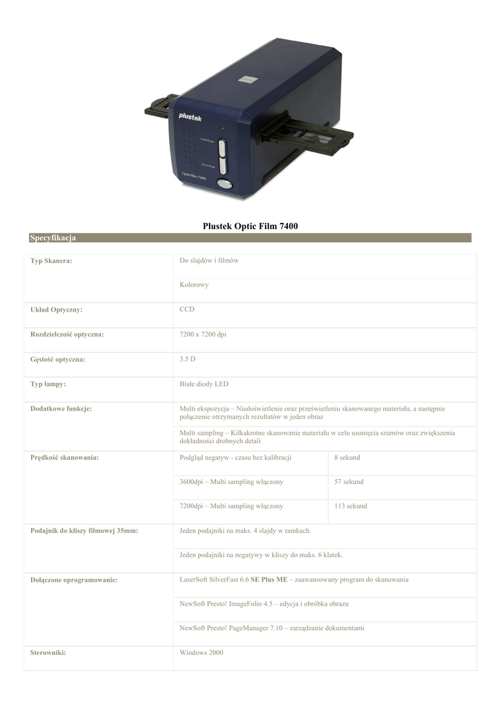 Plustek Optic Film 7400 Specyfikacja Typ Skanera: Do slajdów i filmów Kolorowy Układ Optyczny: CCD Rozdzielczość optyczna: 7200 x 7200 dpi Gęstość optyczna: 3.5 D Typ lampy: Białe diody LED Dodatkowe funkcje: Multi ekspozycja – Niedoświetlenie oraz prześwietleniu skanowanego materiału, a następnie połączenie otrzymanych rezultatów w jeden obraz Multi sampling – Kilkakrotne skanowanie materiału w celu usunięcia szumów oraz zwiększenia dokładności drobnych detali Prędkość skanowania: Podajnik do kliszy filmowej 35mm: Podgląd negatyw - czasu bez kalibracji 8 sekund 3600dpi – Multi sampling włączony 57 sekund 7200dpi – Multi sampling włączony 113 sekund Jeden podajniki na maks. 4 slajdy w ramkach. Jeden podajniki na negatywy w kliszy do maks. 6 klatek. Dołączone oprogramowanie: LaserSoft SilverFast 6.6 SE Plus ME – zaawansowany program do skanowania NewSoft Presto! ImageFolio 4.5 – edycja i obróbka obrazu NewSoft Presto! PageManager 7.10 – zarządzanie dokumentami Sterowniki: Windows 2000 Windows XP - wersja 32 / 64 bit Windows Vista - wersja 32 / 64 bit Windows 7 - wersja 32 / 64 bit Podłączenie: USB 2.0 (High Speed) Zasilanie: Zasilanie poprzez zasilacz Wymiary skanera: Długość 272 mm Szerokość 120 mm Wysokość 119mm Waga: 1,6 kg. Obszar skanowania: 36.8 x 25.4 mm Instrukcje: Instrukcja instalacji W języku polskim + wielojęzyczna Instrukcja obsługi W języku polskim + wielojęzyczna Procesor Pentium III 1 GHz lub szybszy Karta graficzna VGA lub lepsza Ilość pamięci RAM 256 MB (zalecane 512 MB) Wolne miejsce na dysku 800 MB (zalecane 1GB) Podłączenie wolny port USB (zalecany USB 2.0 Hi-Speed) System Windows 2000/XP/Vista/7 Wymagania instalacyjne: Zawartość pudełka: 1. Skaner 2. Kabel USB 3. Zasilacz 4. Ramki do slajdów i filmów 5. Płyta CD ze sterownikami i oprogramowaniem 6. Instrukcja obsługi 7. Karta gwarancyjna 8. Karta gwarancyjna