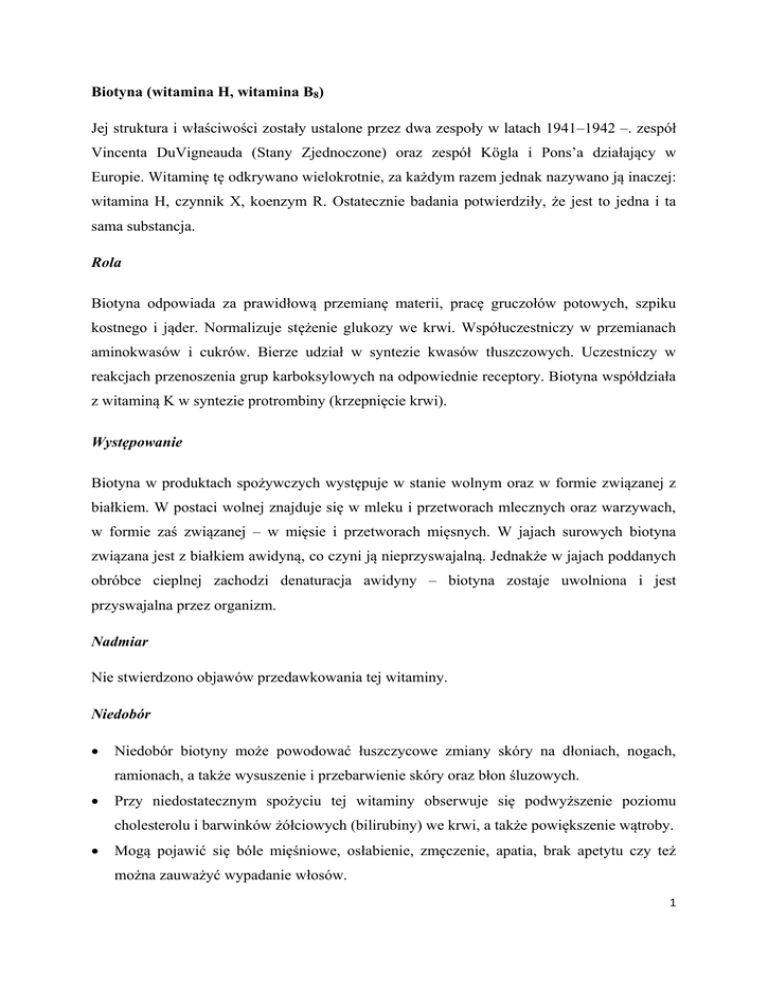 Biotyna (witamina H, witamina B8) Jej struktura i właściwości zostały ustalone przez dwa zespoły w latach 1941–1942 –. zespół Vincenta DuVigneauda (Stany Zjednoczone) oraz zespół Kögla i Pons’a działający w Europie. Witaminę tę odkrywano wielokrotnie, za każdym razem jednak nazywano ją inaczej: witamina H, czynnik X, koenzym R. Ostatecznie badania potwierdziły, że jest to jedna i ta sama substancja. Rola Biotyna odpowiada za prawidłową przemianę materii, pracę gruczołów potowych, szpiku kostnego i jąder. Normalizuje stężenie glukozy we krwi. Współuczestniczy w przemianach aminokwasów i cukrów. Bierze udział w syntezie kwasów tłuszczowych. Uczestniczy w reakcjach przenoszenia grup karboksylowych na odpowiednie receptory. Biotyna współdziała z witaminą K w syntezie protrombiny (krzepnięcie krwi). Występowanie Biotyna w produktach spożywczych występuje w stanie wolnym oraz w formie związanej z białkiem. W postaci wolnej znajduje się w mleku i przetworach mlecznych oraz warzywach, w formie zaś związanej – w mięsie i przetworach mięsnych. W jajach surowych biotyna związana jest z białkiem awidyną, co czyni ją nieprzyswajalną. Jednakże w jajach poddanych obróbce cieplnej zachodzi denaturacja awidyny – biotyna zostaje uwolniona i jest przyswajalna przez organizm. Nadmiar Nie stwierdzono objawów przedawkowania tej witaminy. Niedobór Niedobór biotyny może powodować łuszczycowe zmiany skóry na dłoniach, nogach, ramionach, a także wysuszenie i przebarwienie skóry oraz błon śluzowych. Przy niedostatecznym spożyciu tej witaminy obserwuje się podwyższenie poziomu cholesterolu i barwinków żółciowych (bilirubiny) we krwi, a także powiększenie wątroby. Mogą pojawić się bóle mięśniowe, osłabienie, zmęczenie, apatia, brak apetytu czy też można zauważyć wypadanie włosów. 1 U dzieci może pojawić się tzw. ciemieniucha. Biotyna jest także syntetyzowana przez bakterie przewodu pokarmowego. Jednakże u osób po kuracji antybiotykowej mogą wystąpić jej niedobory. 2