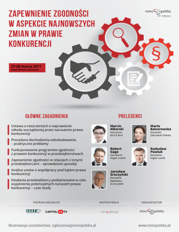 Zapewnienie zgodności w aspekcie najnowszych zmian w prawie konkurencji § 27-28 marca 2017 Hotel Westin, Warszawa Główne zagadnienia Ustawa o roszczeniach o naprawienie szkody wyrządzonej przez naruszenie prawa konkurencji PrelegenCi Marcin Alberski Marta Balcerowska Robert Gago Radosław Pawluk Kancelaria Bird & Bird Domański Zakrzewski Palinka Procedura dochodzenia odszkodowania – praktyczne problemy Funkcjonowanie programów zgodności z prawem konkurencji w przedsiębiorstwach Zapewnienie zgodności w relacjach z innymi przedsiębiorcami – sprawdzone sposoby Analiza umów o współpracy pod kątem prawa konkurencji Działania przedsiębiorcy podejmowane w celu wyjaśnienia potencjalnych naruszeń prawa konkurencji – case study PATRON MEDIALNY Rezerwacja uczestnictwa: [email protected] Kancelaria Hogan Lovells Kancelaria Hogan Lovells Jarosław Sroczyński Kancelaria Markiewicz & Sroczyński WSPÓŁPRACA ORGANIZATOR www.mmcpolska.pl Zapewnienie zgodności w aspekcie najnowszych zmian w prawie konkurencji § 27-28 marca 2017 Hotel Westin, Warszawa PROGRAM - DZIEŃ I 9:00 Rejestracja i poranna kawa 9:30 Ustawa o roszczeniach o naprawienie szkody wyrządzonej przez naruszenie prawa konkurencji 13:30Funkcjonowanie programów zgodności z prawem konkurencji w przedsiębiorstwach • Stosowane programy zgodności – case study • Programy zgodności jako skuteczne przygotowanie do kontroli UOKiK w praktyce • Nowe wymagania wobec przedsiębiorców • Zakres praw przedsiębiorcy w przypadku naruszenia jego praw • Wysokość sankcji nakładanych przez UOKiK za poszczególne przewinienia • Zasady dochodzenia roszczeń • Jak wyeliminować najczęstsze luki techniczne w funkcjonowaniu systemów i procedur zgodności • Narzędzia proceduralne: wyjawienie dowodów przez pozwanego oraz domniemiania prawne • Zmiany w kodeksie cywilnym dotyczące instytucji przedawnienia 15:30 Zakończenie I dnia warsztatów Robert Gago, Radca Prawny, Counsel, Kancelaria Hogan Lovells 10:30 Przerwa kawowa 11:00Procedura dochodzenia odszkodowania – praktyczne problemy • Udowodnienie wysokości poniesionej szkody • Uzyskanie niezbędnych ekspertyz • Zasady skutecznej współpracy z urzędem Radosław Pawluk, Adwokat, Associate, Kancelaria Hogan Lovells 12:30 Przerwa na lunch Rezerwacja uczestnictwa: [email protected] www.mmcpolska.pl Zapewnienie zgodności w aspekcie najnowszych zmian w prawie konkurencji § 27-28 marca 2017 Hotel Westin, Warszawa PROGRAM - DZIEŃ II 9:00 Rejestracja uczestników i poranna kawa 9:30 Z apewnienie zgodności w relacjach z innymi przedsiębiorcami – sprawdzone sposoby 14:00Działania przedsiębiorcy podejmowane w celu wyjaśnienia potencjalnych naruszeń prawa konkurencji – case study • Odpowiedzialność przedsiębiorcy za czynności podejmowane przez jego pracowników / podwykonawców (SA Musique Diffusion, VM Remonts) • Zapewnienie zgodności w porozumieniach pomiędzy konkurentami w zakresie współdziałania w realizowanych wspólnie projektach • Problematyka porozumień wertykalnych • Rodzaje naruszeń podejmowanych przez pracowników lub podwykonawców przedsiębiorcy • Jakie porozumienia wertykalne uznaje się za zakazane – case study • Sposoby wykrycia naruszeń oraz zachęcania pracowników do podejmowania współpracy • Wymiar odpowiedzialności za zawarcie zakazanego porozumienia • Postępowanie wewnętrzne w celu ustalenia czy naruszenie miało miejsce (LEGO) • Analiza due diligence partnerów biznesowych Marta Balcerowska, Radca Prawny, Associate, Domański Zakrzewski Palinka • Działania podejmowane przez przedsiębiorcę w przypadku naruszeń (zmiany w prowadzonej działalności, dystansowanie się od działań pracowników / podwykonawców, postępowanie dyscyplinarne, wniosek leniency) 11:00 Przerwa kawowa 11:30Analiza umów o współpracy pod kątem prawa konkurencji • Monitorowanie umów pod kątem występowania w nich klauzul niedozwolonych Marcin Alberski, Associate, Kancelaria Bird & Bird 15:30Zakończenie warsztatów; Wręczenie certyfikatów Uczestnikom • Najczęstsze pułapki w umowach • Case study Jarosław Sroczyński, Radca Prawny, Wspólnik, Kancelaria Markiewicz & Sroczyński 13:00 Przerwa na lunch Rezerwacja uczestnictwa: [email protected] www.mmcpolska.pl Zapewnienie zgodności w aspekcie najnowszych zmian w prawie konkurencji § 27-28 marca 2017 Hotel Westin, Warszawa Dlaczego warto wziąć udział w warsztacie Z początkiem 2017 roku wejdzie w życie ustawa o roszczeniach o naprawienie szkody wyrządzonej przez naruszenie Grupa docelowa Warsztat kierujemy do Członków Zarządów, Dyrektorów, Kierowników i Specjalistów z działów: prawa konkurencji, która będzie implementować Dyrektywę • Prawnych Private Enforcement w Polsce. Wspomniana ustawa wpro- • Compliance wadzi nowe rozwiązania odnośnie dochodzenia roszczeń z • Handlowych tytułu naruszenia prawa konkurencji. Z uwagi na nadchodzące zmiany, zapewnienie zgodności w prawie konkurencji stanowić będzie ogromne wyzwanie dla przedsiębiorców. Efektywny systemu zarządzania ryzykiem naruszenia przepisów prawa ochrony konkurencji można osiągnąć jedynie poprzez prowadzenie skutecznego programu zgodności. Uczestnictwo w warsztacie umożliwi Państwu skuteczne przygotowanie się do nowych przepisów. Nasi Eksperci przedstawią ułatwienia proceduralne dla poszkodowanych zawarte w ustawie oraz praktyczne problemy związane z pozyskiwaniem odszkodowania, które mogą Państwo napotkać. W ramach warsztatu Eksperci udzielą Państwu cennych wskazówek odnośnie skutecznego funkcjonowania programów zgodności. Specjaliści w praktycznej odsłonie przybliżą Państwu najczęstsze luki w systemach i procedurach oraz swoje uwagi, które pozwolą Państwu na wprowadzenie nowych standardów współpracy z innymi członkami rynku. Organizator MMC Polska jest niezależnym organizatorem spotkań biznesowych w Polsce. Spółka 
