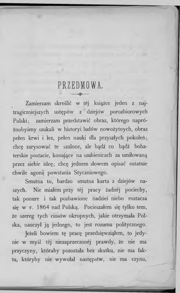 PRZEDMOWA. « Zamierzam skreślić w tej książce jeden z naj- tragiczniejszych ustępów Polski; z dziejów porozbiorowych zamierzam przedstawić obraz, którego napró- żnobyśmy szukali w historyi ludów nowożytnych, obraz pełen krwi i łez, pełen nauki dla przyszłych pokoleń; chcę zarysować te szalone, ale bądź co bądź boha terskie postacie, konające na szubienicach za umiłowaną przez siebie ideę; chcę jednem słowem opisać ostatnie chwile agonii powstania Styczniowego. Smutna to, bardzo smutna karta z dziejów na szych. Nie miałem przy tej pracy żadnej pociechy, tak ponure i tak pozbawione nadziei niebo roztacza się w r. 1864 nad Polską. Pocieszałem się tylko tem, że szereg tych ciosów okropnych, jakie otrzymała Pol ska, nauczył ją jednego, to jest rozumu politycznego. Jeżeli bowiem tę pracę przedsięwziąłem, to jedy nie w myśl tej niezaprzeczonej prawdy, że nie ma przyczyny, któraby pozostała bez skutku, nie ma fak tu, któryby nie wywołał następstw, nie ma czynu, VI któryby nie był nauką dla przyszłości. moja książka będzie taką nauką. Niechże więc Niechże potomność wie, że tego, „co nam obca przemoc wzięła, mocą.... nie odbierzemy“, że na pięść osamotnioną, zawsze się znajdzie kilka silniejszych pięści spojonych jednym in teresem; że tylko spokojna praca wewnętrzna i umie jętne korzystanie z okoliczności, może nam dać tę nie zależność narodową, dla której przez sto lat wielkich a zawsze nierozważnych wysileń zmarnowaliśmy naj lepszą, najszlachetniejszą naszą krew i na drodze cy wilizacyjnego i społecznego rozwoju, zostaliśmy wstecz o całe pół wieku. Książka więc moja będzie bijącym w oczy do wodem, że czas polityki serca,1czas dyplomatyzowań romantycznych, czas Orlandowych awantur, czas ma rzeń i restauracyi Polski „od morza do morza“, już minął. Nauka była ciężką, straszną, krwawą, ale w gruncie rzeczy zbawienną. Karty te bowiem pokażą ci czytelniku, jak po szeregu nadzwyczajnych wytężeń wszystkich muskułów narodowego ciała, nastąpiło nagłe obezwładnienie, niesłychany upadek ducha i poniżenie godności narodo wej. Nie byliśmy pod tym względem ani lepsi ani gorsi od innych. Robiliśmy to samo co inni byliby w takichże warunkach zrobili; ale uczyniliśmy i to, co VII nie wielu byłoby uczyniło, to jest zatrzymaliśmy w sobie resztę tchu, by ocalić życie i... ocaliliśmy je! O tern wszystkiem będę mówił w tej książce na podstawie niezaprzeczonej autentyczności dokumen tów. Dokumenta te składają się z archiwum ostatniego Rządu Narodowego, które wypadkiem, przed kilku laty, dostało się całkowicie i dobrze zachowane w ręce autora. Zawiera ono akta, korespondencye i prokla- macye Rządu od Marca 1864 r. Od tej też chwili właściwie rozpoczynamy nasze opowiadanie. Ze jednak niepodobna było ściśle trzymać się tej daty, gdyż wiele wypadków miało swe źródło znacznie wcześniej, mu sieliśmy częstokroć cofać się wstecz dla jasności i peł ności obrazu. Nie potrzebujemy zdaje się mówić, że korzystaliśmy ze wszelkich źródeł drukowanych, z ów czesnych gazet tak polskich jak i rosyjskich, raportów, pism ulotnych, sprawozdań i . pamiętników. Wiemy bardzo dobrze, że praca nasza ma liczne braki, ale woleliśmy zużytkować ten materyał jaki mamy pod ręką, niż zostawić go na niepewność losów dla przy szłego historyka. Staraliśmy się być spokojni i bezstronni w na szych sądach, jednakże przyznajemy to otwarcie, nie wszędzie mogliśmy się utrzymać na tem podniosłem stanowisku. Autor jest Polakiem gorąco miłującym VIII swą ojczyznę, niegdyś brał czynny udział w ruchu 1863/4 roku, i dla tego przy pisaniu tej książki krwa wiła mu się nieraz źle dotąd zagojona rana serca. Nie dziw, że wielekroć boleść kazała mu maczać pióro w żółci i gniewie. i wybaczy. Czytelnik bezstronny zrozumie to Wieś Ruda w Lipcu 1884. r - r ROZDZIAŁ I. Stan organizacyi i kraju. Usposobienie um ysłów. W ojew ództw o Lubelskie i reakcya w niem. Poczty i czyn Kocowskiego ze Skierbiszowa. Austryacy w ydają p o w stańców . Komisarz Rządu wyjeżdżą. Szlachta w Krasnostawskiem żąda czynszów od włościan. Rozkaz Trojańskiego. Upadek organi zacyi w wojew ództw ie Podlaskiem. Stan w ojew ództw a Płockiego. Złe usposobienie chłopów i szlachty. Bankiet w okolicach Płońska. W ojew ództw o Augustowskie i komisarz Czyński. Straż nadgraniczna i siły powstańcze. Dziennik „W iadom ości o naszej wojnie z Moska lami.“ W łaściciel w si W ojszwile. Komisarz żąda uwolnienia. Organizacya w Kaliskiem. Raport naczelnika m. Radomia. Stan Krakow skiego. Ogólny upadek ducha. Litwa i odezw a jej W ydziału do Rządu Narodowego. Odpowiedź tegoż. Zabór Austryjacki. Rozprzę żenie pow szechne. Agencya do spraw Rusi we Lwowie i jej odezwa. Program agencyi. Zamiary Rządu Narodowego w Zaborze Pruskim napotykają na silny opór ze strony miejscowego wydziału. Nowa organizacya Zaboru Pruskiego i mianowanie Działyńskiego organiza torem sił zbrojnych narodow ych. W ydział w ykonaw czy w tymże Zaborze) chce się wyłam ać z pod w ładzy Rządu. Próba organizacyi nowej Zaboru nie udaje się. Działyński w d. 6 Sierpnia podaje się do dymisyi. Ogólny pogląd na stan kraju i organizacyi pow stańczej. H rabia T eodor Berg Namiestnik Królestwa i jego charakter. Przygody jego życia. Ma on swoich historyografów. Kontrybucye i ich poli tyczne znaczenie. Nadużycia w kontrybucyach. Kontrola. Gwałty i aresztowania. Utworzenie posady Jenerał-policmajstra i zarządu wojskowo-policyjnego. Skład i koszta biura. Organizacya policyi 1 w Warszawie-. Pasporta. T uchołka i jego charakter. Śledztwa. Stan prowincyi i rządy naczelników wojennych. Cięcie poręb w lasach. Straż chłopska po wsiach. Jej czyny i stan. Kapitan Sokołow w Czer skiem. Czengiery, Raden i Ganecki. Okrucieństwa. Bale publicz