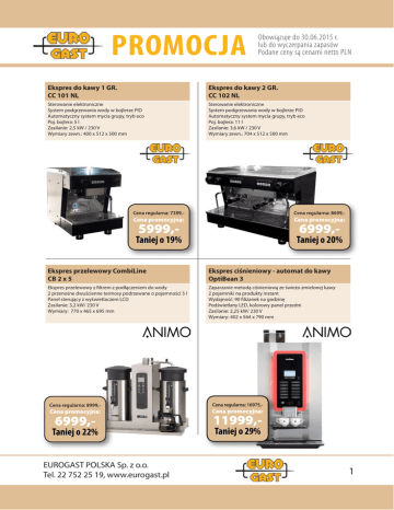 PROMOCJA Obowiązuje do 30.06.2015 r. lub do wyczerpania zapasów Podane ceny są cenami netto PLN Ekspres do kawy 1 GR. CC 101 NL Ekspres do kawy 2 GR. CC 102 NL Sterowanie elektroniczne System podgrzewania wody w bojlerze PID Automatyczny system mycia grupy, tryb eco Poj. bojlera: 5 l Zasilanie: 2,5 kW / 230 V Wymiary zewn.: 400 x 512 x 500 mm Sterowanie elektroniczne System podgrzewania wody w bojlerze PID Automatyczny system mycia grupy, tryb eco Poj. bojlera: 11 l Zasilanie: 3,6 kW / 230 V Wymiary zewn.: 704 x 512 x 500 mm Cena regularna: 7399,- Cena regularna: 8699,- Cena promocyjna: Cena promocyjna: Taniej o 19% Taniej o 20% 6999,- 5999,- Ekspres przelewowy CombiLine CB 2 x 5 Ekspres ciśnieniowy - automat do kawy OptiBean 3 Ekspres przelewowy z filtrem z podłączeniem do wody 2 przenośne dwuścienne termosy podrzewane o pojemności 5 l Panel sterujący z wyświetlaczem LCD Zasilanie: 3,2 kW/ 230 V Wymiary: 770 x 465 x 695 mm Zaparzanie metodą ciśnieniową ze świeżo zmielonej kawy 2 pojemniki na produkty instant Wydajność: 90 filiżanek na godzinę Podświetlany LED, kolorowy panel przedni Zasilanie: 2,25 kW/ 230 V Wymiary: 402 x 564 x 790 mm Cena regularna: 8999,- Cena regularna: 16975,- Cena promocyjna: Cena promocyjna: Taniej o 22% Taniej o 29% 6999,- EUROGAST POLSKA Sp. z o.o. Tel. 22 752 25 19, www.eurogast.pl 11999,- 1 PROMOCJA Obowiązuje do 30.06.2015 r. lub do wyczerpania zapasów Podane ceny są cenami netto PLN Opiekacz – toster TS 1270 Salamander SEM 600 Q Promienniki kwarcowe – krótki czas rozgrzewania Dwie strefy grzewcze, 3 promienniki na każdym poziomie Zasilanie: 2,0 kW / 230 V Wymiary rusztu: 520 x 320 mm Wymiary: 525 x 305 x 305 mm Promienniki kwarcowe – krótki czas rozgrzewania Dwie niezależne strefy grzewcze 4 promienniki na każdą strefę grzewczą Wyposażony w wysuwaną tacę na resztki Zasilanie: 3,0 kW / 230 V Wymiary: 600 x 590 x 590 Cena regularna: 2333,- Cena regularna: 5999,- Cena promocyjna: Cena promocyjna: Taniej o 23% Taniej o 23% 1799,- Grill rolkowy do hot-dogów RG 5 Grill rolkowy do hot-dogów RG 11 5 rolek stalowych 400 mm Pojemność: 8 parówek Zasilanie: 0,9 kW / 230 V Wymiary: 545 x 320 x 240 mm 11 rolek stalowych 400 mm Dwie strefy grzewcze Pojemność: 20 parówek Zasilanie: 1,4 kW / 230 V Wymiary: 545 x 320 x 240 mm Cena regularna: 2294,- Cena regularna: 3499,- Cena promocyjna: Cena promocyjna: Taniej o 22% Taniej o 20% 1799,- 2 4599,- 2799,- EUROGAST POLSKA Sp. z o.o. Tel. 22 752 25 19, www.eurogast.pl PROMOCJA Obowiązuje do 30.06.2015 r. lub do wyczerpania zapasów Podane ceny są cenami netto PLN Naleśnikarka podwójna gazowa CDG 400 Gofrownica pojedyncza (gofry typu Bruxelles), GES 10 Wymiar płyty: Ø 40 cm Moc grzewcza: 6,4 kw Wymiary: 860 x 500 x 240 mm Dwa gofry typu Bruxelles: duża kratka 3 x 5 Zasilanie: 1,6 kW / 230 V Wymiary: 305 x 440 x 230 Cena regularna: 3902,- Cena regularna: 2360,- Cena promocyjna: Cena promocyjna: Taniej o 23% Taniej o 24% 2999,- 1799,- Frytownica 2 x 5 l FD 50 D Frytownica wolnostojąca podwójna 2 x 10 l RFE 20 C Pojemność: 2 x 5 l Wydajność: 20 kg/h Zasilanie: 2 x 3,2 kW / 2 x 230 V Wymiary: 390 x 425 x 320 mm Pojemność: 2 x 10 l Niezależne sterowanie dla każdego kosza Wydajność: 2 x 20 kg / h Zasilanie: 2 x 16 kW / 400 V Wymiary: 400 x 600 x 980 mm Cena regularna: 1499,- Cena regularna: 5082,- Cena promocyjna: Cena promocyjna: Taniej o 27% Taniej o 21% 1099,- EUROGAST POLSKA Sp. z o.o. Tel. 22 752 25 19, www.eurogast.pl 3999,- 3 PROMOCJA Obowiązuje do 30.06.2015 r. lub do wyczerpania zapasów Podane ceny są cenami netto PLN Naleśnikarka podwójna elektryczna KM 40 DE Kontakt grill ryflowany TG 5530 DE 2 płyty żeliwne o Ø 40 cm Zasilanie: 2 x 3 kW / 2 x 230 V Wymiary: 900 x 500 x 220 mm Górna i dolna płyta ryflowana, dwie strefy grzewcze sterowane niezależnie Powierzchnia robocza: 550 x 300 mm Zasilanie: 2 x 2 kW / 2 x 230 V Wymiary: 560 x 370 x 260 mm Cena regularna: 2396,- Cena regularna: 1471,- Cena promocyjna: Cena promocyjna: Taniej o 25% Taniej o 18% 1199,- 1799,- Opiekacz toster jednopoziomowy TRS 20.2 Piec mikrofalowy z konwekcją 38.10 CGD Promienniki kwarcowe – krótki czas rozgrzewania Jedna strefa grzewcza, 3 promienniki na każdym poziomie Zasilanie: 2,0 kW / 230 V Wymiary: 525 x 305 x 305 mm Programy: mikrofala, grill, konwekcja, odmrażanie Cyfrowy panel sterujący Zasilanie: 3,4 kW/ 230 V Wymiary: 595 x 472 x 460 mm Cena regularna: 822,- Cena regularna: 3899,- Cena promocyjna: Cena promocyjna: Taniej o 27% Taniej o 23% 599,- 4 2999,- EUROGAST POLSKA Sp. z o.o. Tel. 22 752 25 19, www.eurogast.pl PROMOCJA Obowiązuje do 30.06.2015 r. lub do wyczerpania zapasów Podane ceny są cenami netto PLN Piec do pizzy jednokomorowy PO5050 E Piec do pizzy dwukomorowy PO 7070 DE (Full Stone) Pojemność: 4 placki Ø 25 cm Wymiary komory: 500 x 500 x 100 mm Zasilanie: 4 kW / 230 V / 400 V Wymiary: 800 x 720 x 500 mm Komora w całości wyłożona szamotem Pojemność: 2 x 4 placki Ø 33 cm Wymiary komory: 700 x 700 x 150 mm Zasilanie: 12 kW / 400 V Wymiary: 1040 x 990 x 760mm Cena regularna: 2437,- Cena regularna: 9342,- Cena promocyjna: Cena promocyjna: Taniej o 22% Taniej o 19% 1899,- 7599,- Automat do zimnych deserów NINA 1 Uniwersalny mikser do ciasta TEDDY Sterowanie: elektroniczny panel LED Pojemność: 1 zbiornik 2 litry Zasilanie: 0,23 kW / 230 V Wymiary: 130 x 375 x 455 mm 3 mieszadła w standardzie: płaskie, hak i rózga Uchylny korpus Dzieża i mieszadła wykonane ze stali nierdzewnej Płynna regulacja prędkości obrotowej Zasilanie: 0,5 kW / 230 V Wymiary: 240 x 462 x 400 mm zz zz zz zz zz do shake’ów, sorbetów, cremino, lodów włoskich (soft), mrożonej kawy Cena regularna: 2599,- Cena regularna: 4499,- Cena promocyjna: Cena promocyjna: Taniej o 23% Taniej o 27% 1999,- EUROGAST POLSKA Sp. z o.o. Tel. 22 752 25 19, www.eurogast.pl 3299,- 5 PROMOCJA Mikser ręczny TR 200 Mikser ręczny TR 350-BN Zastosowanie do pojemności do 10 litrów S