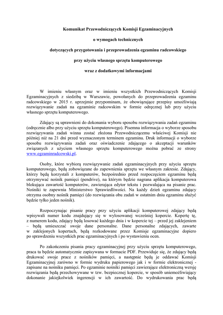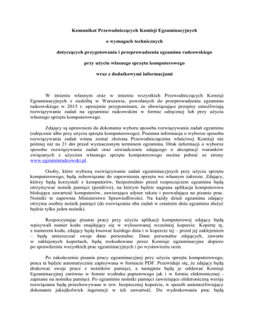 Komunikat Przewodniczących Komisji Egzaminacyjnych o wymogach technicznych dotyczących przygotowania i przeprowadzenia egzaminu radcowskiego przy użyciu własnego sprzętu komputerowego wraz z dodatkowymi informacjami W imieniu własnym oraz w imieniu wszystkich Przewodniczących Komisji Egzaminacyjnych z siedzibą w Warszawie, powołanych do przeprowadzenia egzaminu radcowskiego w 2015 r. uprzejmie przypominam, że obowiązujące przepisy umożliwiają rozwiązywanie zadań na egzaminie radcowskim w formie odręcznej lub przy użyciu własnego sprzętu komputerowego. Zdający są uprawnieni do dokonania wyboru sposobu rozwiązywania zadań egzaminu (odręcznie albo przy użyciu sprzętu komputerowego). Pisemna informacja o wyborze sposobu rozwiązywania zadań winna zostać złożona Przewodniczącemu właściwej Komisji nie później niż na 21 dni przed wyznaczonym terminem egzaminu. Druk informacji o wyborze sposobu rozwiązywania zadań oraz oświadczenie zdającego o akceptacji warunków związanych z użyciem własnego sprzętu komputerowego można pobrać ze strony www.egzaminradcowski.pl. Osoby, które wybiorą rozwiązywanie zadań egzaminacyjnych przy użyciu sprzętu komputerowego, będą zobowiązane do zapewnienia sprzętu we własnym zakresie. Zdający, którzy będą korzystali z komputerów, bezpośrednio przed rozpoczęciem egzaminu będą otrzymywać nośnik pamięci (pendrive), na którym będzie nagrana aplikacja komputerowa blokująca zawartość komputerów, zawierająca edytor tekstu i pozwalająca na pisanie prac. Nośniki te zapewnia Ministerstwo Sprawiedliwości. Na każdy dzień egzaminu zdający otrzyma osobny nośnik pamięci (do rozwiązania obu zadań w ostatnim dniu egzaminu służyć będzie tylko jeden nośnik). Rozpoczynając pisanie pracy przy użyciu aplikacji komputerowej zdający będą wpisywali numer kodu znajdujący się w wylosowanej wcześniej kopercie. Kopertę tę, z numerem kodu, zdający będą losować każdego dnia i w kopercie tej – przed jej zaklejeniem – będą umieszczać swoje dane personalne. Dane personalne zdających, zawarte w zaklejonych kopertach, będą rozkodowane przez Komisje egzaminacyjne dopiero po sprawdzeniu wszystkich prac egzaminacyjnych i po wystawieniu ocen. Po zakończeniu pisania pracy egzaminacyjnej przy użyciu sprzętu komputerowego, praca ta będzie automatycznie zapisywana w formacie PDF. Przewiduje się, że zdający będą drukować swoje prace z nośników pamięci, a następnie będą je oddawać Komisji Egzaminacyjnej zarówno w formie wydruku papierowego jak i w formie elektronicznej zapisane na nośniku pamięci. Po egzaminie nośniki pamięci zawierające elektroniczną wersję rozwiązania będą przechowywane w tzw. bezpiecznej kopercie, w sposób uniemożliwiający dokonanie jakiejkolwiek ingerencji w ich zawartość. Do wydrukowania prac będą wykorzystane drukarki podłączone do stanowisk komputerowych znajdujących się na salach egzaminacyjnych. Minimalne wymagania*, które powinien spełniać komputer zdającego dla prawidłowego działania aplikacji są następujące. procesor Pentium 1 GHz lub jego odpowiednik; 512 MB pamięci RAM (zalecane 1024MB); system operacyjny (32/64-bit): Windows XP SP3, Windows Vista, Windows 7, Windows 8, Windows 8.1; zainstalowany program Microsoft .NET Framework 3.5 SP1 [1]; 100 MB wolnego miejsca na dysku systemowym komputera; wolny port USB; konto użytkownika o prawach administratora lokalnego do komputera [2]; odinstalowany program antywirusowy; wyłączony wygaszacz ekranu; opcja (schemat) zasilania ustawiona na funkcję „prezentacja”/„wysoka wydajność”[3]; zegar komputera ustawiony zgodnie z obowiązującą datą i czasem; wyłączone aktualizacje automatyczne. Uwagi: aplikacja nie może być uruchamiana na maszynach wirtualnych; na egzaminie dopuszczalne jest korzystanie z przewodowych myszek i klawiatur; ekrany dotykowe na czas egzaminu zostaną zablokowane przez aplikację. Wyjaśnienie oznaczeń: * - Minimalne, przetestowane wymagania komputera, przy których aplikacja pracuje prawidłowo. Należy mieć na uwadze, że zainstalowane na komputerze zdającego i pracujące w tle inne aplikacje mogą spowolnić działanie aplikacji egzaminacyjnej, dlatego sugeruje się odinstalowanie zbędnych aplikacji na czas trwania egzaminu. [1] - Microsoft .NET 3.5 SP1 jest domyślnie zintegrowany jako składnik systemu Windows 7, w przypadku systemu Windows XP, Vista, Windows 8 i Windows 8.1 należy go doinstalować. [2] - Aby sprawdzić, czy zalogowany użytkownik posiada uprawnienia administratora lokalnego do komputera należy w linii poleceń wykonać komendę net user %username% i sprawdzić, czy na wyświetlonej liście znajduje się następujący wpis „Członkostwa grup lokalnych *Administratorzy”. [3] - Komputer powinien być skonfigurowany w taki sposób, aby w przypadku bezczynności nie używał funkcji wstrzymywania systemu (tryb uśpienia) i wygaszacza ekranu. W przypadku pytań technicznych dotyczących aplikacji komputerowej, proszę o kontakt na adres: [email protected] . Informuję nadto, że w związku z możliwością zdawania egzaminu radcowskiego przy użyciu własnego sprzętu komputerowego, udostępniona jest wersja demonstracyjna aplikacji do zdawania egzaminów prawniczych, dzięki której można zapoznać się z funkcjonalnością aplikacji. Aplikacja udostępniona w wersji demonstracyjnej posiada, ze względów bezpieczeństwa, wyłączone zabezpieczenia oraz funkcję zapisu pracy. Zabroniona jest jakakolwiek ingerencja w kod programu. Jak natomiast wskazano to już powyżej, wersję finalną aplikacji zdający otrzymają przed rozpoczęciem egzaminu na nośnikach pamięci. W celu rozpoczęcia testowania - przy użyciu wersji demonstracyjnej - aplikacji do zdawania egzaminów prawniczych należy: pobrać plik DEMO.zip; rozpakować plik DEMO.zip na dysku lokalnym komputera; uruchomić plik START.exe z katalogu AZEP. DEM