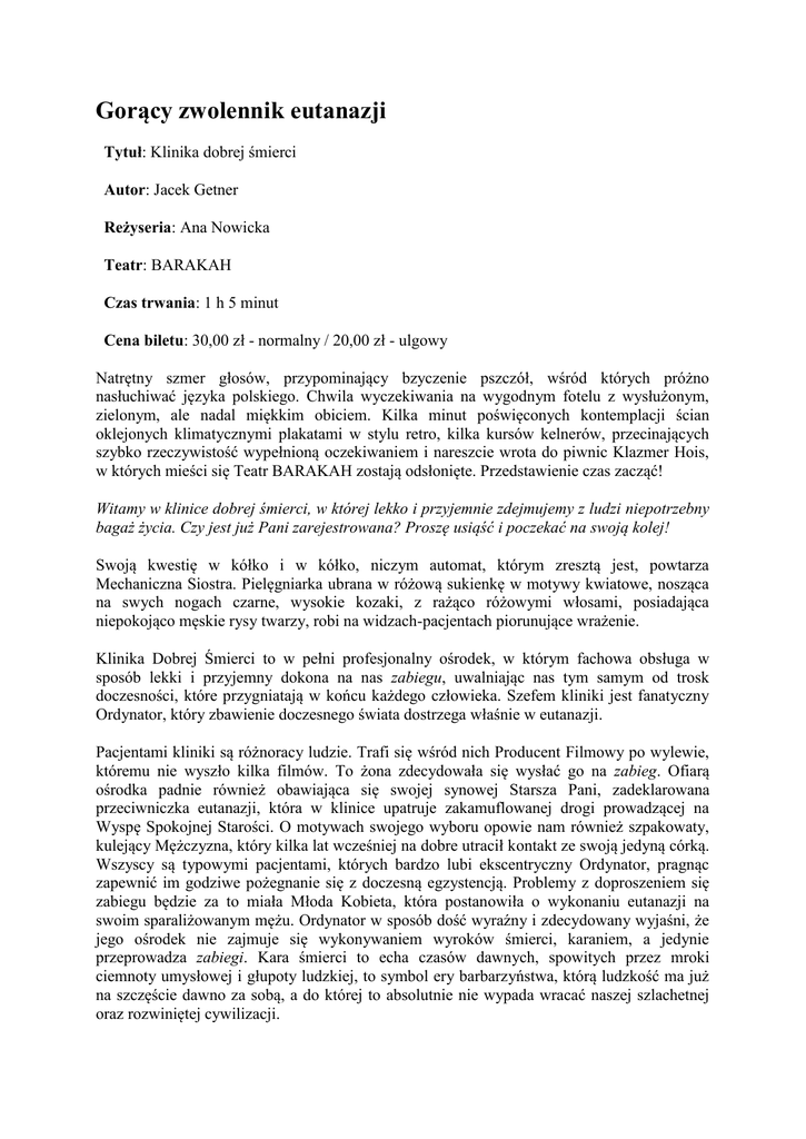 Gorący zwolennik eutanazji Tytuł: Klinika dobrej śmierci Autor: Jacek Getner Reżyseria: Ana Nowicka Teatr: BARAKAH Czas trwania: 1 h 5 minut Cena biletu: 30,00 zł - normalny / 20,00 zł - ulgowy Natrętny szmer głosów, przypominający bzyczenie pszczół, wśród których próżno nasłuchiwać języka polskiego. Chwila wyczekiwania na wygodnym fotelu z wysłużonym, zielonym, ale nadal miękkim obiciem. Kilka minut poświęconych kontemplacji ścian oklejonych klimatycznymi plakatami w stylu retro, kilka kursów kelnerów, przecinających szybko rzeczywistość wypełnioną oczekiwaniem i nareszcie wrota do piwnic Klazmer Hois, w których mieści się Teatr BARAKAH zostają odsłonięte. Przedstawienie czas zacząć! Witamy w klinice dobrej śmierci, w której lekko i przyjemnie zdejmujemy z ludzi niepotrzebny bagaż życia. Czy jest już Pani zarejestrowana? Proszę usiąść i poczekać na swoją kolej! Swoją kwestię w kółko i w kółko, niczym automat, którym zresztą jest, powtarza Mechaniczna Siostra. Pielęgniarka ubrana w różową sukienkę w motywy kwiatowe, nosząca na swych nogach czarne, wysokie kozaki, z rażąco różowymi włosami, posiadająca niepokojąco męskie rysy twarzy, robi na widzach-pacjentach piorunujące wrażenie. Klinika Dobrej Śmierci to w pełni profesjonalny ośrodek, w którym fachowa obsługa w sposób lekki i przyjemny dokona na nas zabiegu, uwalniając nas tym samym od trosk doczesności, które przygniatają w końcu każdego człowieka. Szefem kliniki jest fanatyczny Ordynator, który zbawienie doczesnego świata dostrzega właśnie w eutanazji. Pacjentami kliniki są różnoracy ludzie. Trafi się wśród nich Producent Filmowy po wylewie, któremu nie wyszło kilka filmów. To żona zdecydowała się wysłać go na zabieg. Ofiarą ośrodka padnie również obawiająca się swojej synowej Starsza Pani, zadeklarowana przeciwniczka eutanazji, która w klinice upatruje zakamuflowanej drogi prowadzącej na Wyspę Spokojnej Starości. O motywach swojego wyboru opowie nam również szpakowaty, kulejący Mężczyzna, który kilka lat wcześniej na dobre utracił kontakt ze swoją jedyną córką. Wszyscy są typowymi pacjentami, których bardzo lubi ekscentryczny Ordynator, pragnąc zapewnić im godziwe pożegnanie się z doczesną egzystencją. Problemy z doproszeniem się zabiegu będzie za to miała Młoda Kobieta, która postanowiła o wykonaniu eutanazji na swoim sparaliżowanym mężu. Ordynator w sposób dość wyraźny i zdecydowany wyjaśni, że jego ośrodek nie zajmuje się wykonywaniem wyroków śmierci, karaniem, a jedynie przeprowadza zabiegi. Kara śmierci to echa czasów dawnych, spowitych przez mroki ciemnoty umysłowej i głupoty ludzkiej, to symbol ery barbarzyństwa, którą ludzkość ma już na szczęście dawno za sobą, a do której to absolutnie nie wypada wracać naszej szlachetnej oraz rozwiniętej cywilizacji. Spektakl to znakomita groteska, gęsto i często łatana absurdem. W rzeczywistości, do tworzenia której zostajemy zaproszeni, zabieg eutanazji jest już prawnie dozwolony, stąd właśnie legalna, ale wciąż budząca ogromne kontrowersje, działalność kliniki. Cały czas opinia publiczna próbuje poznać powody, dla których ludzie poddają się zabiegowi, stąd też wizyta Dziennikarza, gorącego zwolennika eutanazji, który na polecenie swojego Naczelnego ma przeprowadzić wywiady z pacjentami kliniki i dowiedzieć się, co kieruje ich na drugi brzeg rzeki życia. To nieco zadufany w sobie młody człowiek, szczęśliwy, jak mu się przynajmniej wydaje, mąż oraz ojciec trójki niekoniecznie do niego podobnych dzieci, wieszczący filozofię absolutnej, by nie rzec skrajnej, poprawności politycznej, w imię której każdemu człowiekowi przysługuje prawo wyboru, dotyczące również sposobu, formy oraz daty swojej śmierci. Dopiero interakcja, w którą wejdzie ze Starszą Panią pozwoli mu chociaż na chwilę popatrzyć na rzeczywistość bez klapek na oczach i przekonać się, że większość pacjentów, decydująca się na zabieg, to nie tyle ludzie schorowani fizycznie, co osoby samotne, czujące się niepotrzebne, odrzucone, pozbawione miłości, ofiary, jak to trafnie ujął Tadeusz Różewicz, znieczulicy społecznej. Na kwestię eutanazji inaczej patrzy Szalony Ordynator. Hołduje on idei, że śmierć człowieka następuje już w momencie, gdy znikają chęci do życia. Dalsza egzystencja takiego osobnika jest już tylko niepotrzebną męczarnią, smutną wegetacją, która przedłużana w nieskończoność staje się nieludzkim okrucieństwem. Wydaje się jednak, że założenia myśli przewodniej Ordynatora oparte są na błędnych przesłaniach – myli on mianowicie przyczyny ze skutkami. Co prawda trafnie diagnozuje, że ludzie zdrowi fizycznie, mogą posiadać poważnie schorowaną psychikę, ale wyciągając do nich pomocną dłoń, potrafi im jedynie zaoferować śmierć. Akcja spektaklu jest dość przewrotna, bowiem w pewnym momencie, ku zgrozie Żurnalisty, okazuje się, że został on wybrany do roli Chrystusa eutanazji. W końcu wiek 33 lat to znakomity okres to umierania za ideę. Ordynator, by w pełni przekonać świat do celowości prowadzonych przez siebie zabiegów potrzebuje męczennika, który udowodni, że eutanazja to w dzisiejszym świecie rzecz niezbędna, umożliwiająca skuteczną oraz ostateczną walkę z wszelakimi formami nieszczęścia. Dziennikarz mamiony jest wizją wielkości, którą jedna może zapewnić mu jedynie śmierć. Pozagrobowa chwała, literackie nagrody za tekst poświęcony eutanazji, mienią się jednak bardzo kusząco. Na co zdecyduje się żądny sławy Dziennikarz? O tym musicie przekonać się już sami. Warto być może dodać, że Klinika dobrej śmierci w reżyserii Any Nowickiej została wyróżniona na XV Ogólnopolskim Konkursie na Wystawie Polskiej Sztuki Współczesnej. Ponadto tekst Jacka Getnera, na którym oparty jest spektak