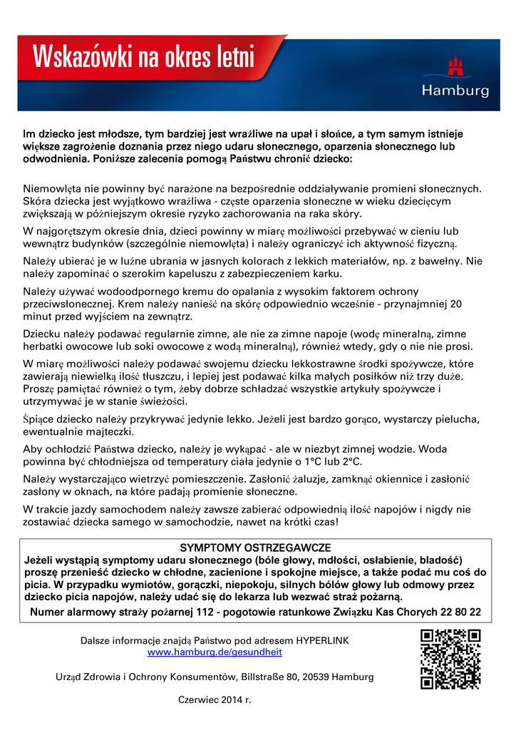 Wskazówki na okres letni Im dziecko jest młodsze, tym bardziej jest wrażliwe na upał i słońce, a tym samym istnieje większe zagrożenie doznania przez niego udaru słonecznego, oparzenia słonecznego lub odwodnienia. Poniższe zalecenia pomogą Państwu chronić dziecko: Niemowlęta nie powinny być narażone na bezpośrednie oddziaływanie promieni słonecznych. Skóra dziecka jest wyjątkowo wrażliwa - częste oparzenia słoneczne w wieku dziecięcym zwiększają w późniejszym okresie ryzyko zachorowania na raka skóry. W najgorętszym okresie dnia, dzieci powinny w miarę możliwości przebywać w cieniu lub wewnątrz budynków (szczególnie niemowlęta) i należy ograniczyć ich aktywność fizyczną. Należy ubierać je w luźne ubrania w jasnych kolorach z lekkich materiałów, np. z bawełny. Nie należy zapominać o szerokim kapeluszu z zabezpieczeniem karku. Należy używać wodoodpornego kremu do opalania z wysokim faktorem ochrony przeciwsłonecznej. Krem należy nanieść na skórę odpowiednio wcześnie - przynajmniej 20 minut przed wyjściem na zewnątrz. Dziecku należy podawać regularnie zimne, ale nie za zimne napoje (wodę mineralną, zimne herbatki owocowe lub soki owocowe z wodą mineralną), również wtedy, gdy o nie nie prosi. W miarę możliwości należy podawać swojemu dziecku lekkostrawne środki spożywcze, które zawierają niewielką ilość tłuszczu, i lepiej jest podawać kilka małych posiłków niż trzy duże. Proszę pamiętać również o tym, żeby dobrze schładzać wszystkie artykuły spożywcze i utrzymywać je w stanie świeżości. Śpiące dziecko należy przykrywać jedynie lekko. Jeżeli jest bardzo gorąco, wystarczy pielucha, ewentualnie majteczki. Aby ochłodzić Państwa dziecko, należy je wykąpać - ale w niezbyt zimnej wodzie. Woda powinna być chłodniejsza od temperatury ciała jedynie o 1°C lub 2°C. Należy wystarczająco wietrzyć pomieszczenie. Zasłonić żaluzje, zamknąć okiennice i zasłonić zasłony w oknach, na które padają promienie słoneczne. W trakcie jazdy samochodem należy zawsze zabierać odpowiednią ilość napojów i nigdy nie zostawiać dziecka samego w samochodzie, nawet na krótki czas! SYMPTOMY OSTRZEGAWCZE Jeżeli wystąpią symptomy udaru słonecznego (bóle głowy, mdłości, osłabienie, bladość) proszę przenieść dziecko w chłodne, zacienione i spokojne miejsce, a także podać mu coś do picia. W przypadku wymiotów, gorączki, niepokoju, silnych bólów głowy lub odmowy przez dziecko picia napojów, należy udać się do lekarza lub wezwać straż pożarną. Numer alarmowy straży pożarnej 112 - pogotowie ratunkowe Związku Kas Chorych 22 80 22 Dalsze informacje znajdą Państwo pod adresem HYPERLINK www.hamburg.de/gesundheit Urząd Zdrowia i Ochrony Konsumentów, Billstraße 80, 20539 Hamburg Czerwiec 2014 r.